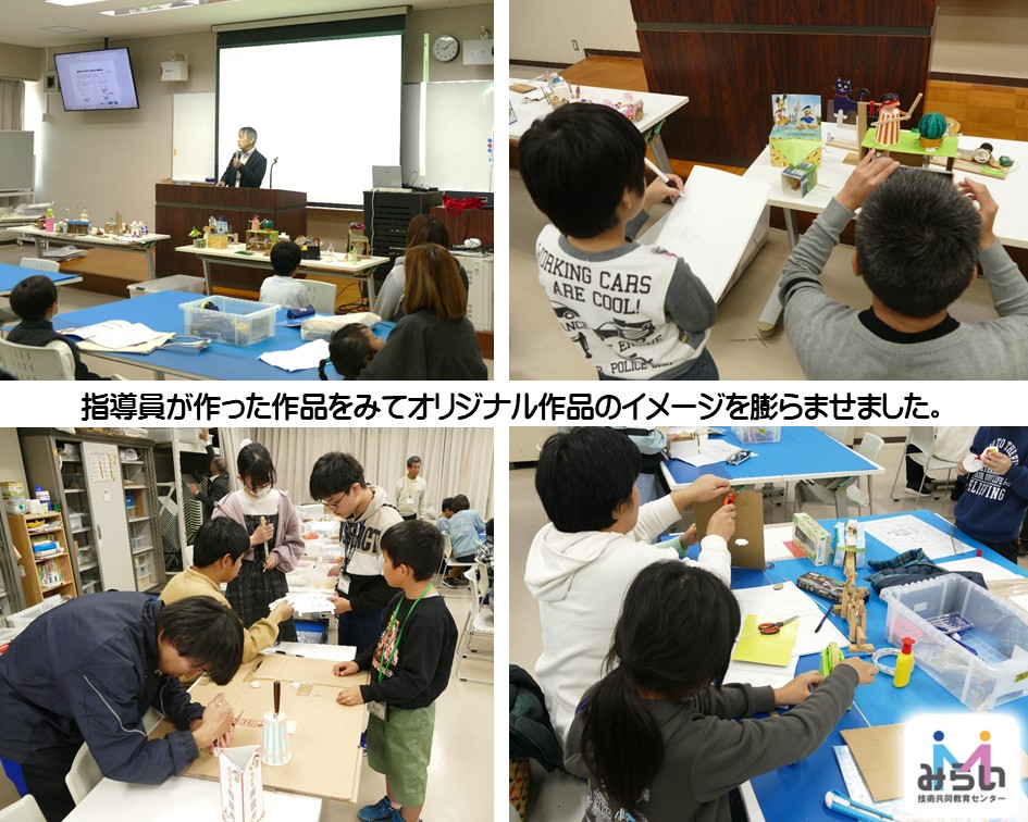その後、指導員が作ったからくり作品例をじっくり見て、自分の好きな「からくり」のアイデアや設計図をノートに書き込んだり、簡易のキットを使って試しに作ってみたりしました。オリジナル作品のイメージを膨らませることができました。