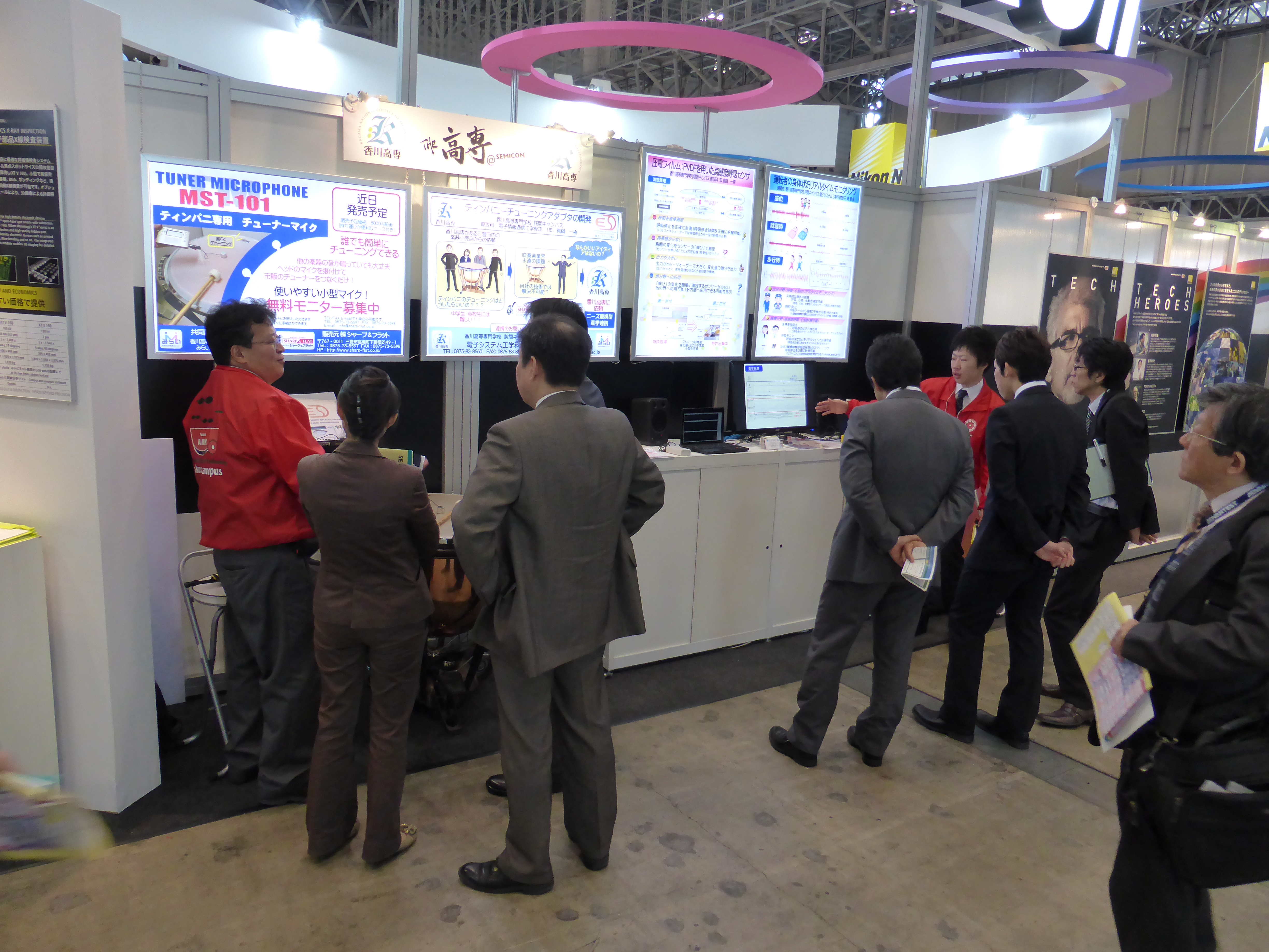 SEMI協力プログラム「The高専@セミコン」はセミコン・ジャパン2013に出展している自社出展ブース内に特設ブースを設け、高等専門学校等の学生へ研究発表の場を提供し、学生に半導体業界に対する理解を深めてもらうとともに、高専生の若きエンジニアによるアイディアにあふれた技術や研究成果が展示される企画です。香川高専詫間キャンパスは㈱ニコン出展ブース内で「ティンパニ-チューニングアダプタの開発」、 「ティンパニ専用チューニングマイク」 、「圧電フィルムを用いた高感度呼吸モニタ」、「運転者の身体状況リアルタイムモニタリング」を展示・シーズ紹介しました。