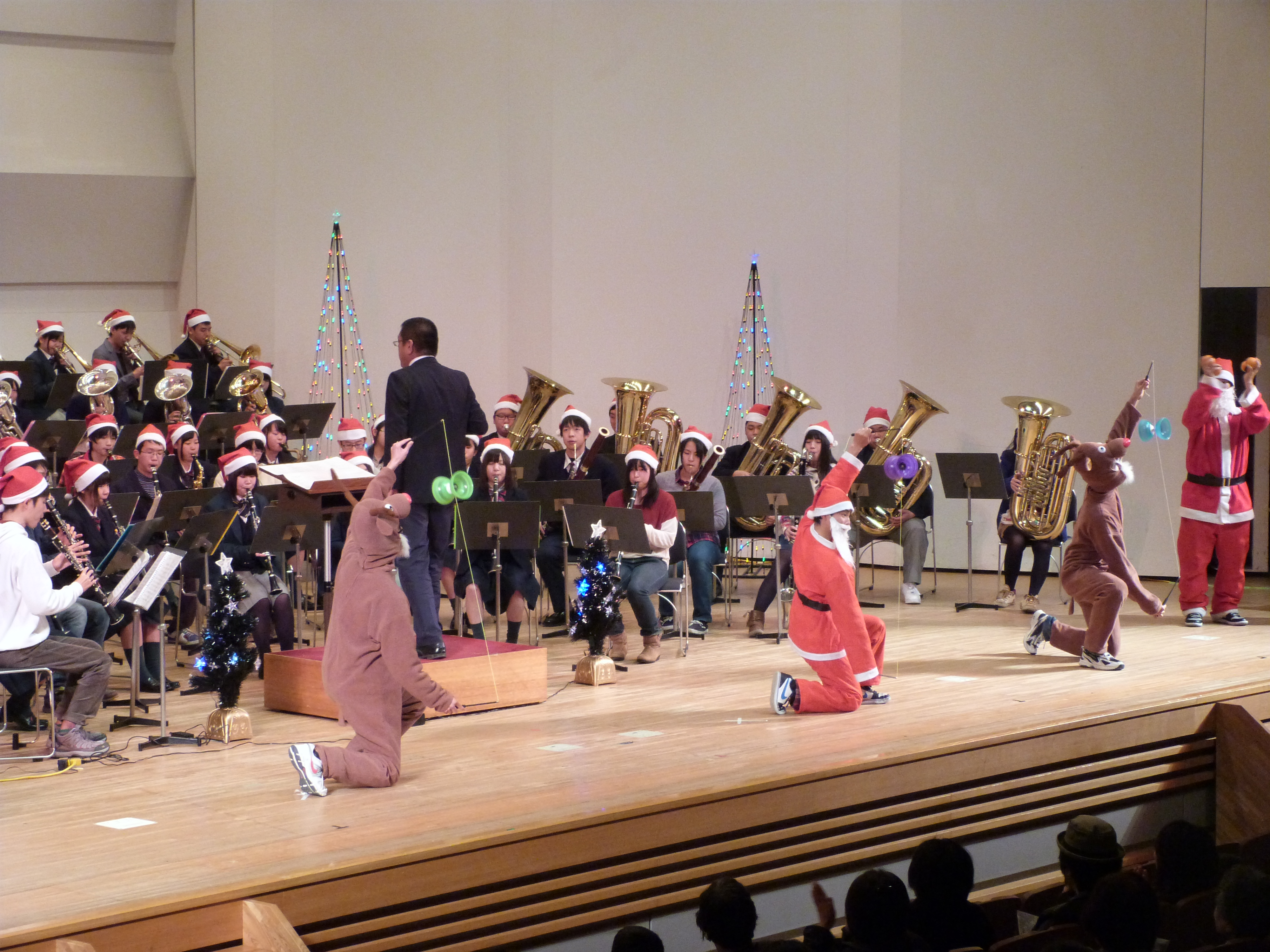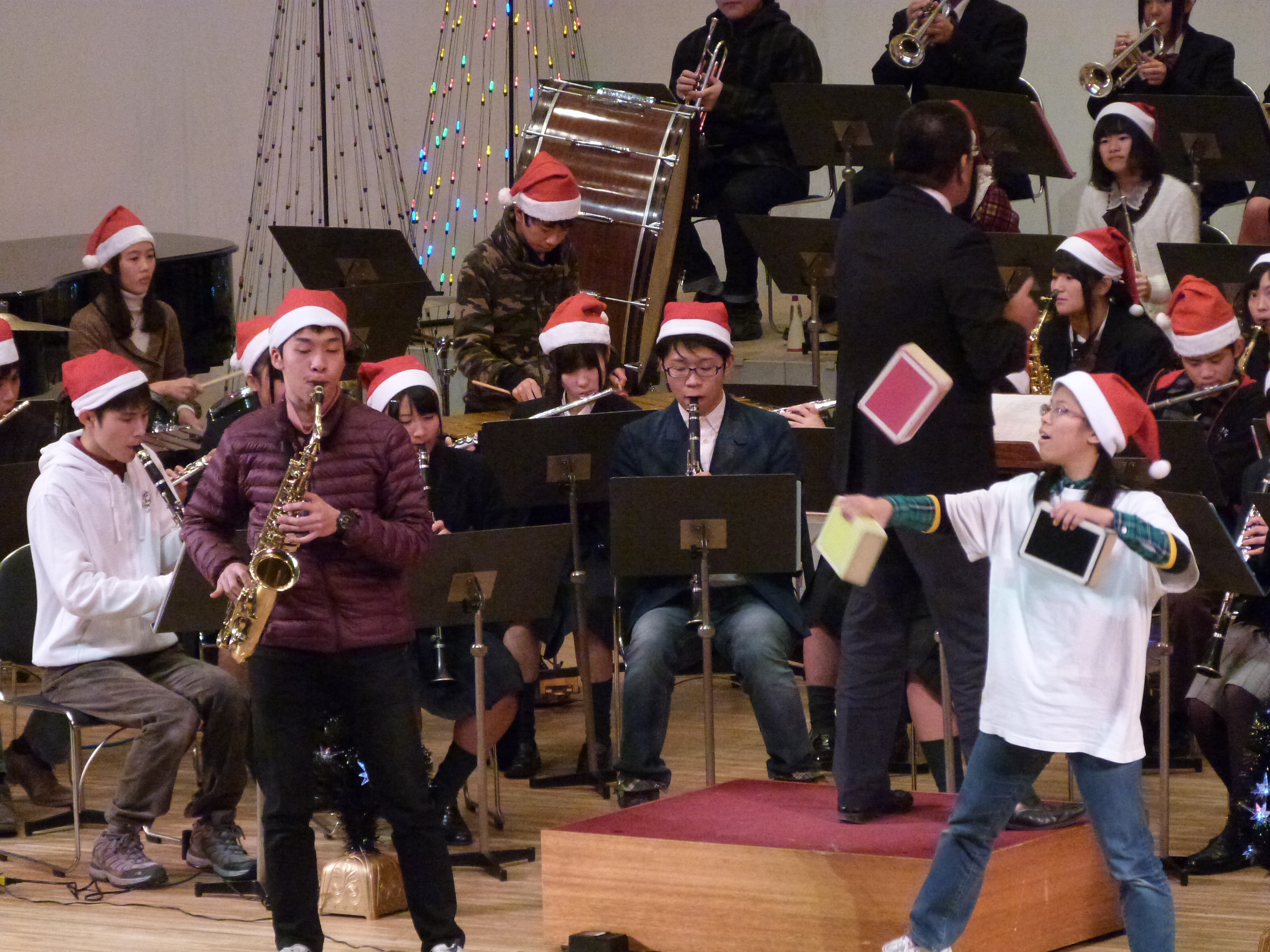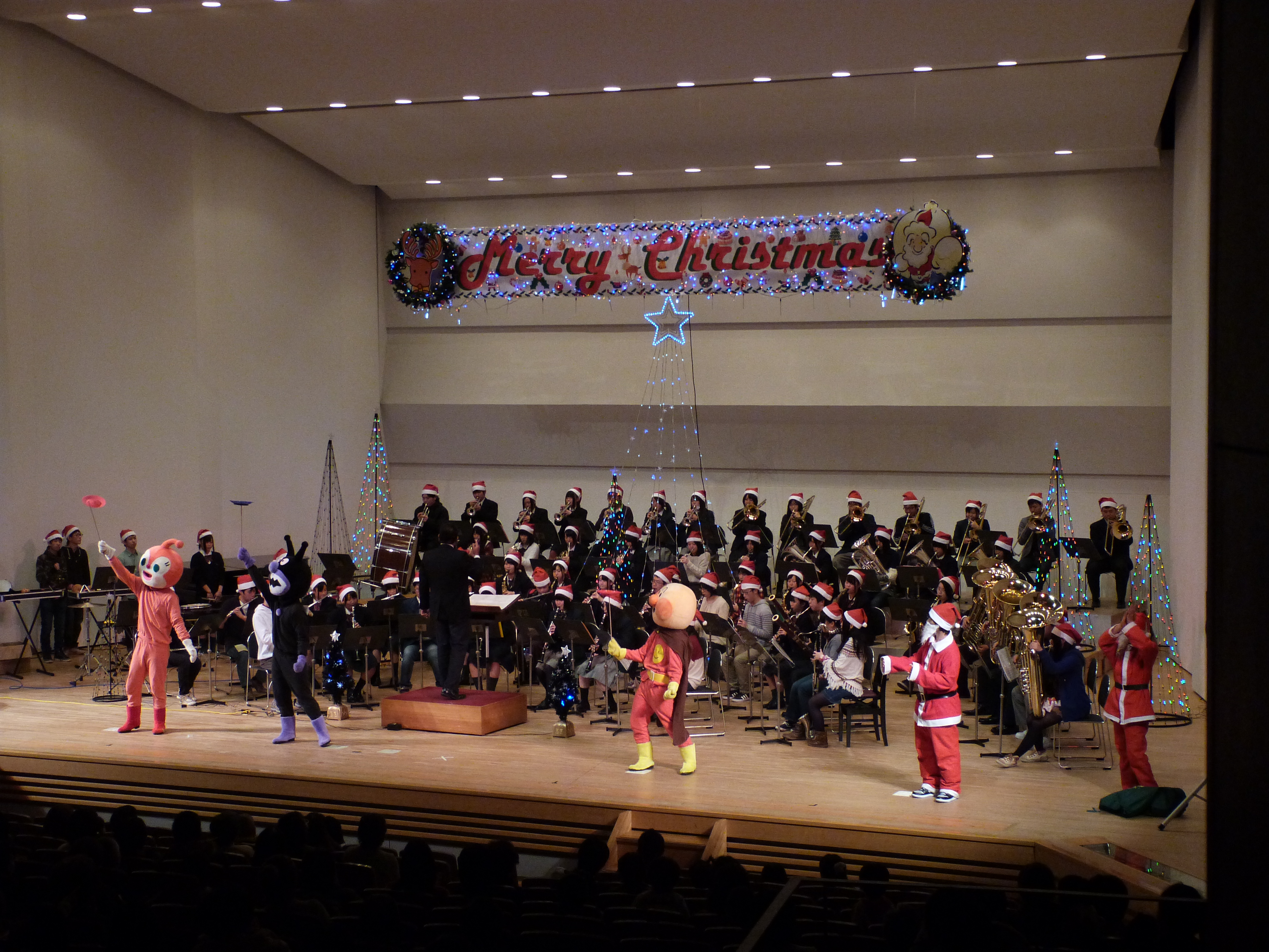 12月23日(月・祝)、三豊市文化会館マリンウェーブにおいて、毎年恒例となった三豊市と観音寺法人会三豊支部が主催する「クリスマスコンサート2013」が開催され、詫間キャンパス吹奏楽部、SPOT、演劇同好会、TEAM ARKの学生が参加しました。
