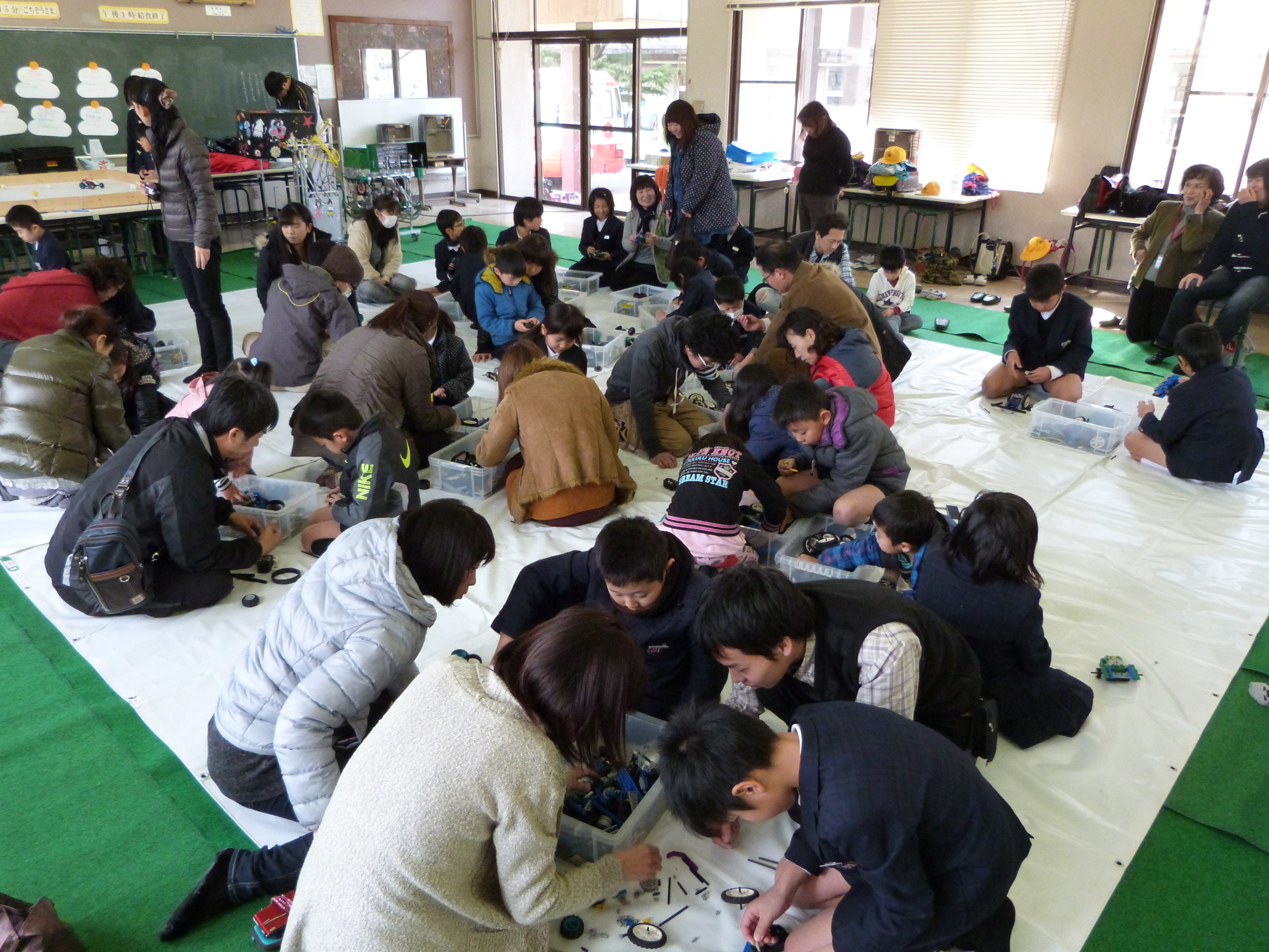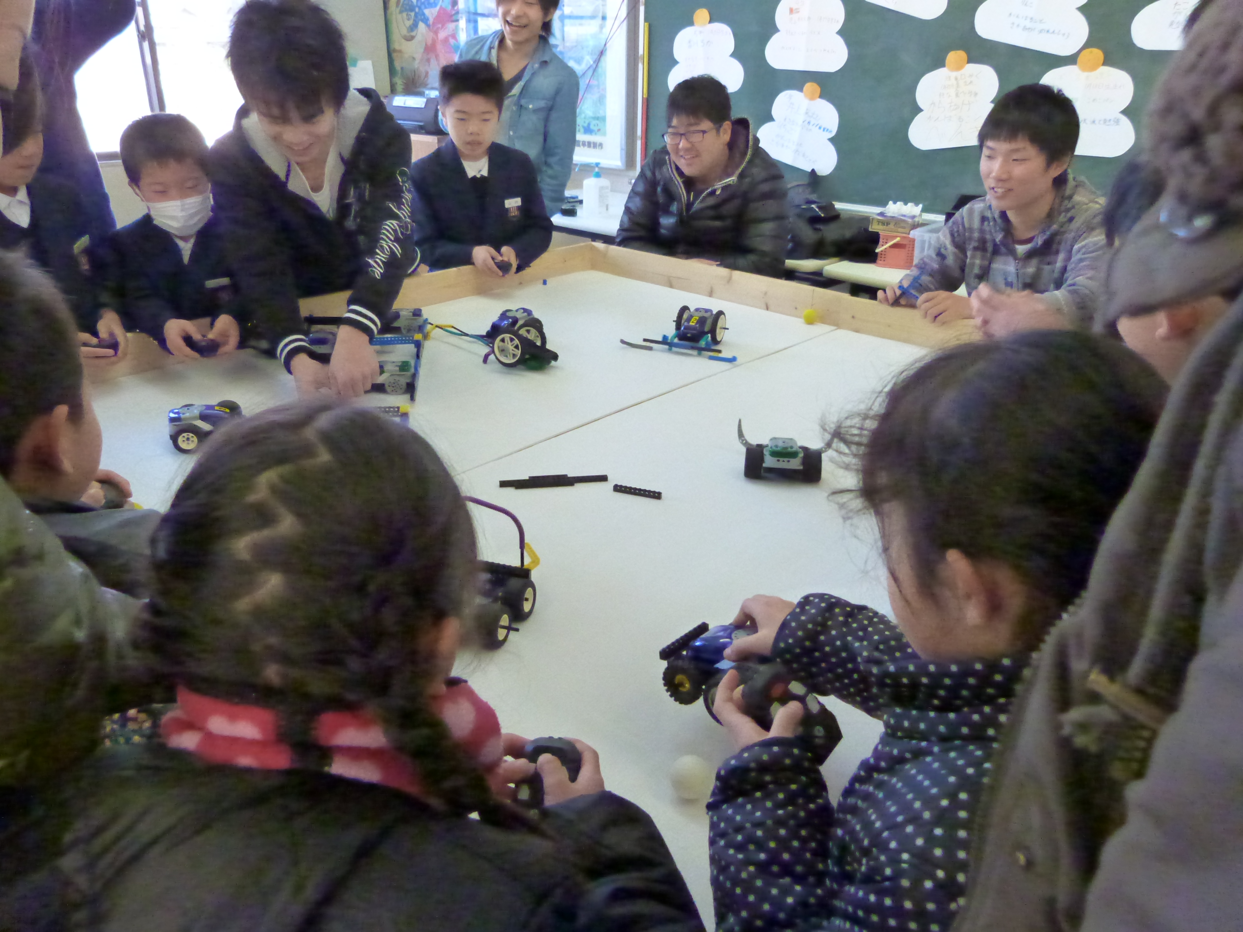 この催しは比地小学校の年間行事として開催されたもので、いろいろ準備された体験活動の中から「簡単ロボット教室」を希望した子ども達に体験して頂きました。レゴブロックと本体を組み合わせて作ったMyロボットを赤外線リモコンで自由に操作するだけでなく、 Myロボットを使ってロボット対決も行い大変盛り上がりました。「簡単ロボット教室」に参加した子ども達の保護者の皆様にも参加いただき、親子で熱心にレゴブロックでMyロボットを作り、楽しんでいただけたと思います。