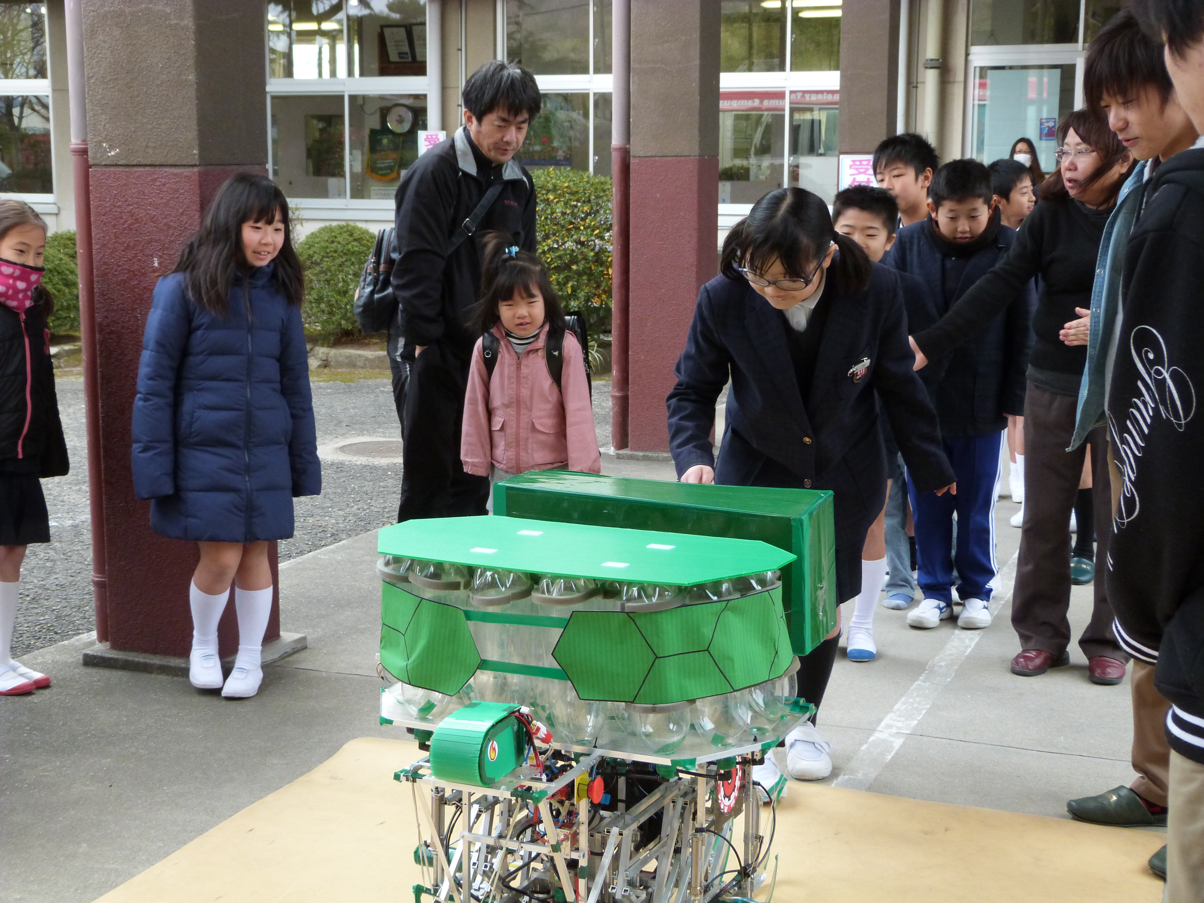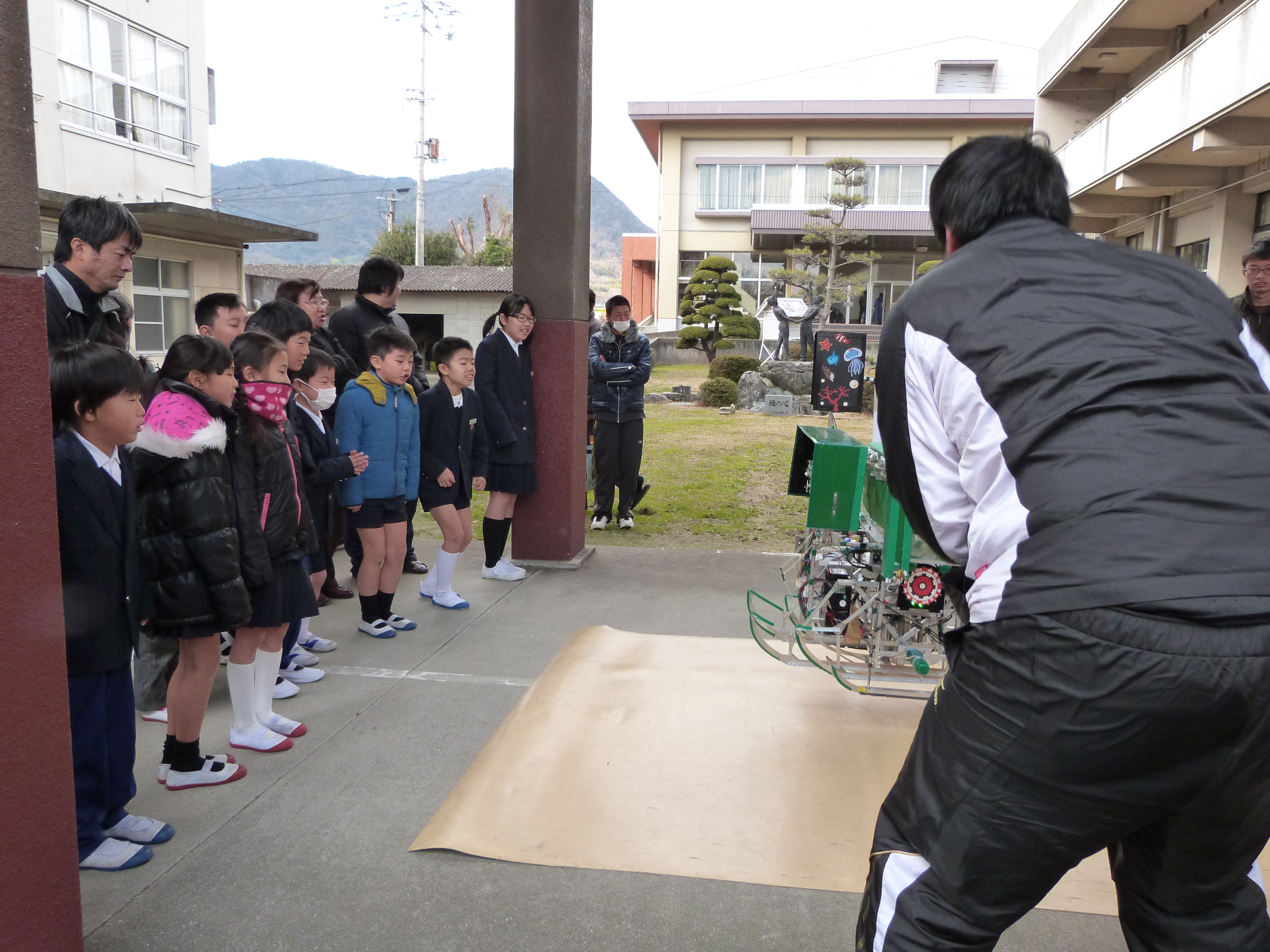 1月19日(日)、三豊市立比地小学校にて開催された「地域ふれあい活動」において、詫間キャンパスロボコンチーム「TEAM ARK」の学生が「簡単ロボット教室」と「高専ロボコン出場ロボットのデモンストレーション・操作体験」を行いました。