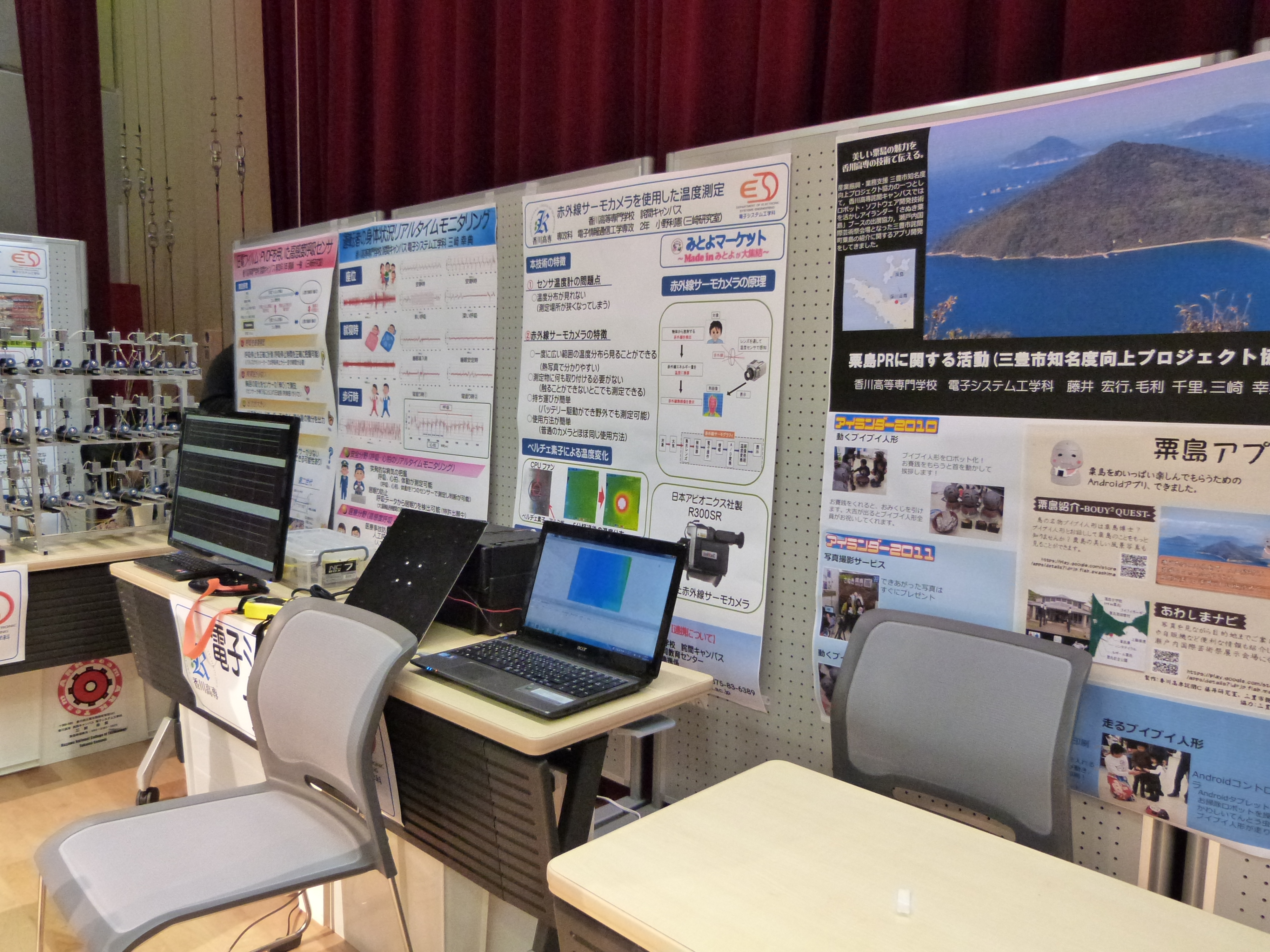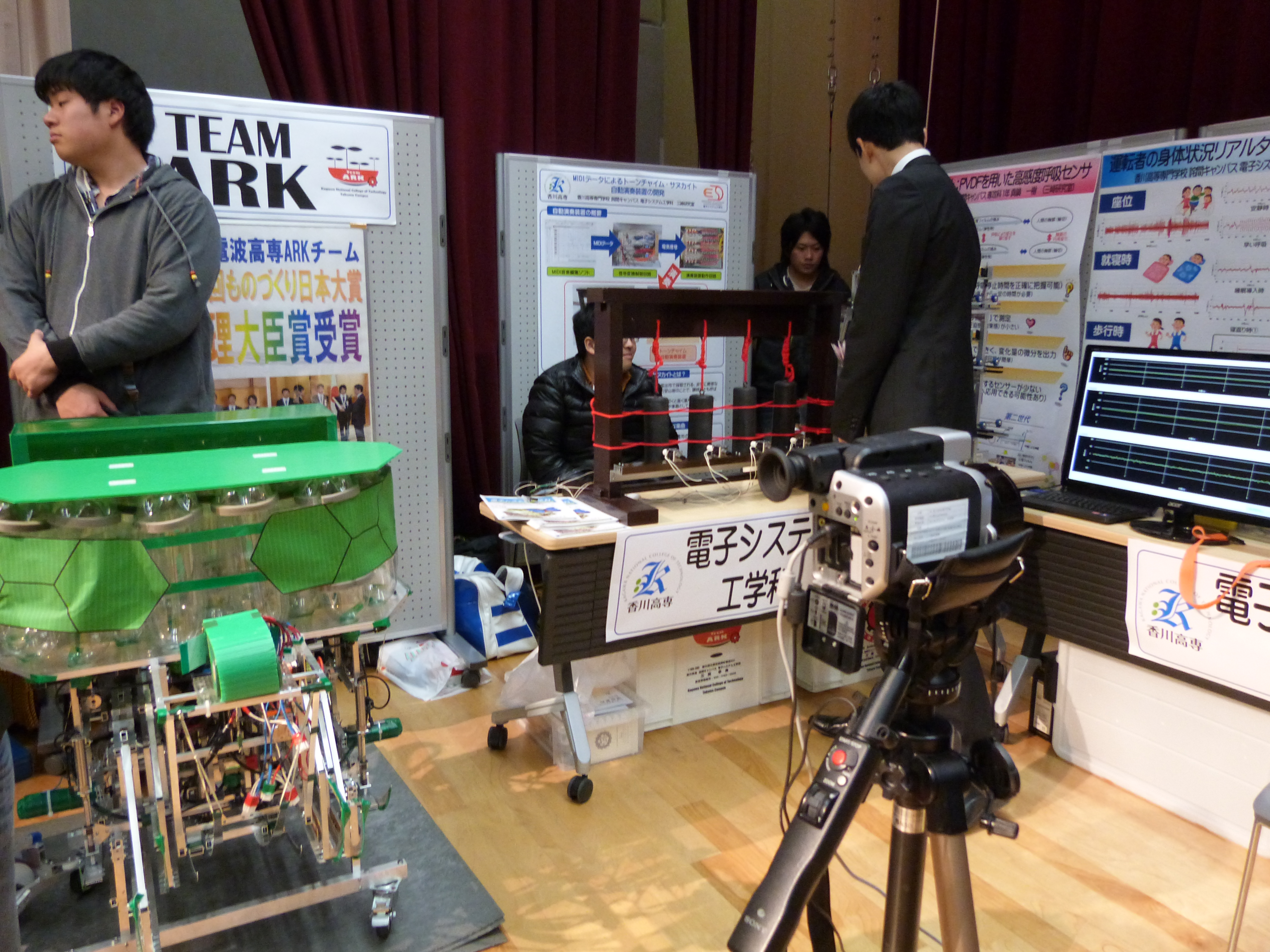 当日は三豊市内の企業をはじめ多数の企業が出展する中、香川高専詫間キャンパスからトーンチャイム自動演奏装置、香川高専におけるPM2.5測定、放射線測定装置、プログラミングコンテスト優秀賞受賞作品、高専ロボコン2013のロボット展示を行いました。