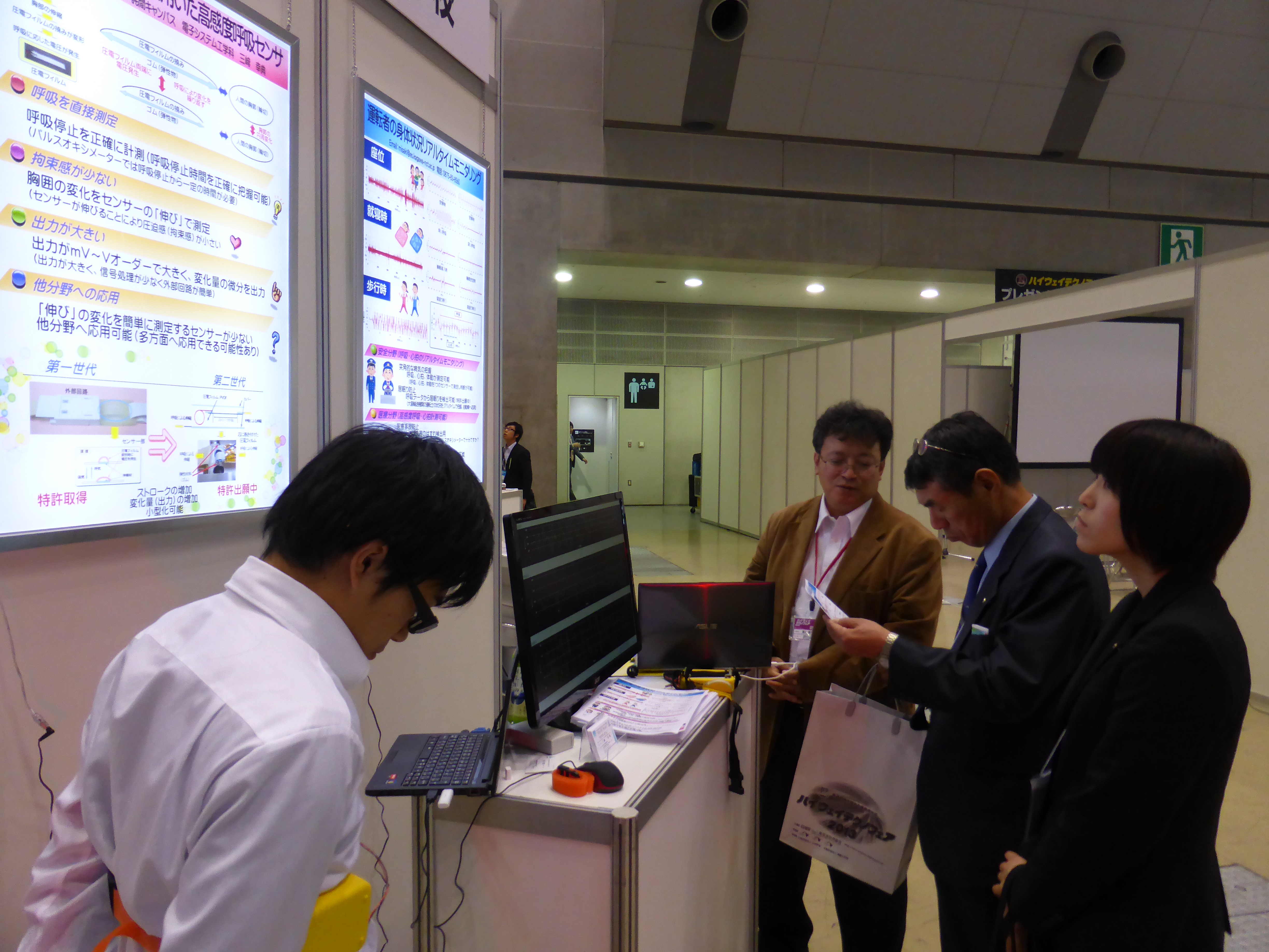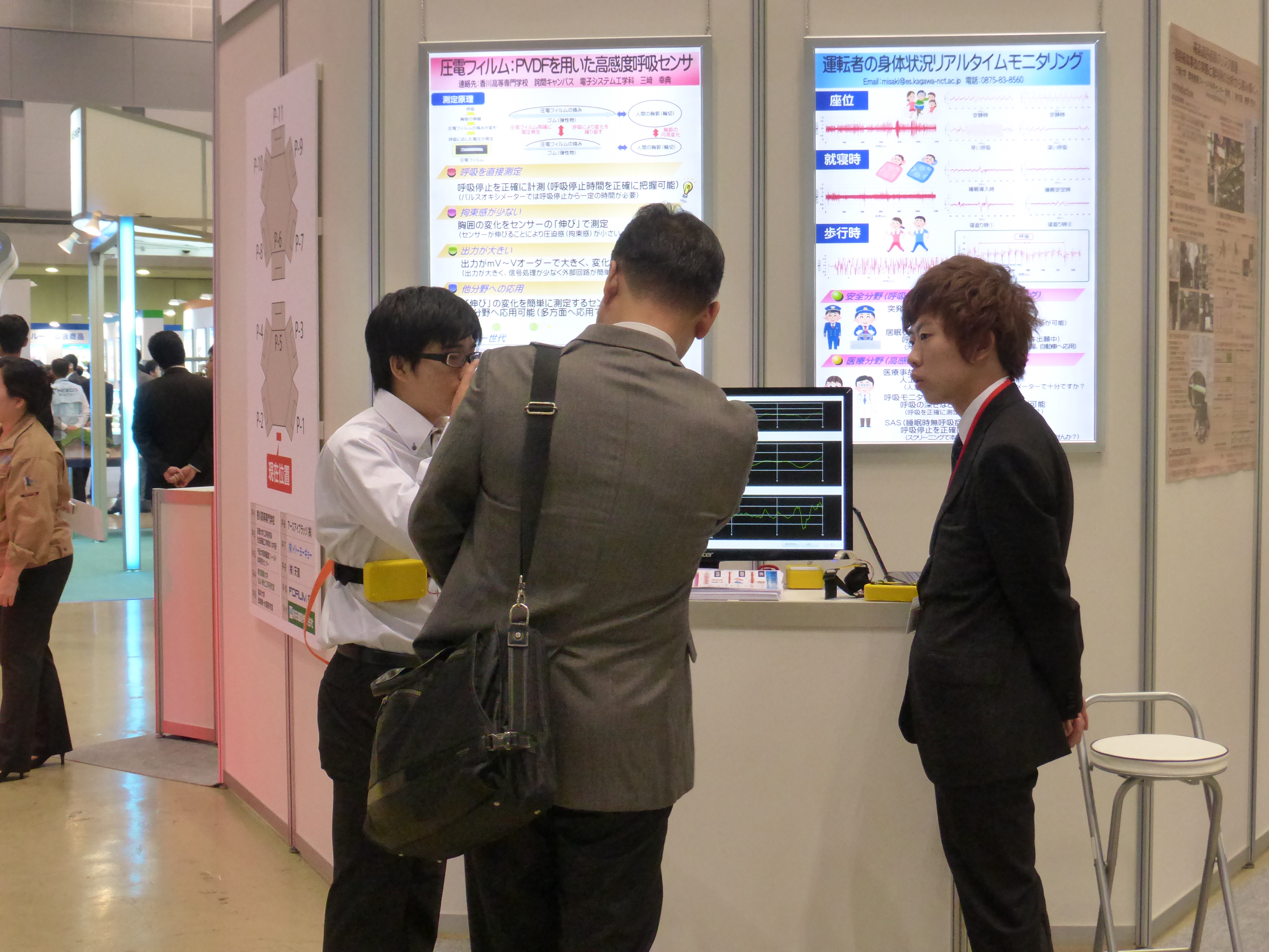 パネル展示コーナーに出展した本校は、「圧電フィルム:PVDFを用いた高感度呼吸センサ」、「運転者の身体状況リアルタイムモニタリング」の2つのテーマについて成果を発表しました。