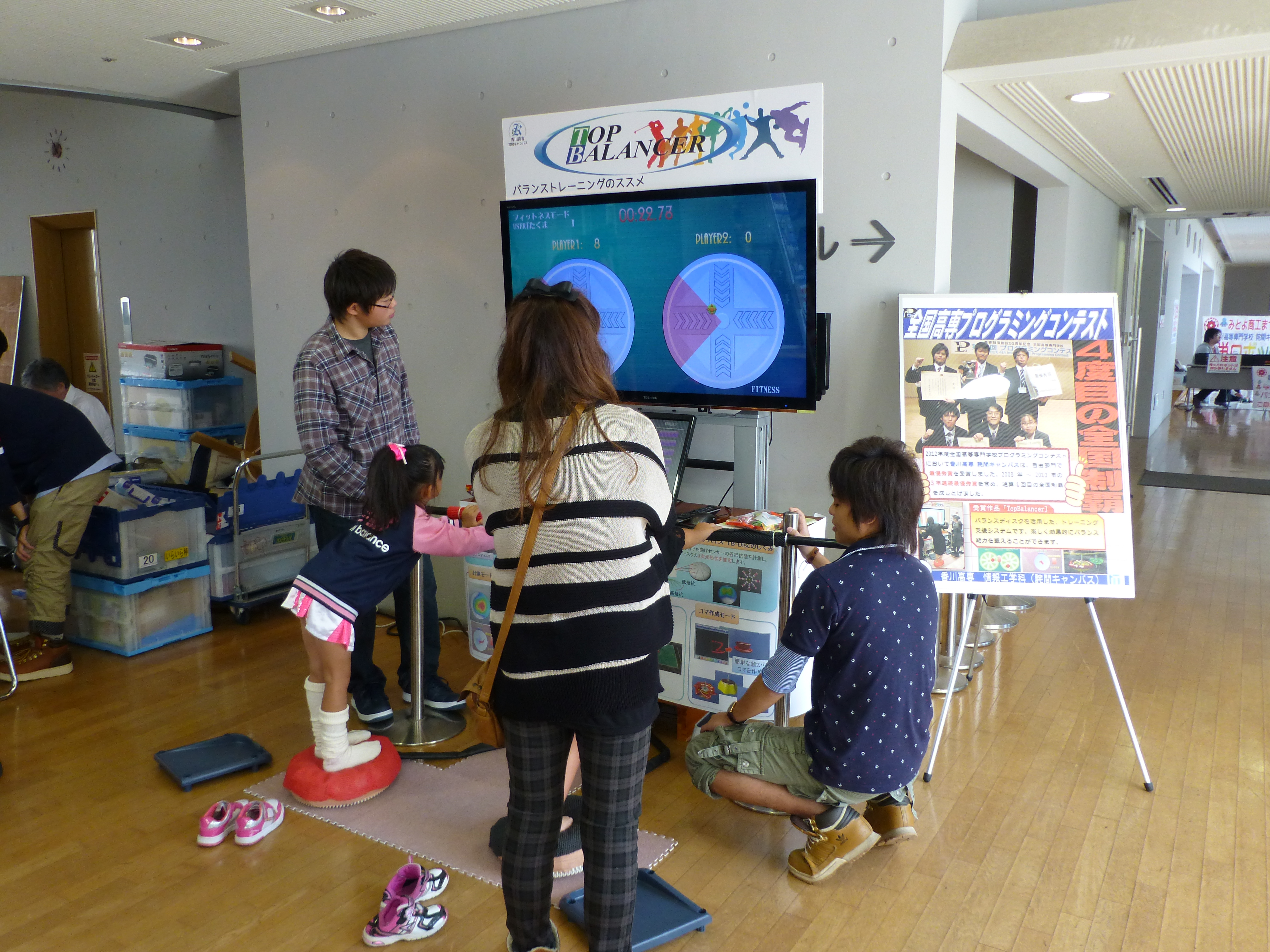 この日は「高専プログラミングコンテスト」で通算4度目の最優秀賞を獲得したばかりのバランスゲーム「TOP BALANCER」を体験していただいた他、学生が製作した様々な実験やゲーム、簡単ロボット「レゴスパイボット」や造形ブロック「カプラ」で遊んでいただきました。