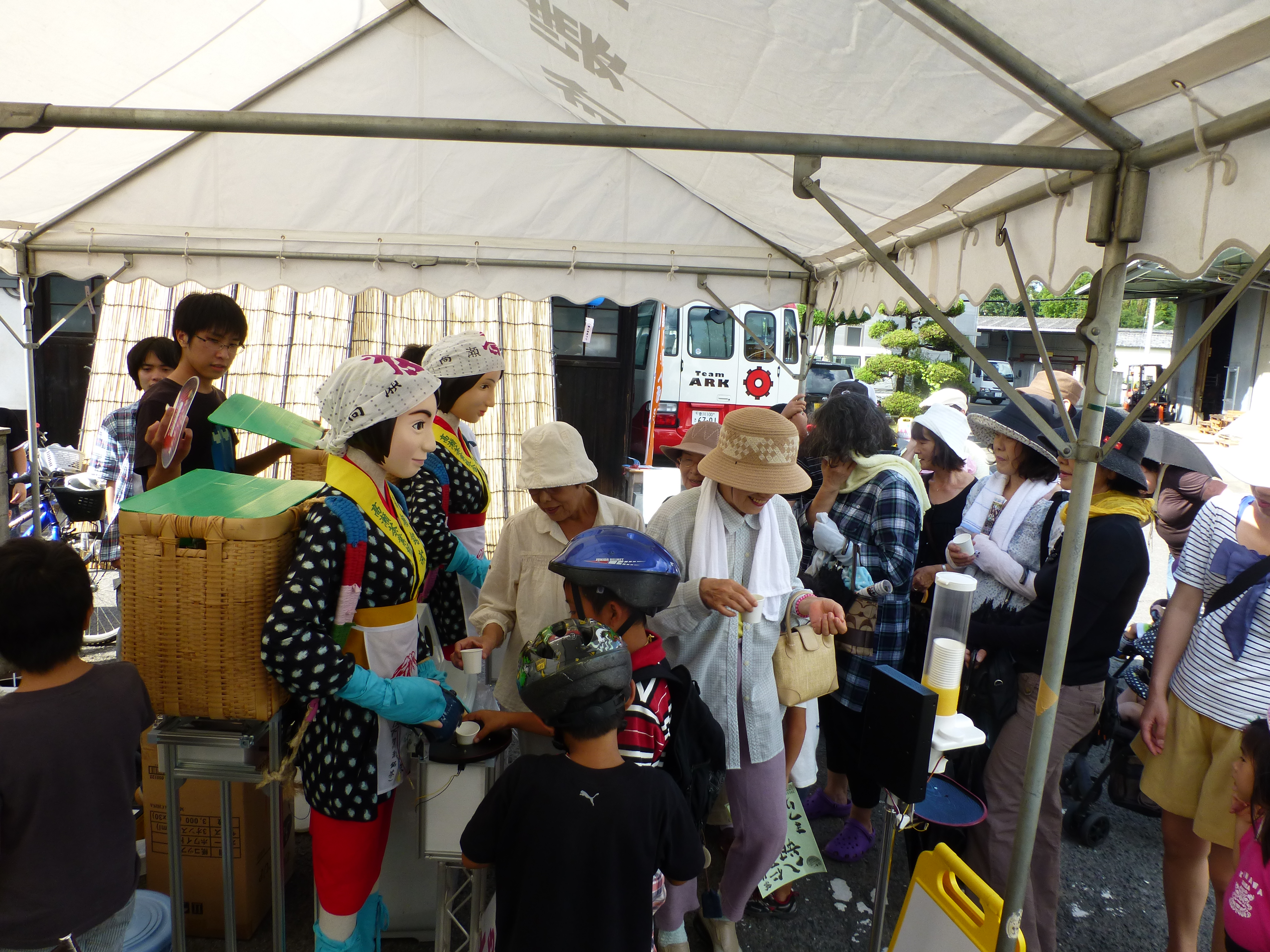 詫間キャンパスでは、三豊市と連携して製作し、現在も学生が改良を続けている高瀬銘茶サービスロボット「みっちゃん・とよさん」の冷茶サービスを行いました。高瀬の茶摘み風景を背景に、みっちゃん・とよさんが持っているお盆に紙コップを置くと自動でお茶が注がれる様子は毎回喜んでいただいており、今年も行列のできる人気ぶりでした。また、手をかざすと紙コップが出てくる装置も製作し、より楽しいサービスが提供できました。