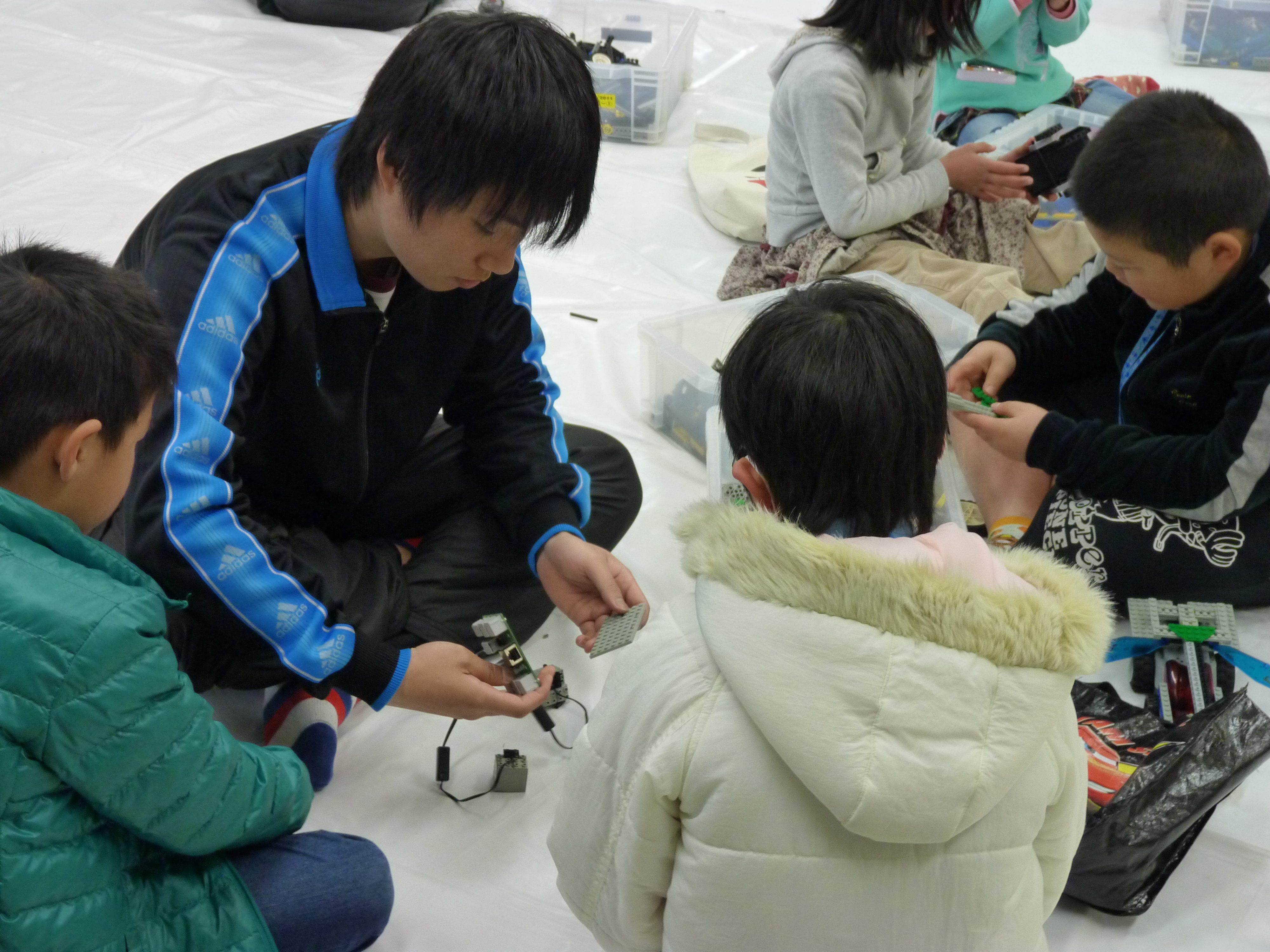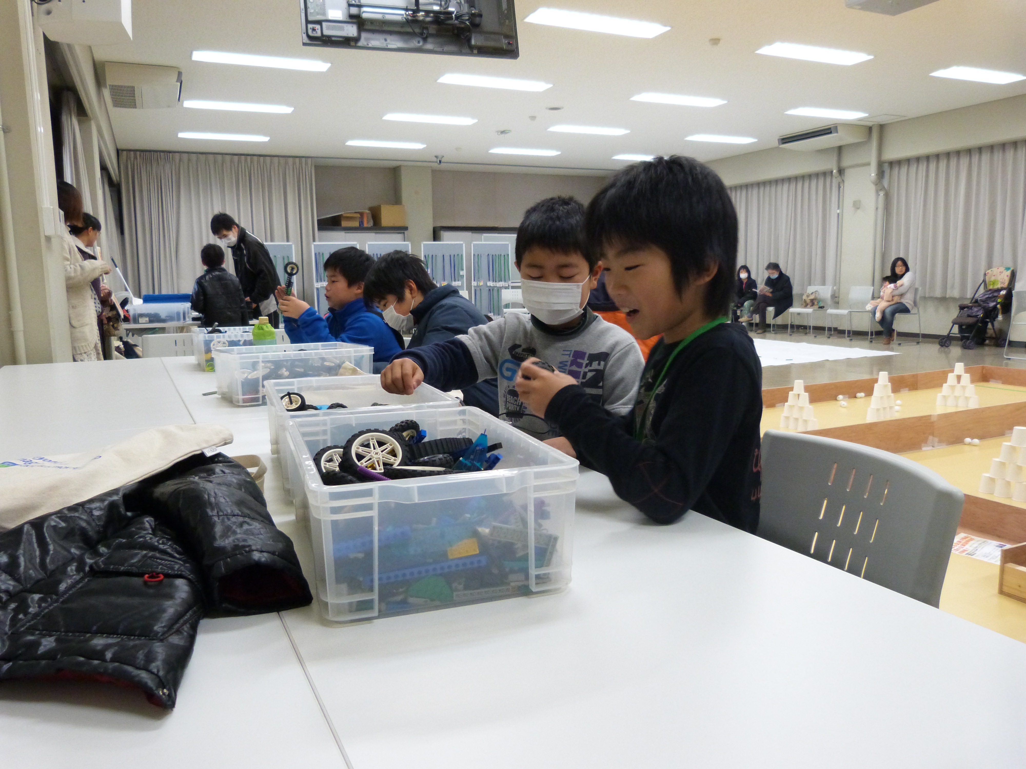 今年度の活動も終盤に差し掛かり、1年間の総まとめとしてARKの学生が考案したミニロボコンを楽しみました。フィールド上には積み上げた紙コップとピンポン球があり、スパイボット、ワイヤードリモコンのどちらかを使用して作ったロボットで、決められたゴールにそれらを運んで得た得点を競いました。制限時間を設けたチーム戦は本格的で、最初はエントリーをためらっていた子ども達も、最後にはみんなで参加して盛り上がりました。