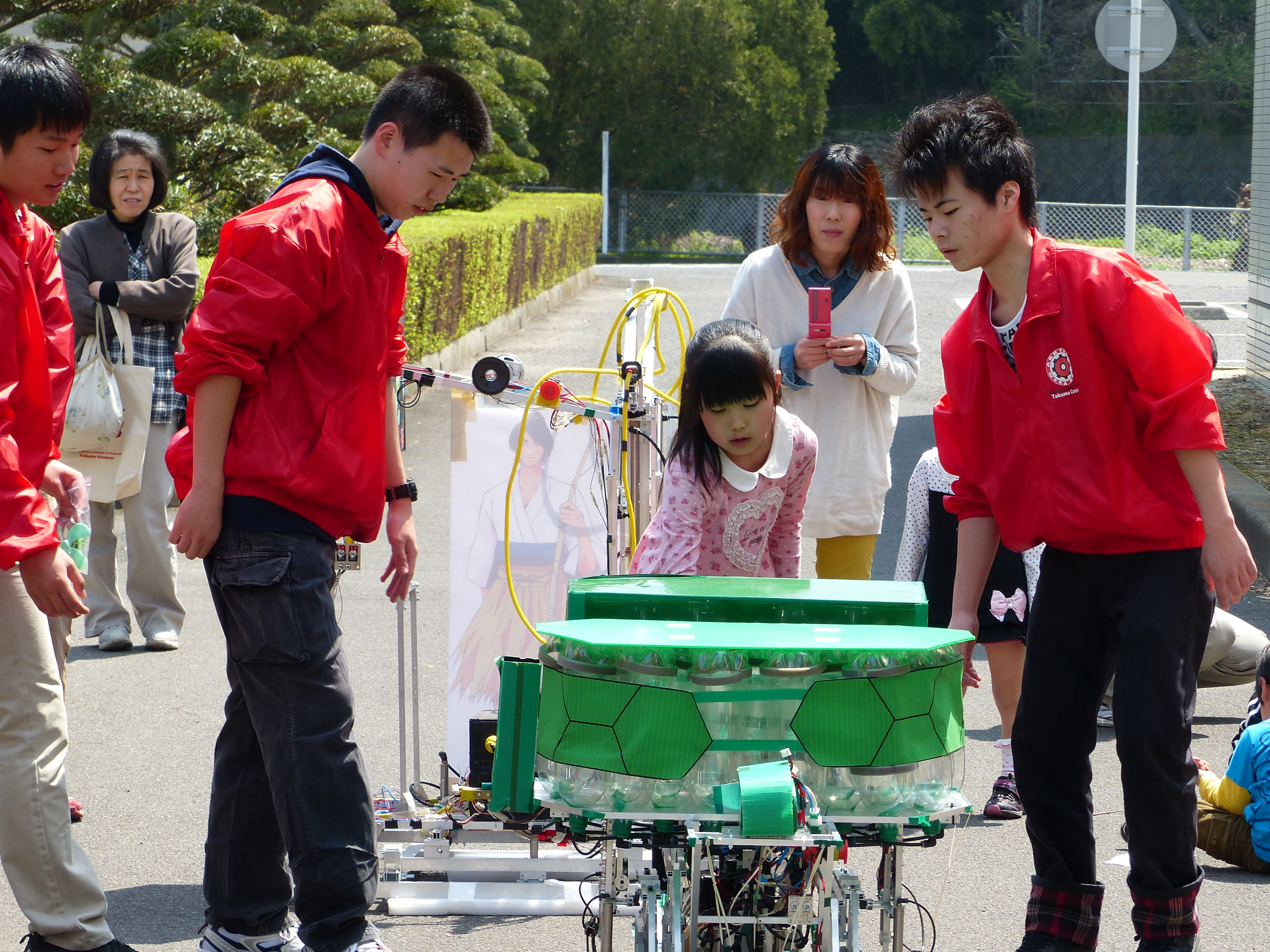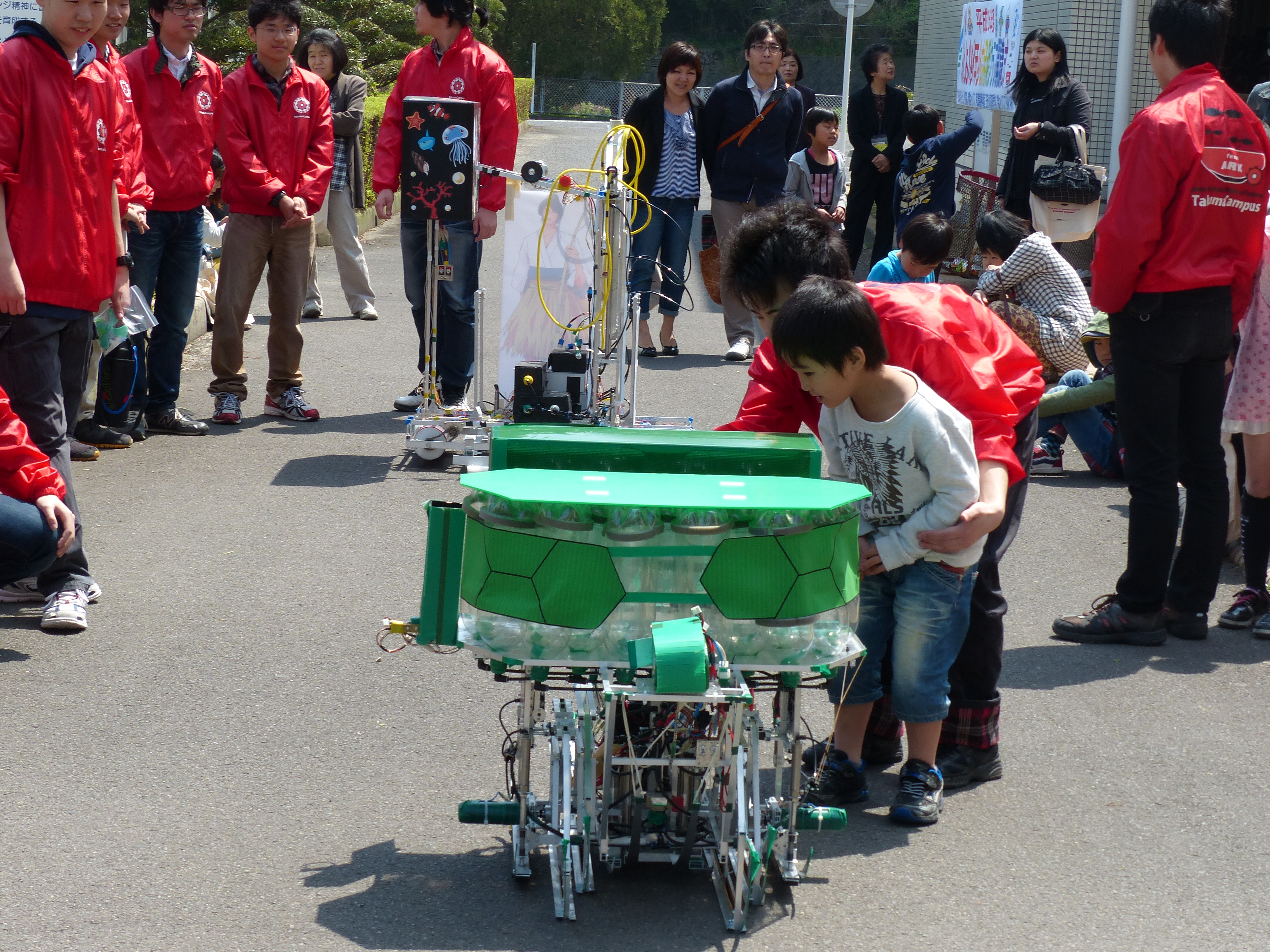 最後に、昨年高専ロボコン全国大会に出場したロボットの実演と操縦体験を行いました。特に操縦体験は大変な人気で、TEAM ARKの学生が一人ずつサポートしながら一緒にロボットを動かして楽しみました。