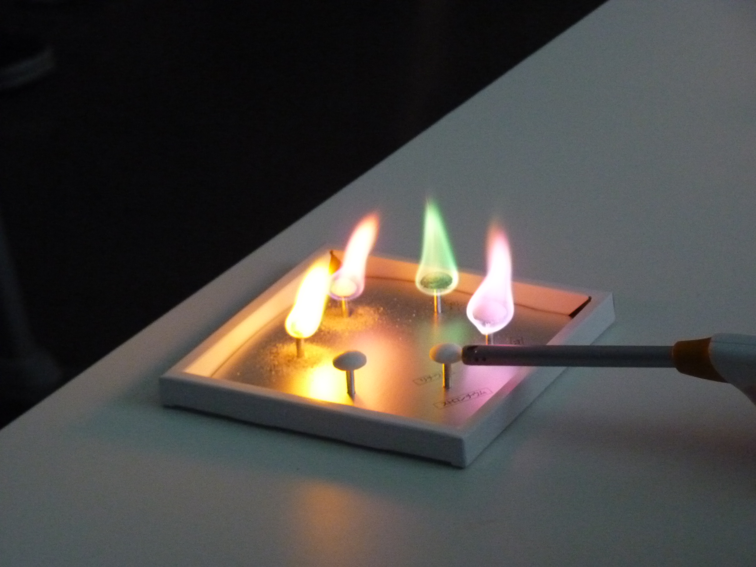 はじめにクロマトグラフィーを用いた実験をしました。黒いインクの付いた紙の下方を水に付けて待つと、紙が水を吸い上げながら疎水性や吸着力の異なる色が分離され、黒を作る基となった数色の色が層になって現れました。次に、高分子吸収剤で色付き水を固めたり、塩を使って液体に戻し、その仕組みを知る実験、アンモニアの水溶性を利用した噴水実験、花火に用いられる数種類の物質を燃やして炎の色の違いを観察する実験、蛍光剤を用いて色が発光する現象の観察・・・とたくさんの実験や観察ができました。