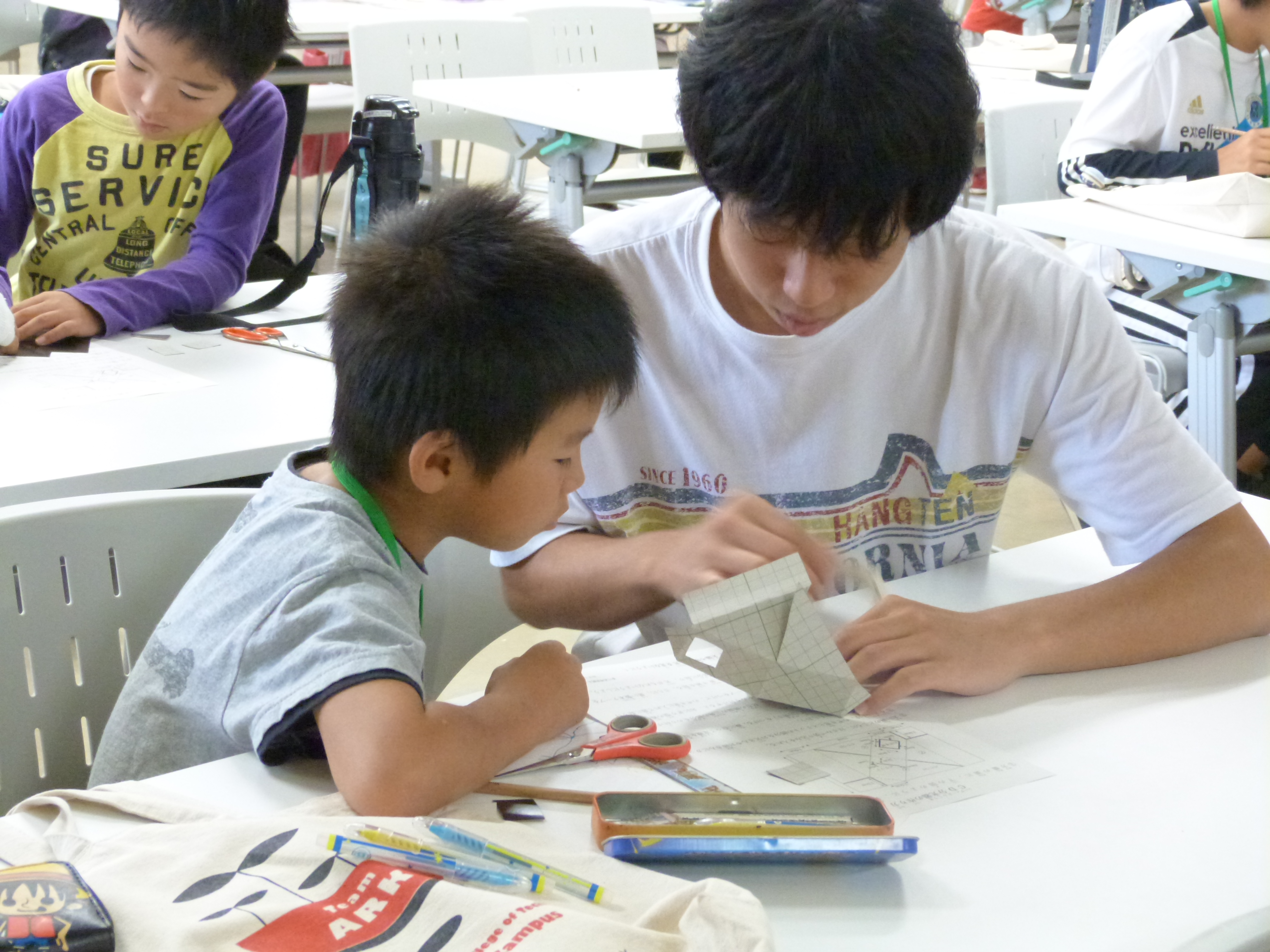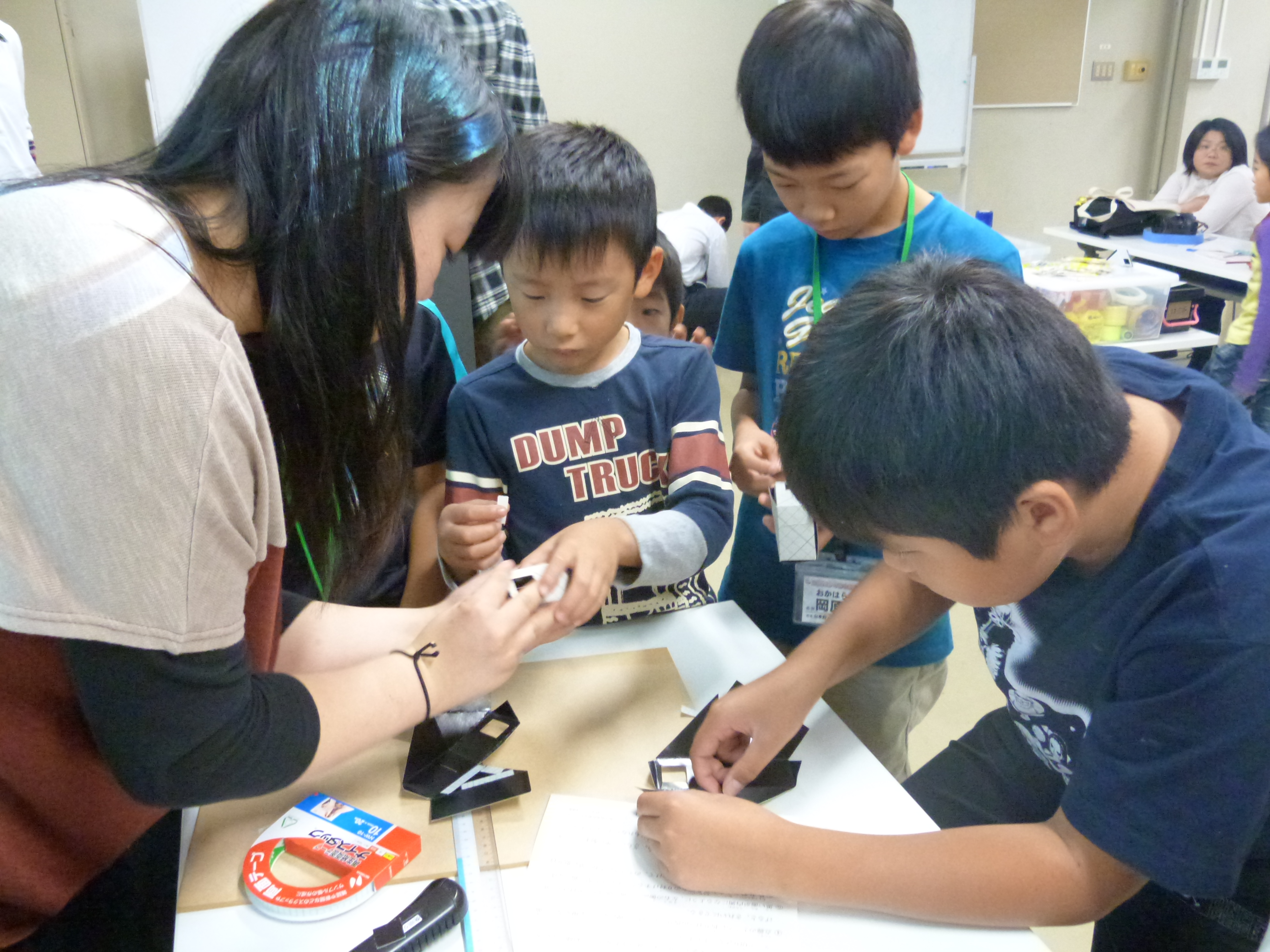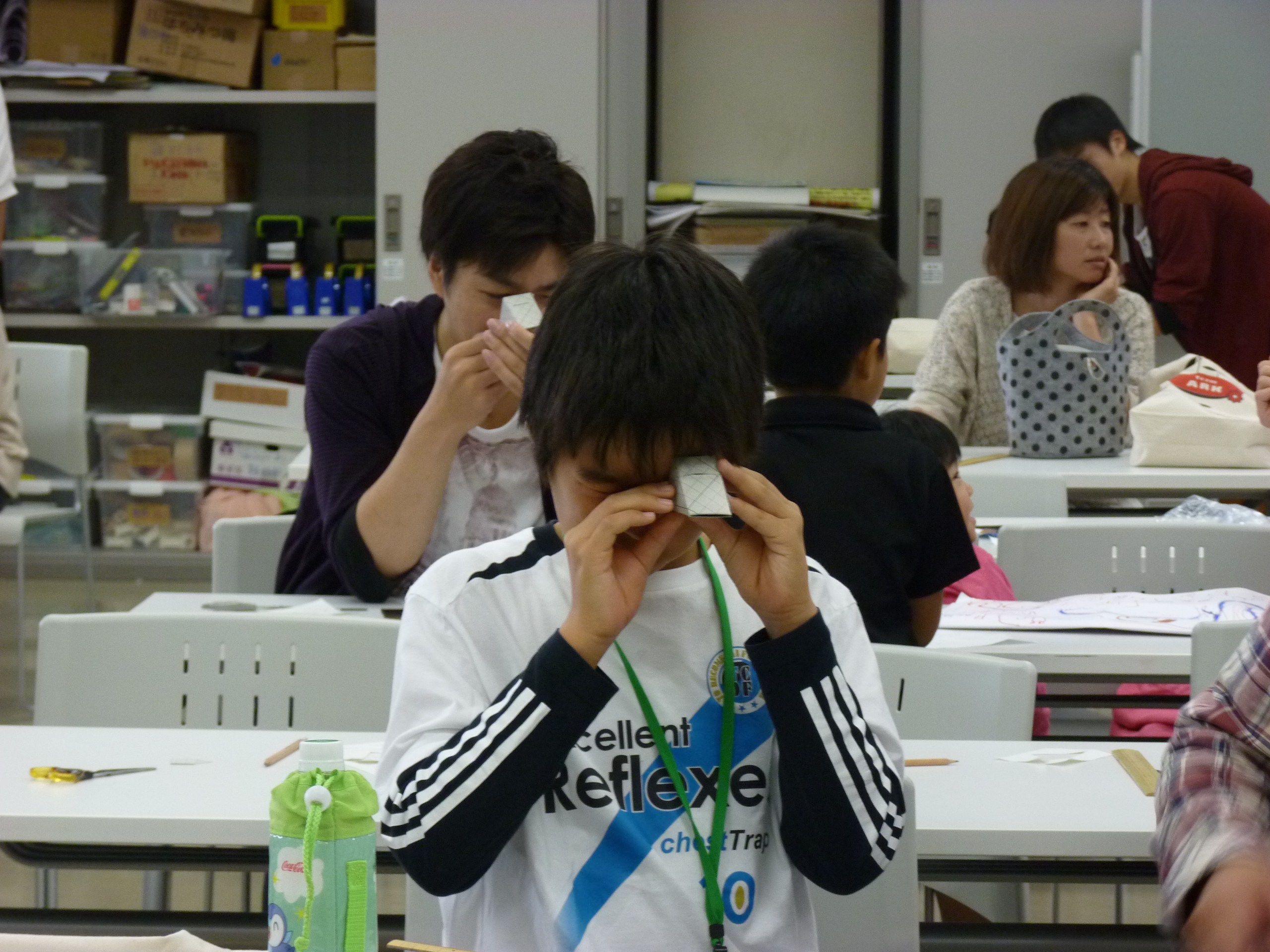 最後に、廃材のCD-ROMと厚紙で「CD分光器」を手作りしました。DEXの学生に教わりながら、一人ひとつずつ、手作りの分光器が完成すると、子供達は蛍光灯や外の光を観察し、光の見え方が変わると「あ、変わった!ほら、見てみて!」と友達や保護者の方と一緒に分光器を覗いて楽しんでいました。