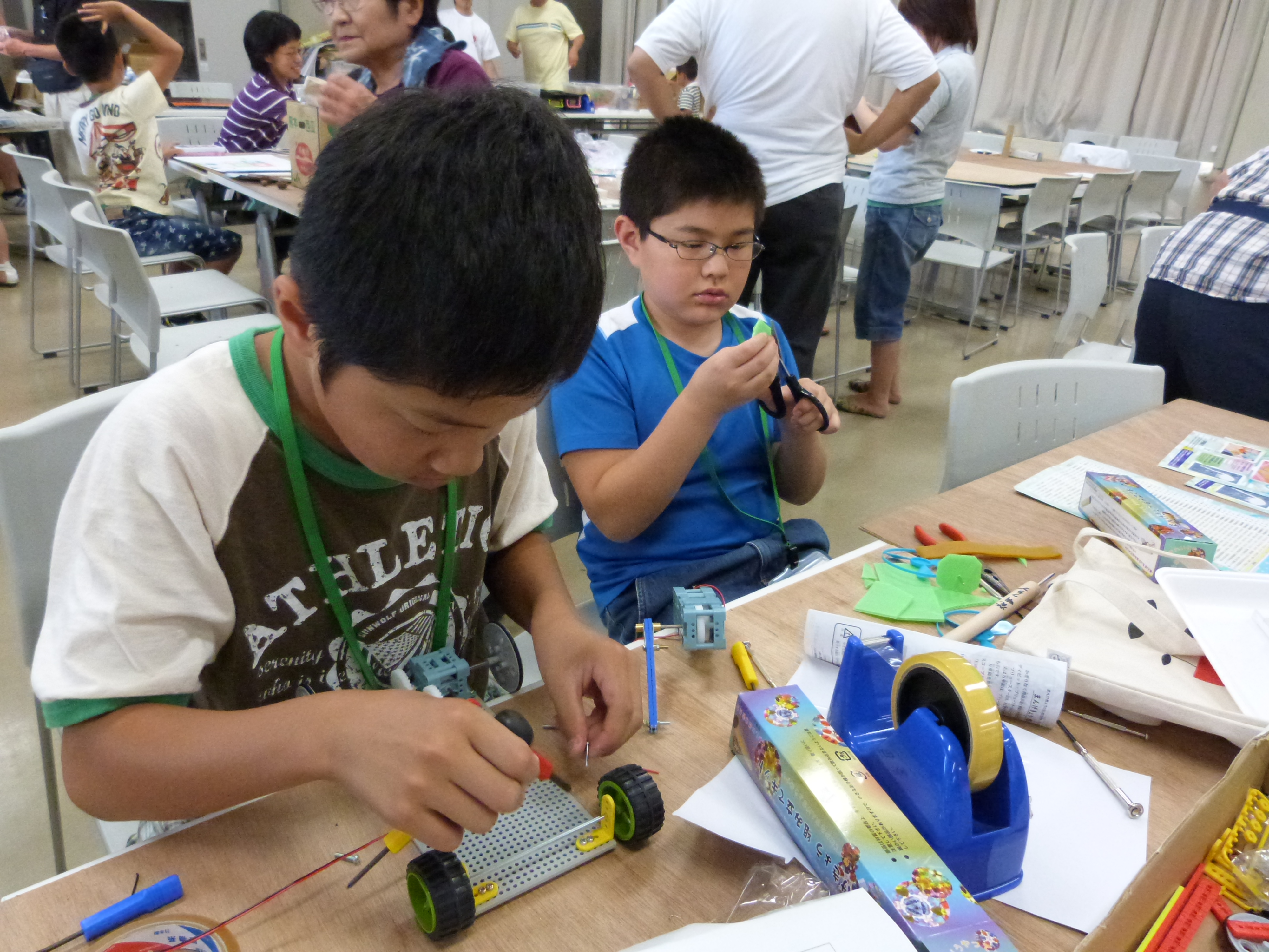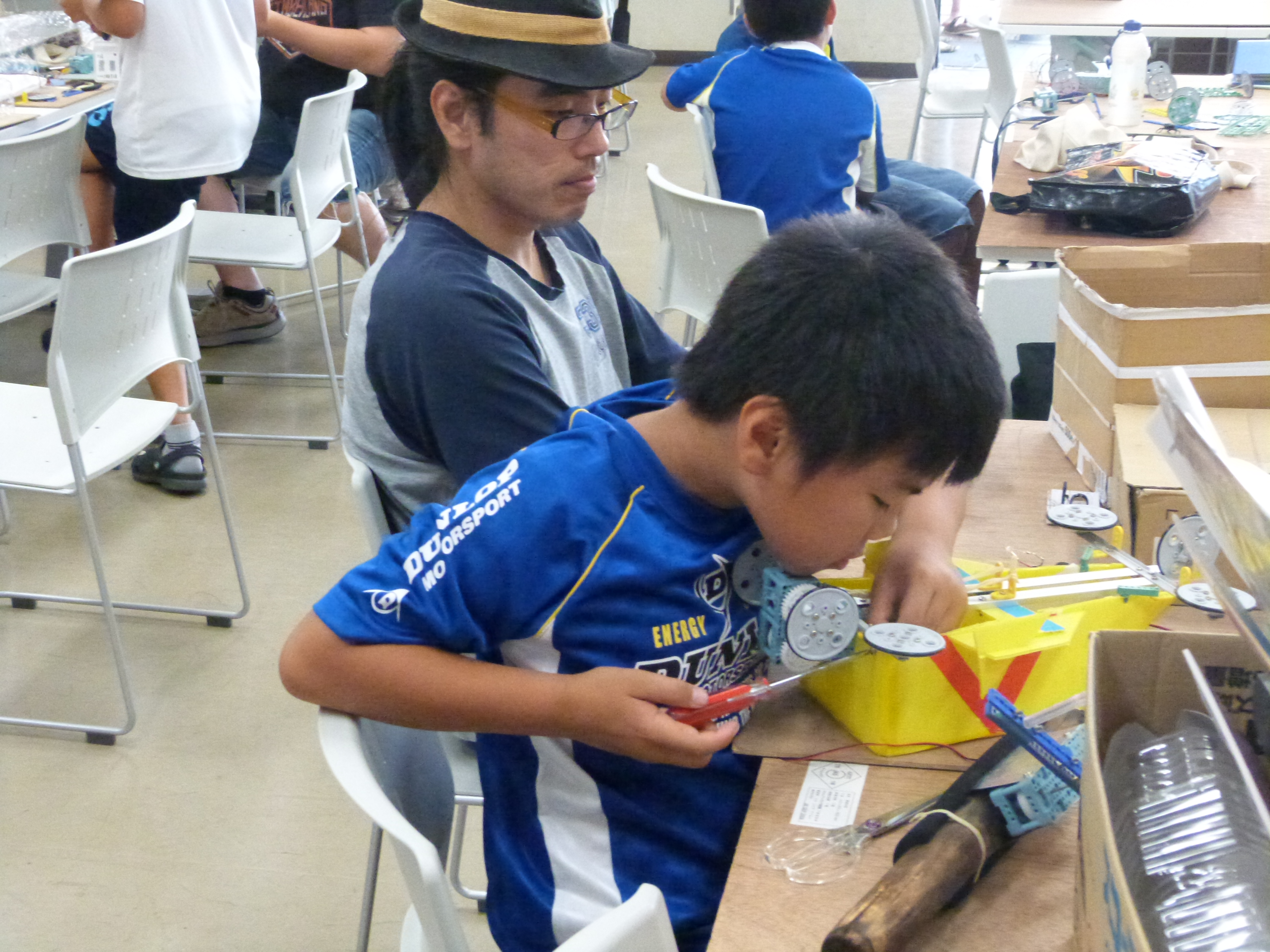チャレコンに参加する子ども達は、発明クラブの指導員に質問しながらチームの仲間や保護者の方と一緒に、課題のハイブリッドカー作りに励みました。回を増すごとにだんだんとチームの方向性が決まり、完成に近付いているようです。