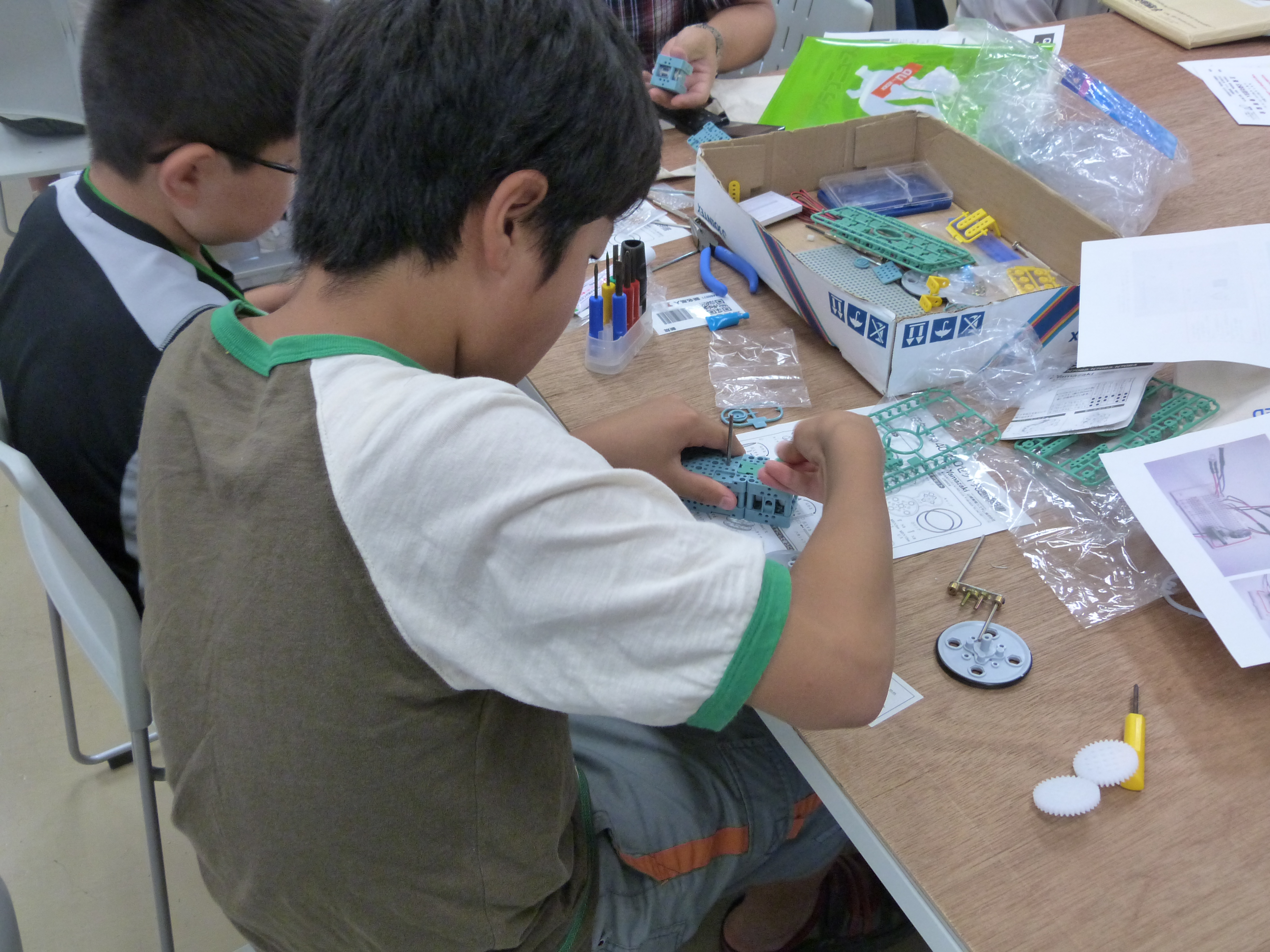 「チャレンジ創造コンテスト」は、3人1組で参加します。現在は12チームの参加が予定されており、どのチームも一生懸命に配布されたキットの組み立てをしています。基本部分が完成したら、チームならではの工夫で、より効率の良いハイブリッドカーの製作に取り掛かり、8月下旬の地区予選会に挑みます。