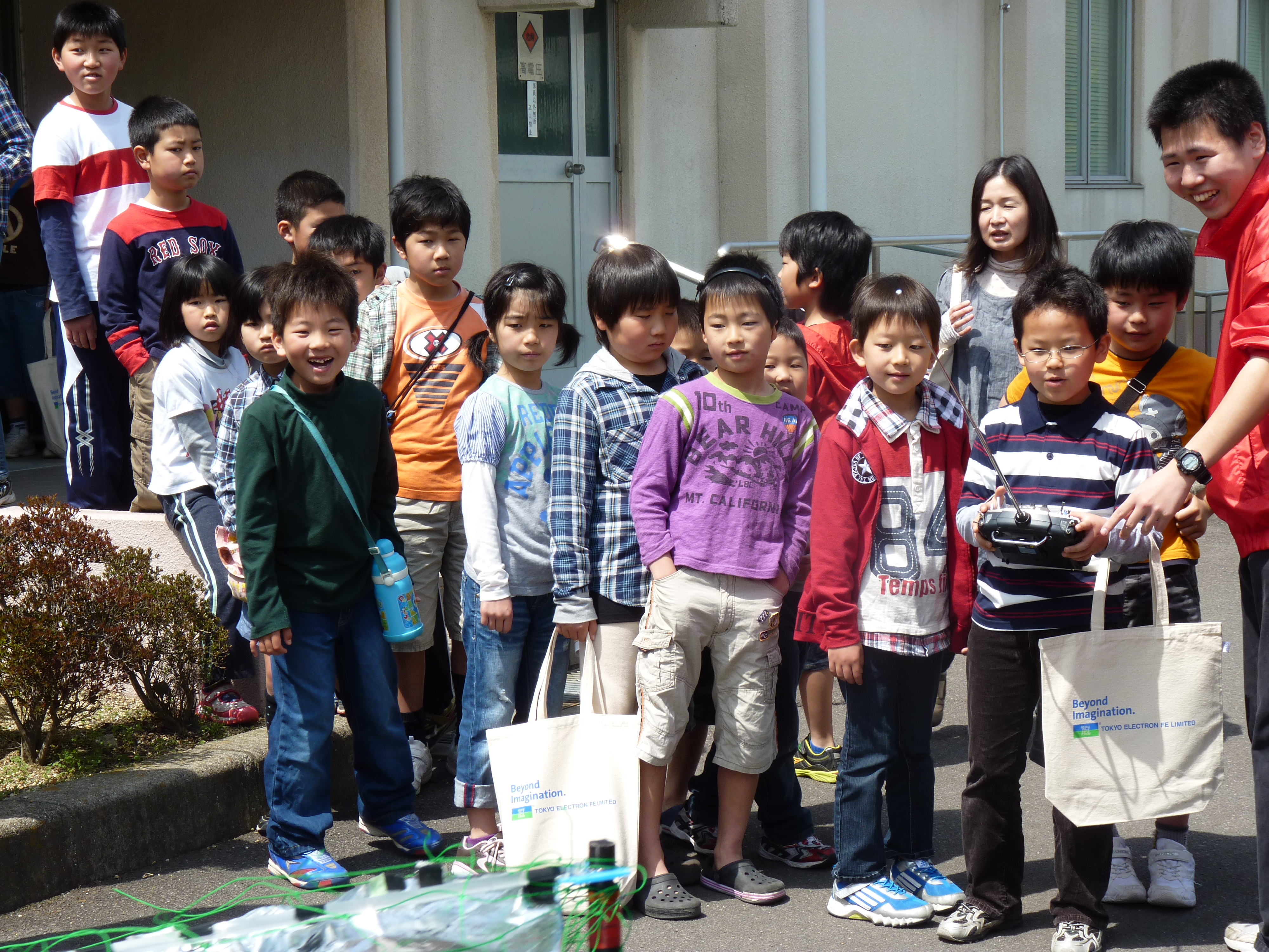 最後に、屋外にて「TEAM ARK」によるロボット実演が行われ、昨年のロボコン全国大会に出場したロボット「AGILITAS(アジリタス)」の構造、動作についてメンバーが説明をした後、ロボットを操縦し、子供達の目を釘付けにしました。子供達にも操縦を体験していただき、ロボットの動きの素早さに大歓声があがっていました。