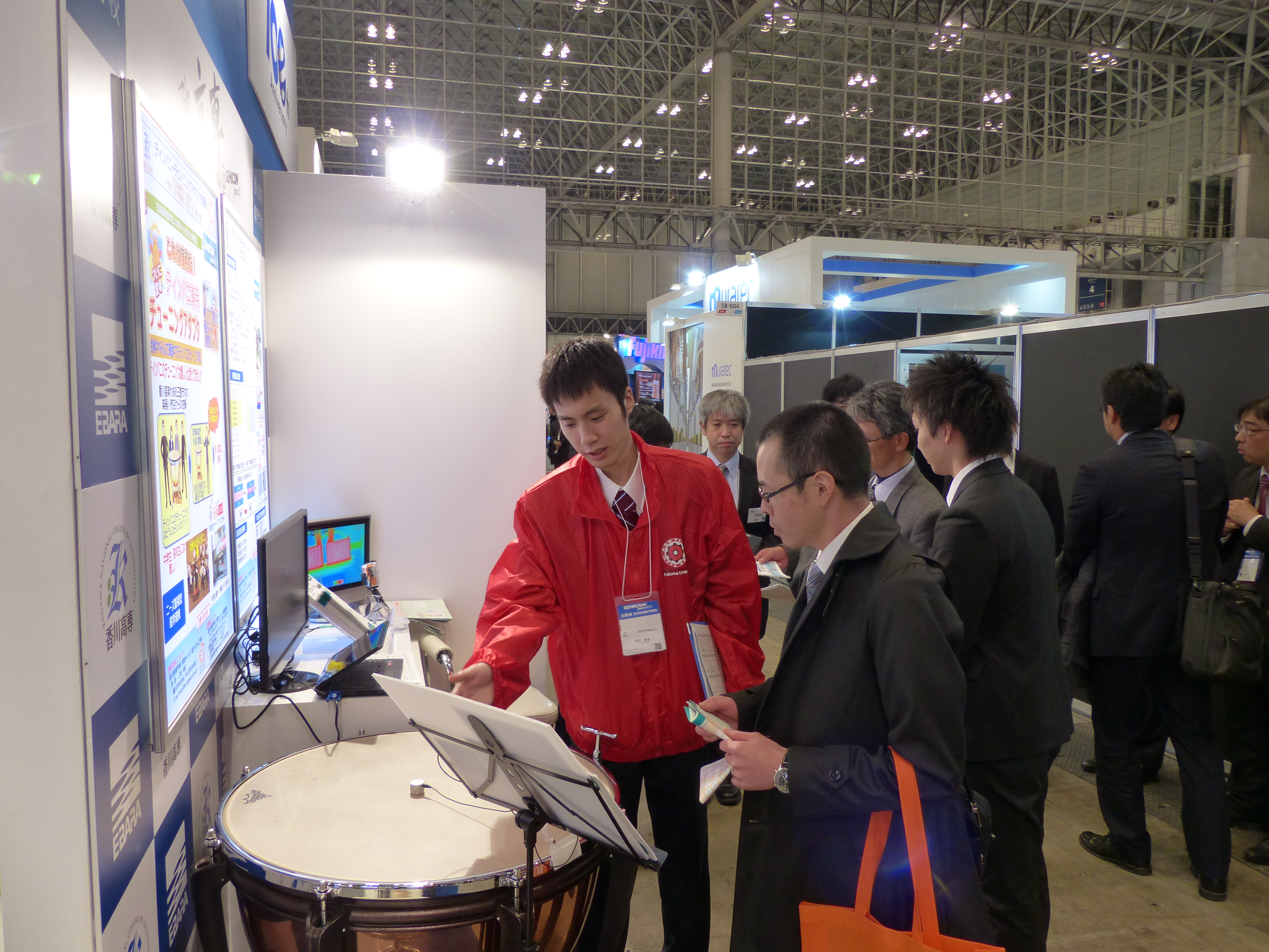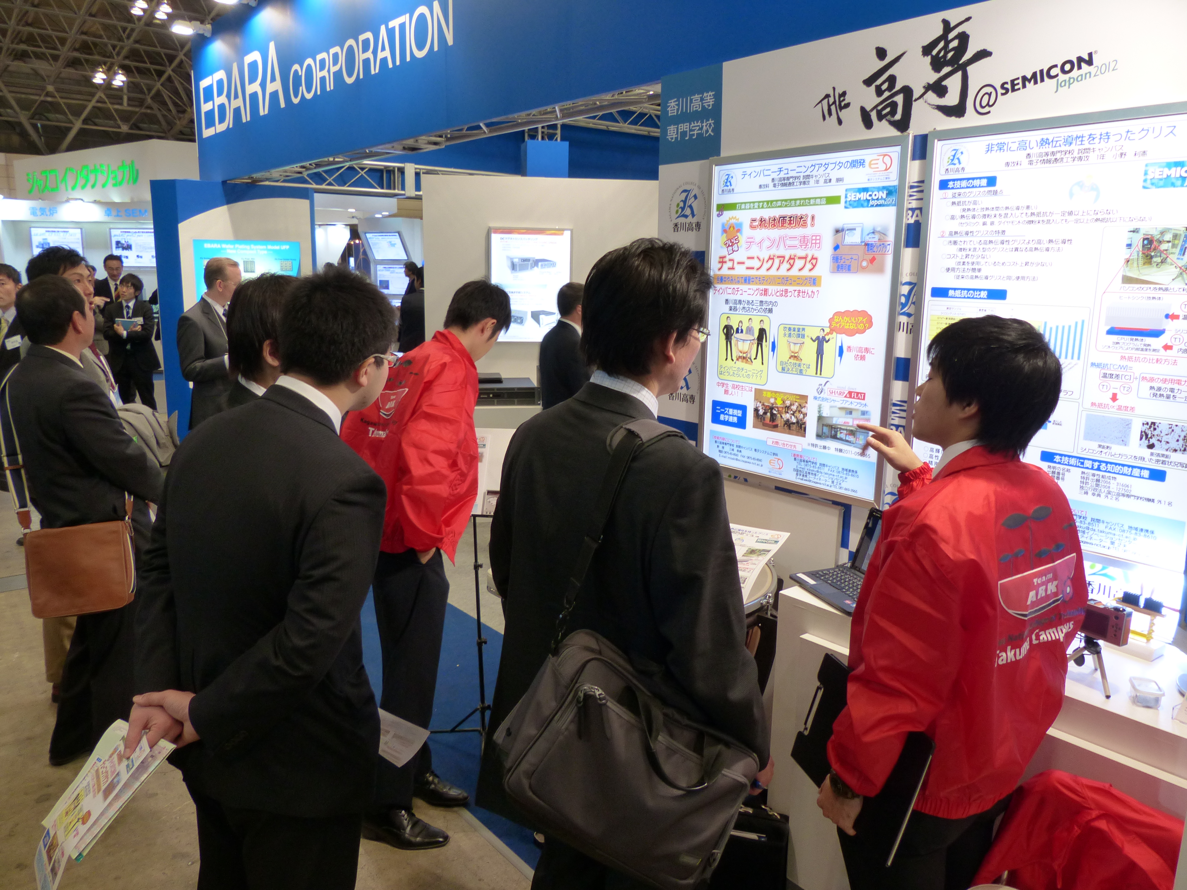 SEMI協力プログラム「The高専@セミコン」はセミコン・ジャパン2012に出展している自社出展ブース内に特設ブースを設け、高等専門学校等の学生へ研究発表の場を提供し、学生に半導体業界に対する理解を深めてもらうとともに、高専生の若きエンジニアによるアイディアにあふれた技術や研究成果が展示される企画です。香川高専詫間キャンパスは㈱荏原製作所の出展ブース内で「ティンパニ専用チューニングアダプタ」、「非常に高い熱伝導性を持ったグリス」を展示・シーズ紹介しました。