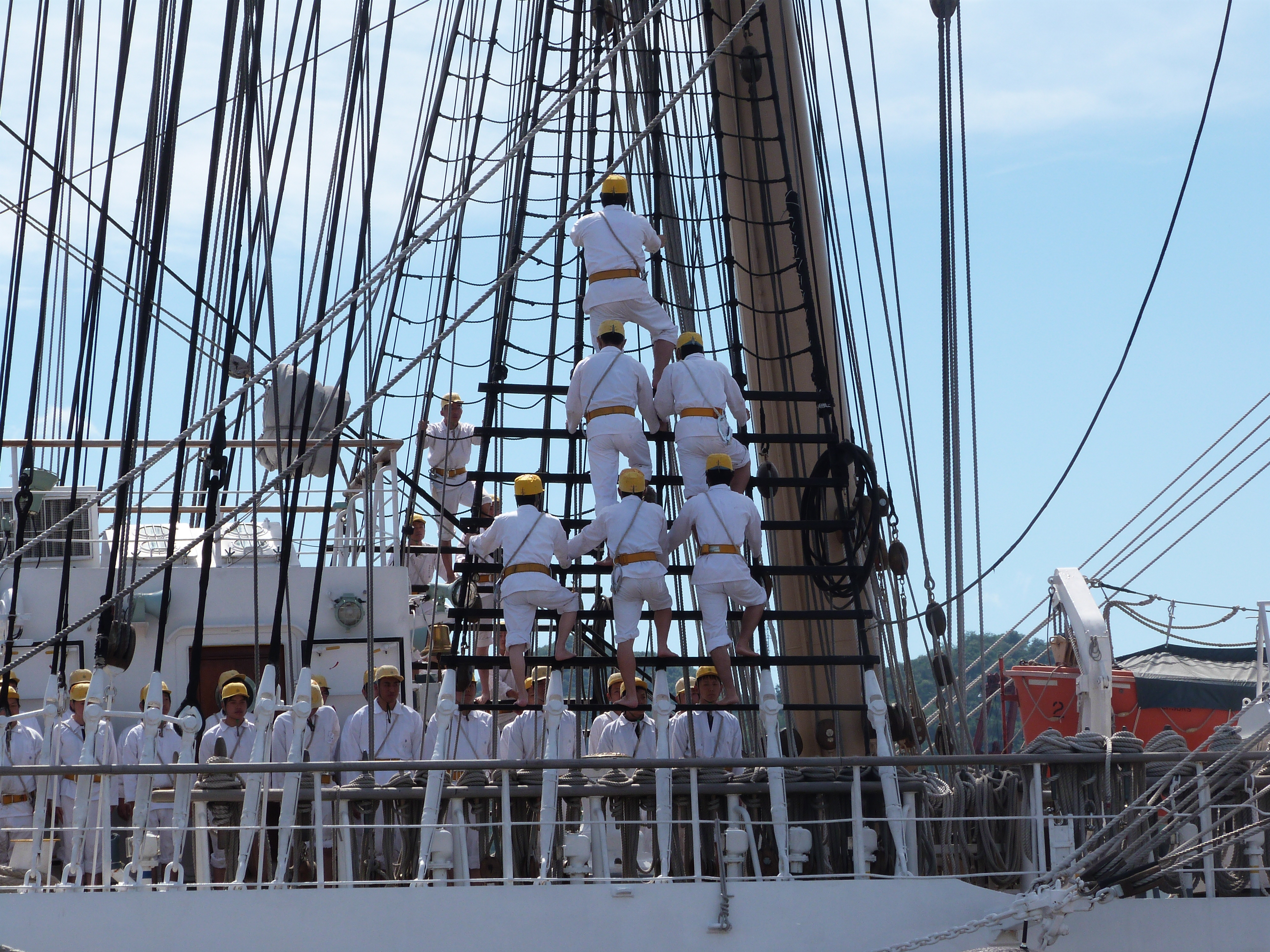出港前、船員が帆桁(ヤード)に配置し、見送りに来た方に対する謝礼を表す「登しょう礼」の儀式が行われました。足のすくむような高さのヤード上で定間隔で整列する船員の姿は大変美しく青空に映え、観客からは大きな拍手が湧き起こりました。