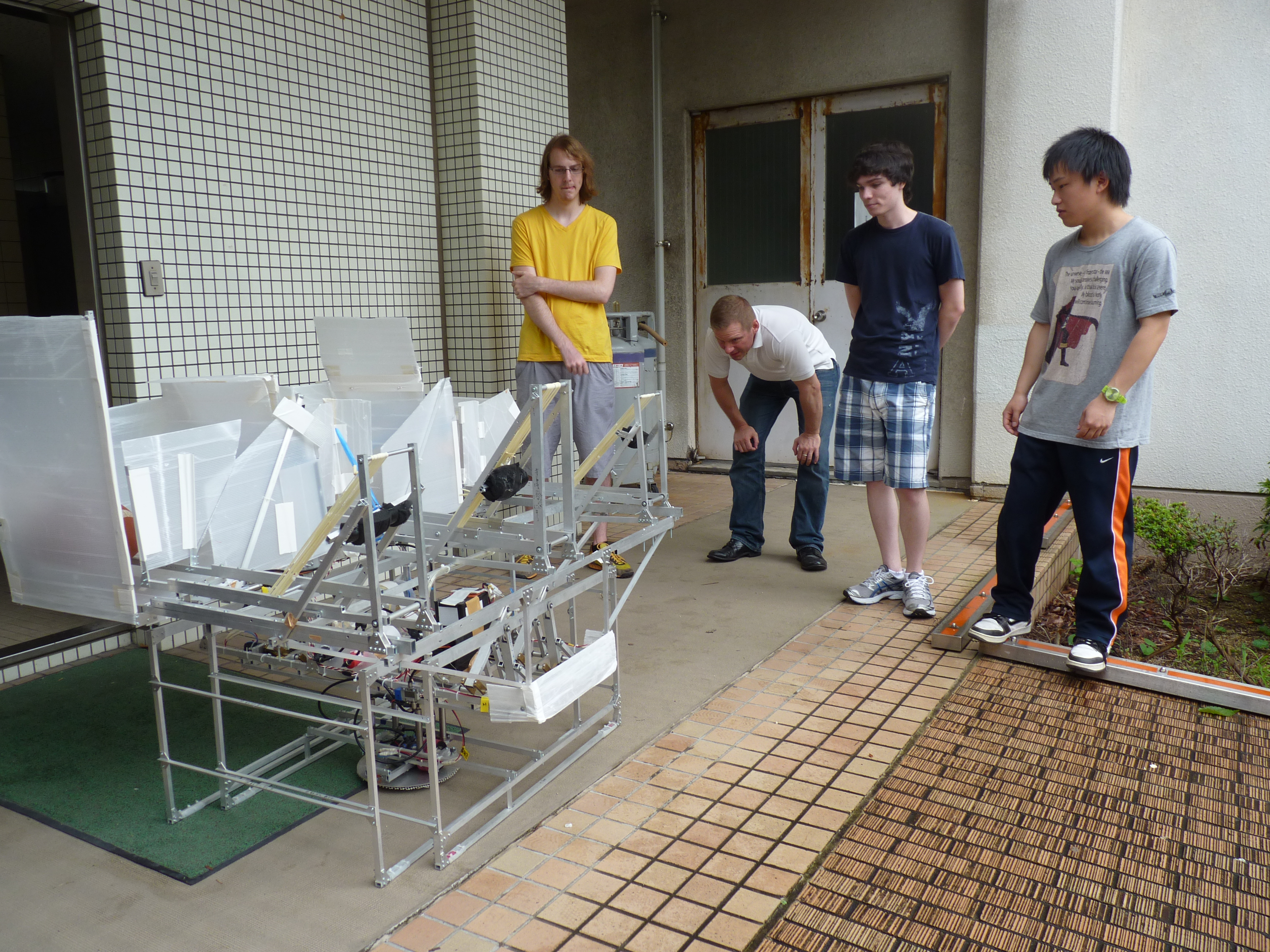 7月14日(土)、観音寺東ロータリークラブを介してアメリカから短期で日本を訪れた2名の学生、ロバートさん、ショーンさんを迎え、詫間キャンパスロボコンチーム「TEAM ARK」の学生が、ロボット製作体験とロボット実演を行いました。