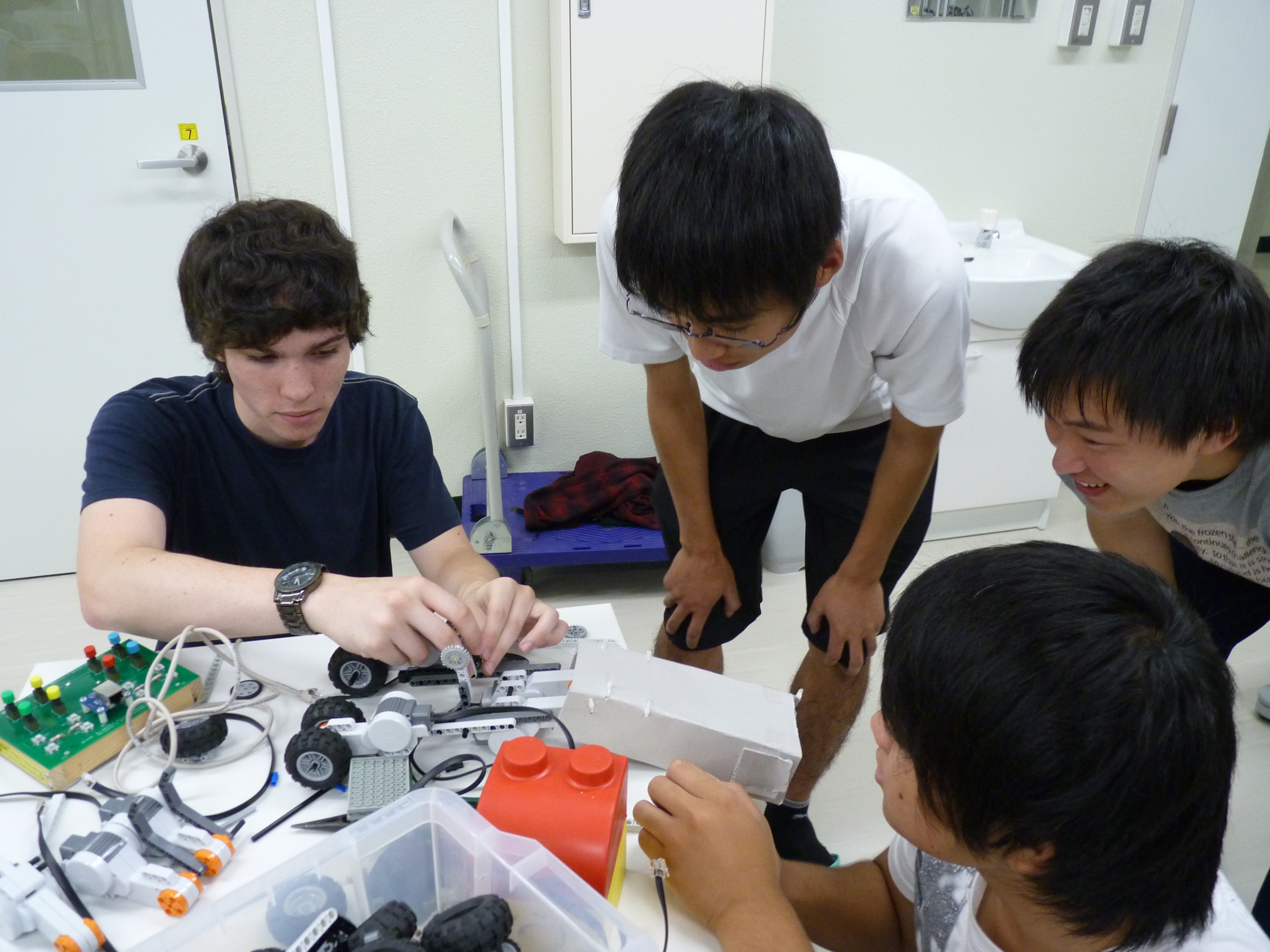 ロバートさん、ショーンさんはロボット工学やコンピュータに興味を持っており、「TEAM ARK」の学生が高専ロボコンに出場したロボットの実演をすると、とても興味深そうに質問をしたり、仕様を確認していました。また、学生実験にも使用しているオリジナルリモコンを使用したロボット製作体験では、積極的に部品を組み立て、ゴミ分別ゲームにチャレンジしました。「TEAM ARK」の学生と英語で会話しながらロボットを製作しました。