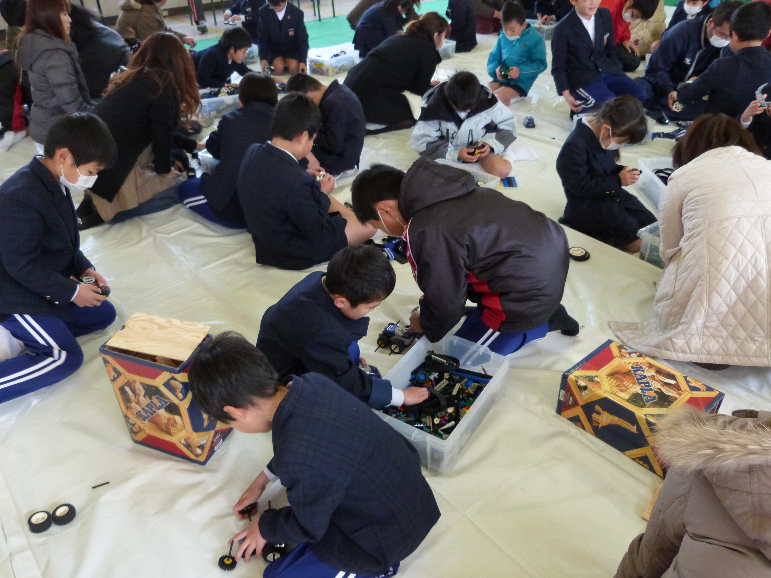 毎年恒例となっているこのロボット教室は、寒い時期にも関わらずたくさんの参加した親子に喜んでいただいています。教室が始まると保護者の方も子供と一緒になって製作しました。思い通りのロボットが完成すると友達同士で対戦するなどして楽しんでいました。