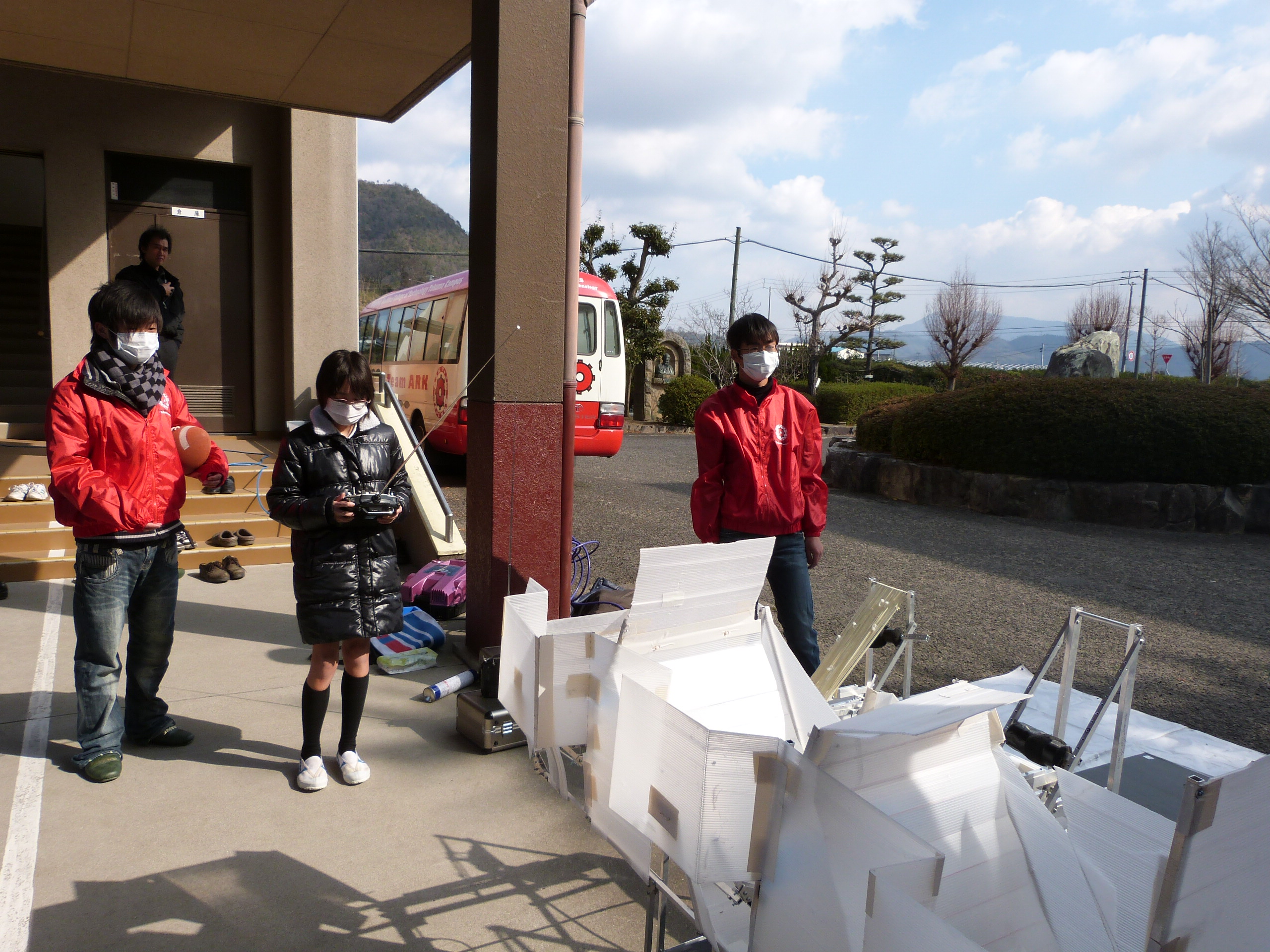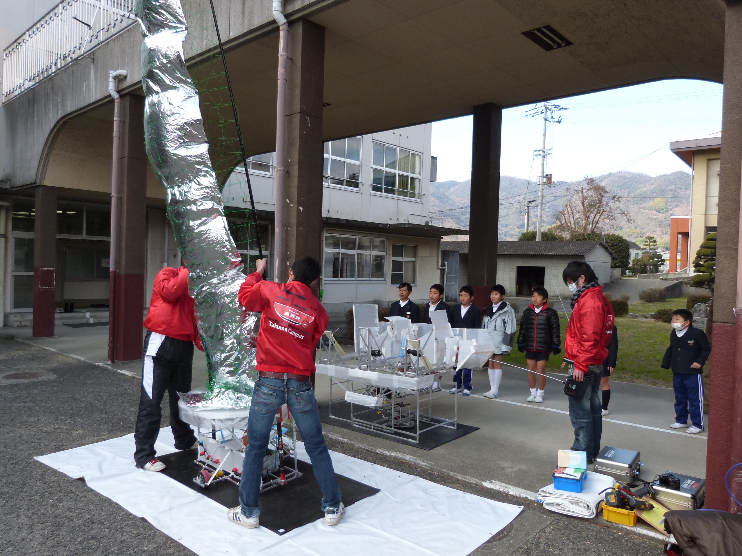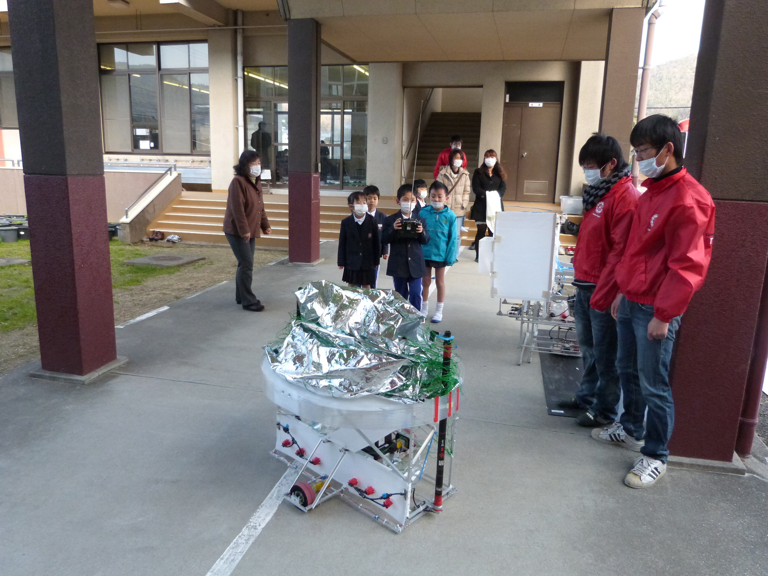 ロボット教室の後は屋外で、高専ロボコン2011四国大会で優勝し全国大会に出場した「AGILITAS(アジリタス)」のデモンストレーションと操縦体験を行いました。「TEAM ARK」の学生の説明やデモストレーションの間も、子供たちは早くロボットを操縦してみたいと待ち遠しそうな様子でした。