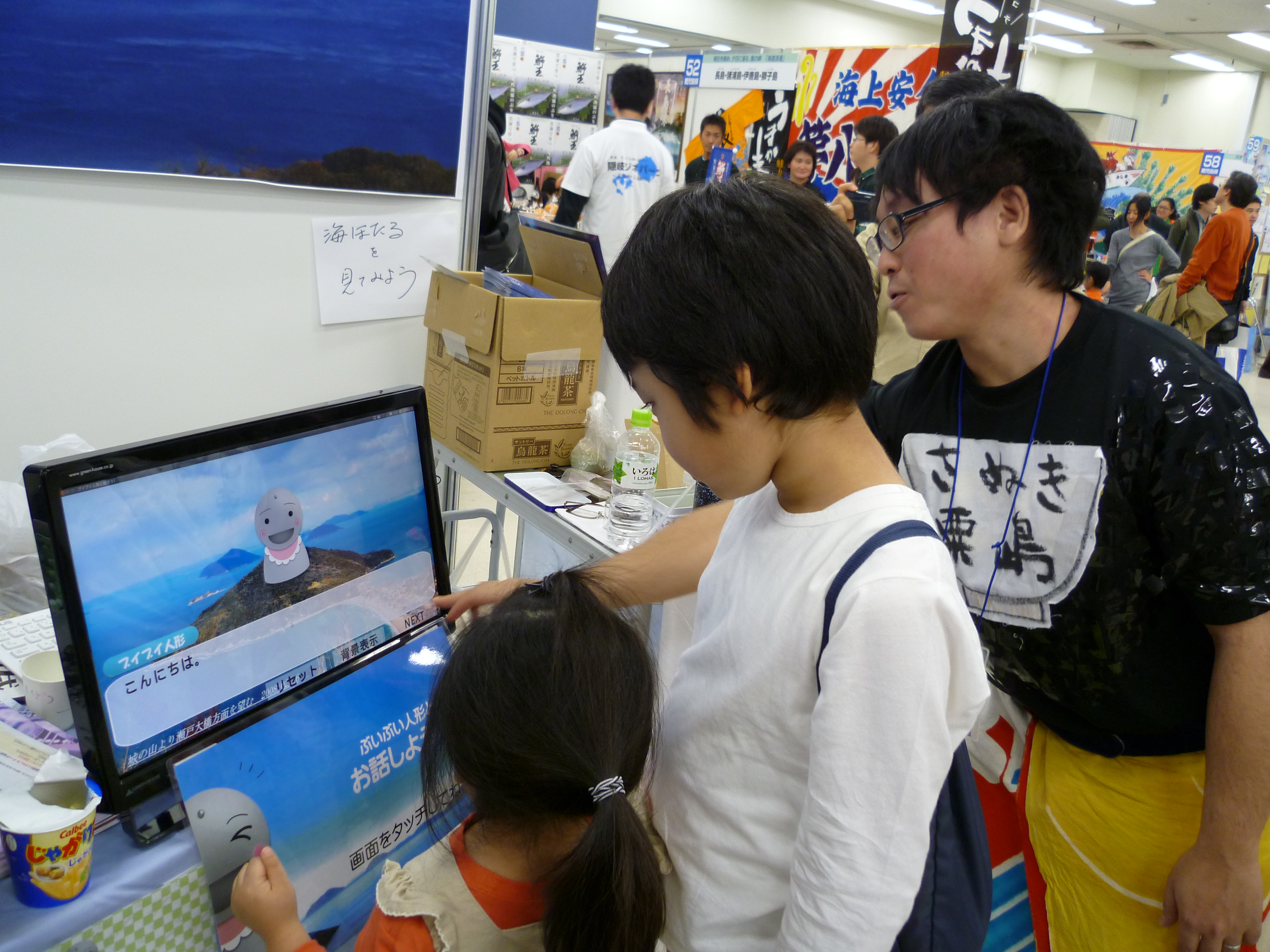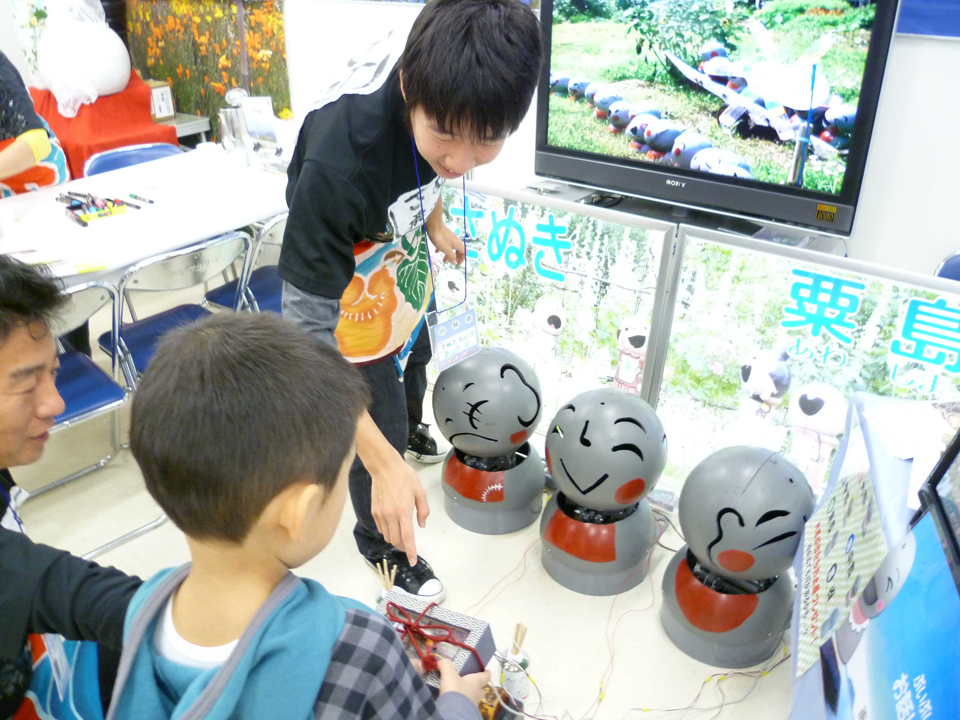 このイベントは、日本各地の島々の美しい自然や独自の歴史・文化など、島の魅力を知ってもらうことを目的として開催されており、三豊市から粟島が参加しました。粟島は廃材の漁具(ブイ)で作ったブイブイ人形や、海ほたるが生息する地として有名で、本校では学生が自動でお辞儀をするブイブイ人形を製作し、島のPRに協力しています。今年は、貝のお賽銭をもらうとお辞儀する人形の他、リモコン操作で顔が動くブイブイ人形、モニターのブイブイ人形とタッチパネルで会話をしながら粟島の紹介をするプログラムを製作しました。