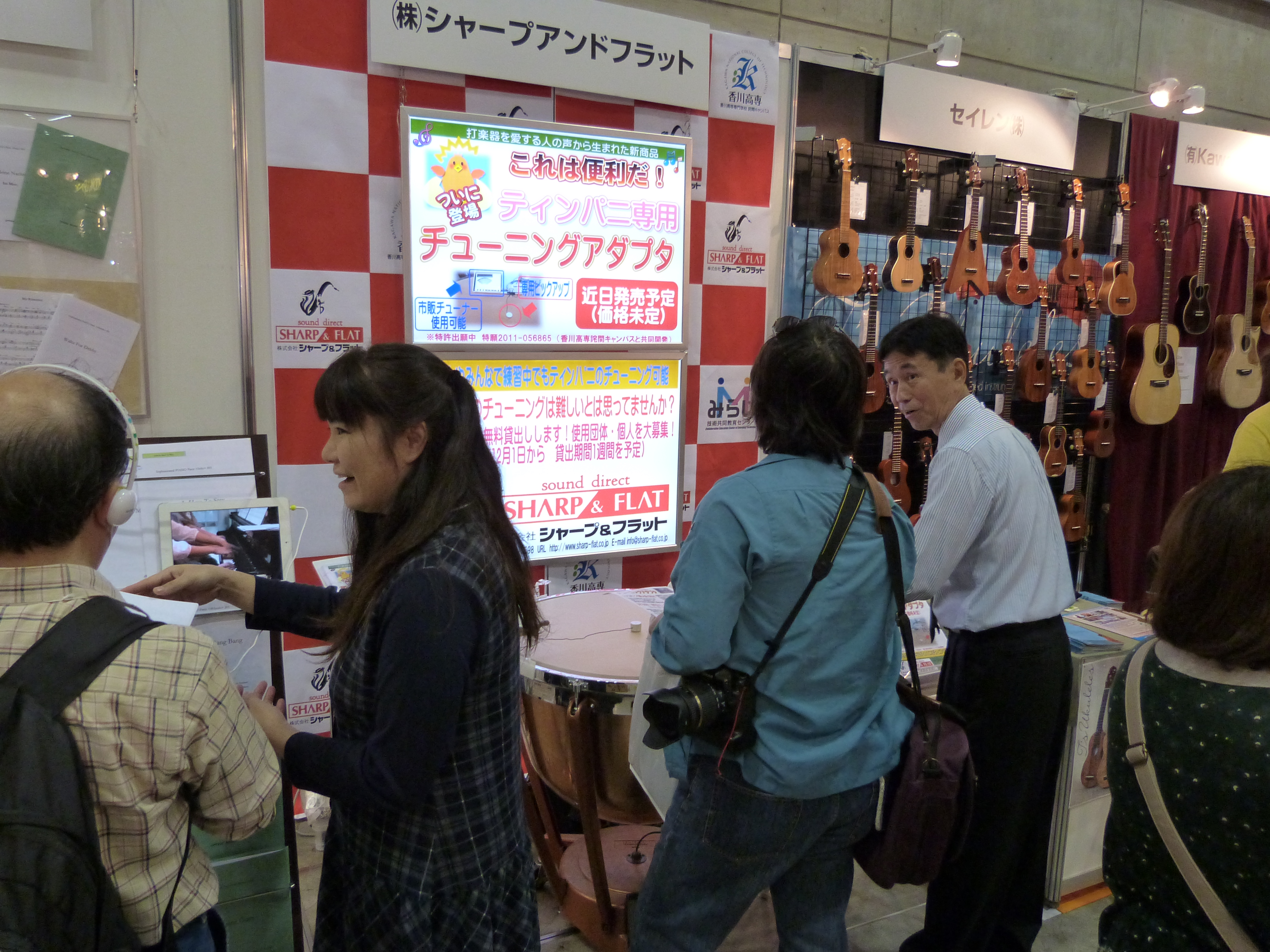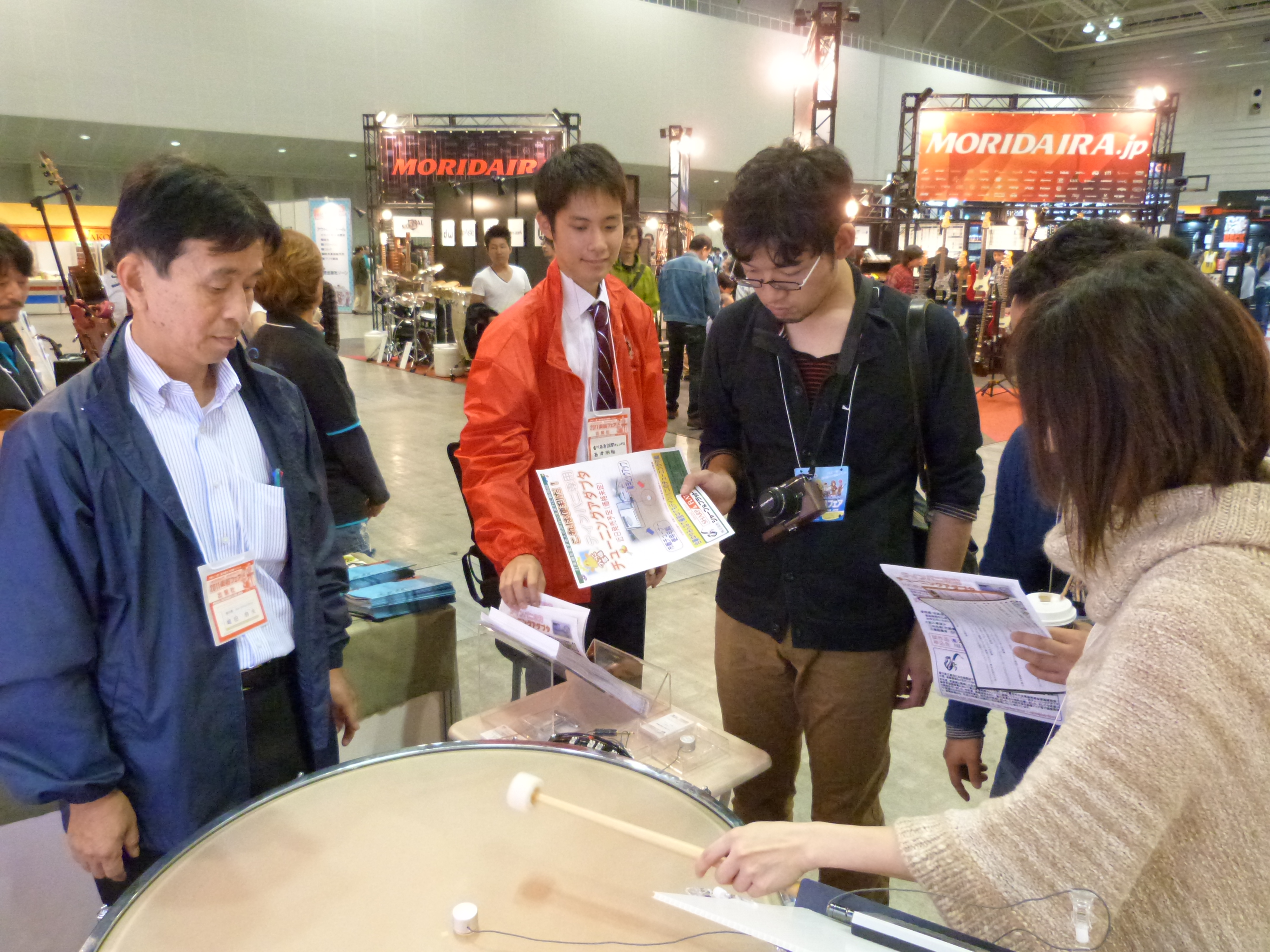 今回の出品は来年度以降の発売に先行し製品の紹介と体験、さらにモニター募集を目的として参加しました。様々な楽器が一堂に集まった国内最大のこのフェアには全国から大勢の音楽愛好者が訪れ、気になる楽器を手に取り、音を出して楽しんでいました。参加したティンパニーチューニングアダプタは、打楽器に興味がある方に大変好評で、実際にチューニングの体験をしていただき感想を聞く事ができました。今後の発売に向け、今回のフェアで得られた意見を参考に、更に改良を加えていきたいと考えています。