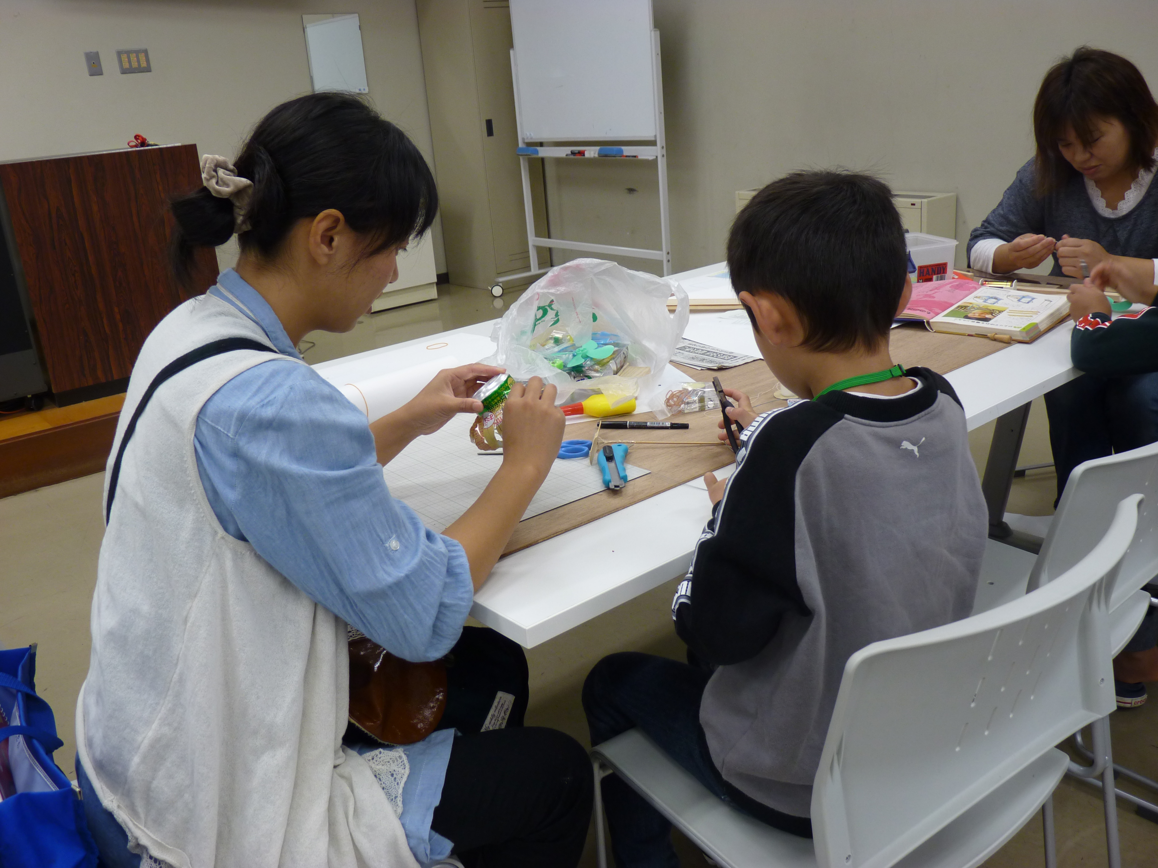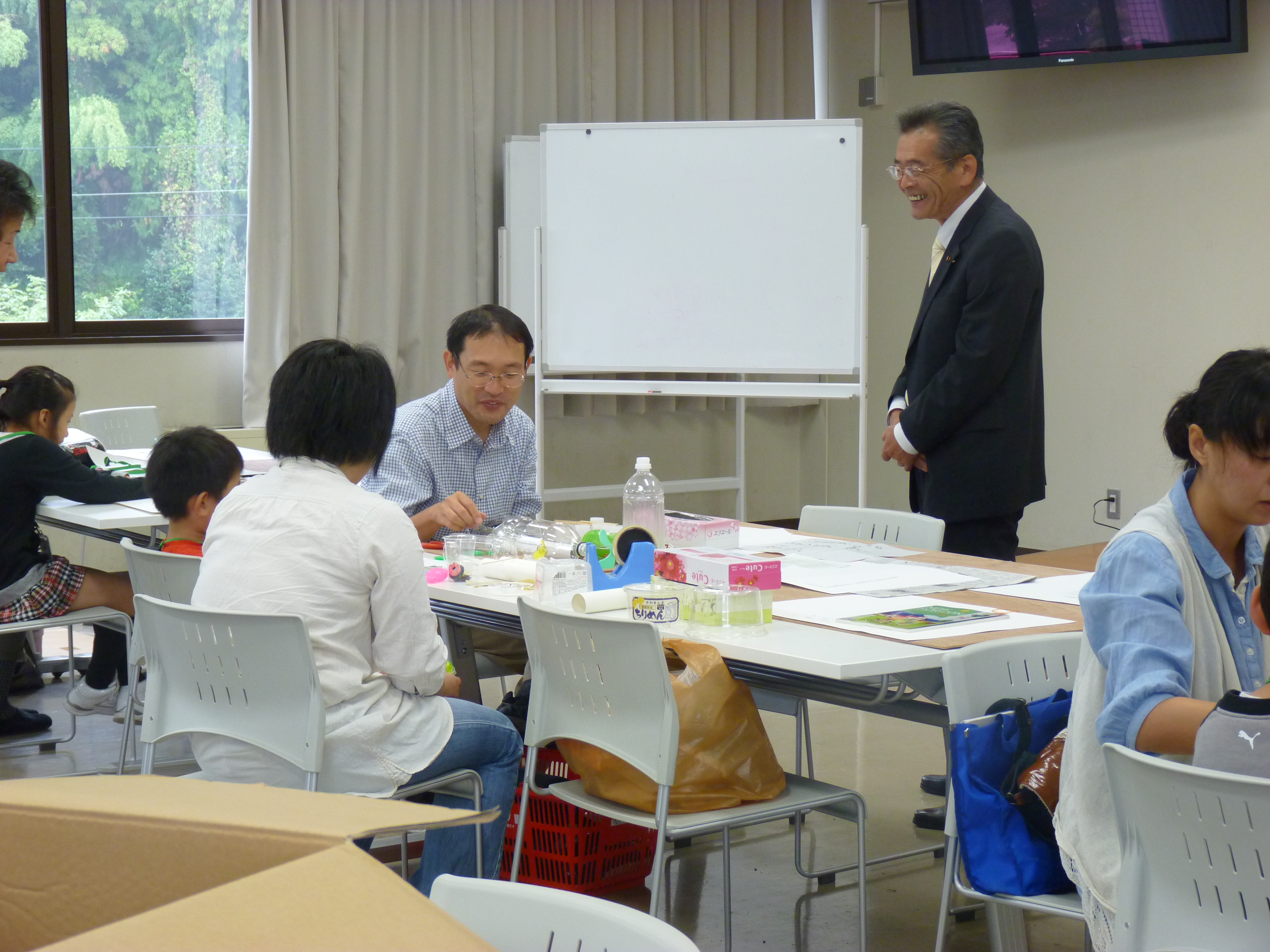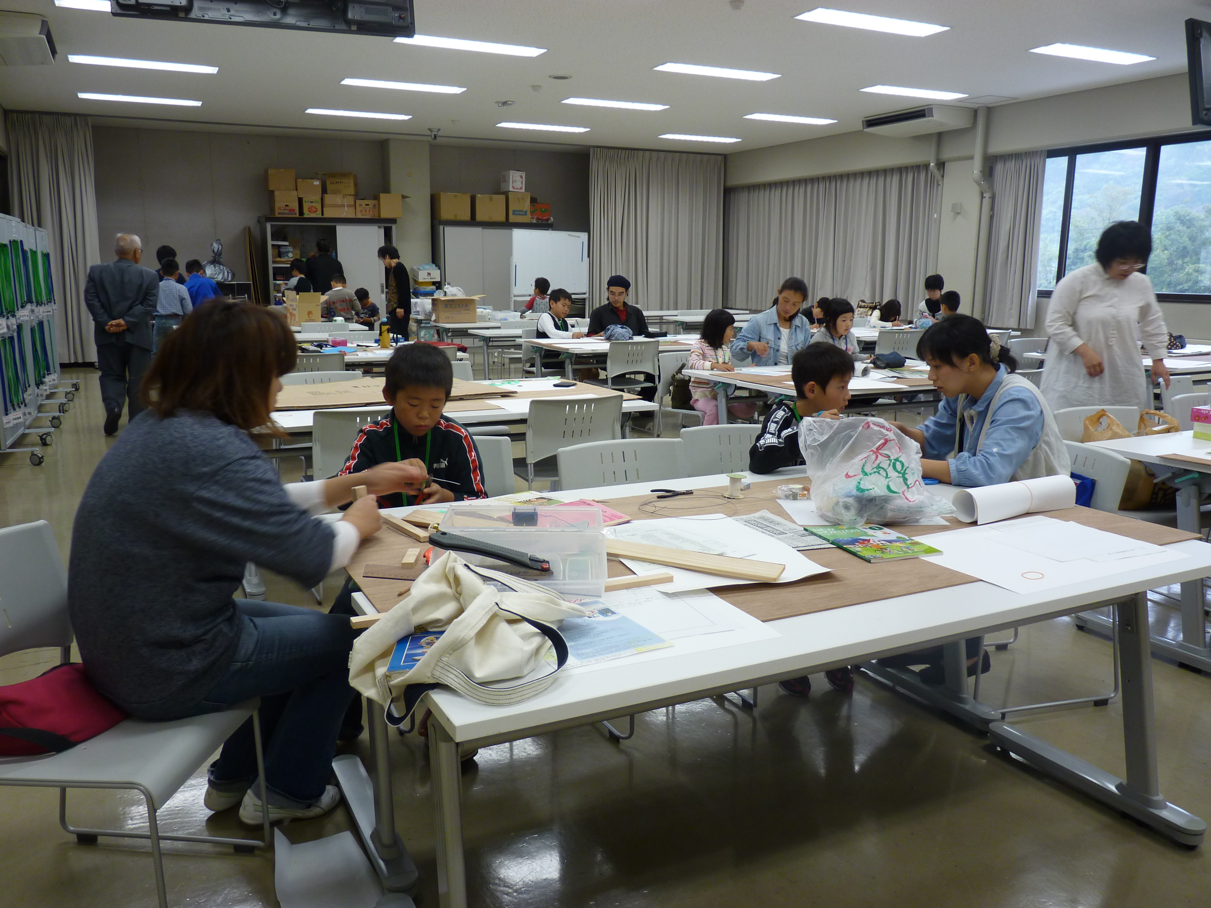 財団法人平賀源内顕彰会が主催する「平賀源内発明くふう展」は今年で28回目を迎え、発明クラブからも毎年たくさんの子供達が作品を出品し、何人もの入賞者を出しています。この日は「こんなものがあったら便利かな?」というものを考え、画用紙にデザイン画を描くなどして、構想を膨らませました。中には早速持参した材料で作品を作る子もおり、友達と批評し合っていました。また途中、三豊市議会の近藤議長が活動の視察に来られ、三豊市の将来を担う子供達の柔軟なアイデアへの期待を語り、保護者の方、子供達と積極的に意見交換する場面も見られました。