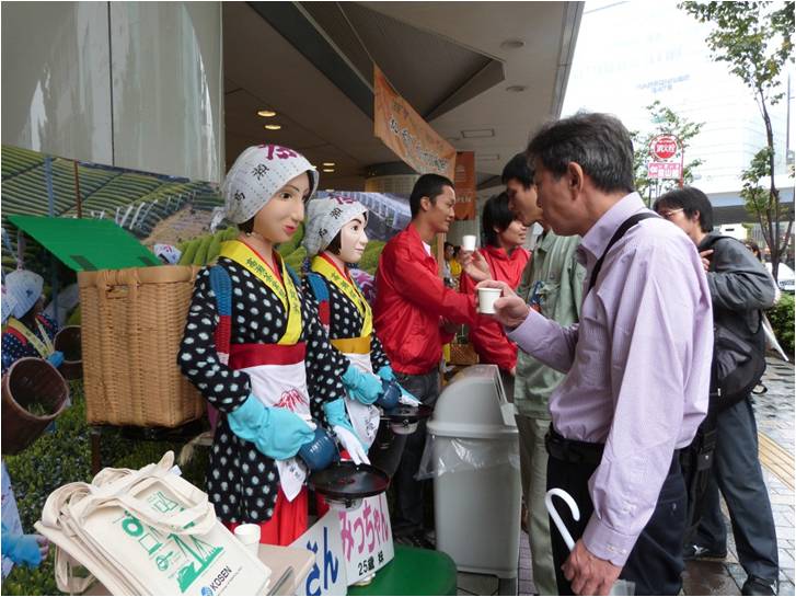 10月22日(土)午前中はあいにくの雨で人通りもまばらでしたが、午後は雨も上がり多くの人に三豊市の物産を購入して頂きました。翌日の23日(日)は午前中から晴天に恵まれ気温も上がり「みっちゃん・とよさん」のおいしい冷茶を多くの人に味わって頂きました。