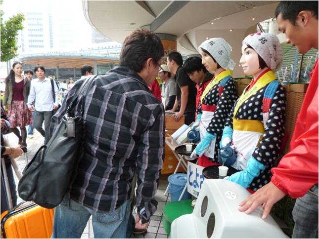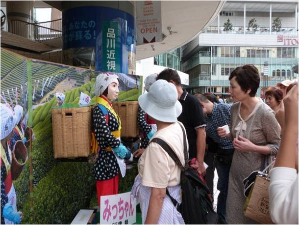 10 月 22 日(土)・23 日(日) 午前 11 時~午後 5 時 にJR有楽町駅前東京交通会館前 1 階ピロティにおいてお茶サービスロボット「みっちゃん・とよさん」が三豊市高瀬町のおいしい冷茶をお接待し三豊市と三豊市の物産PRを行いました。
