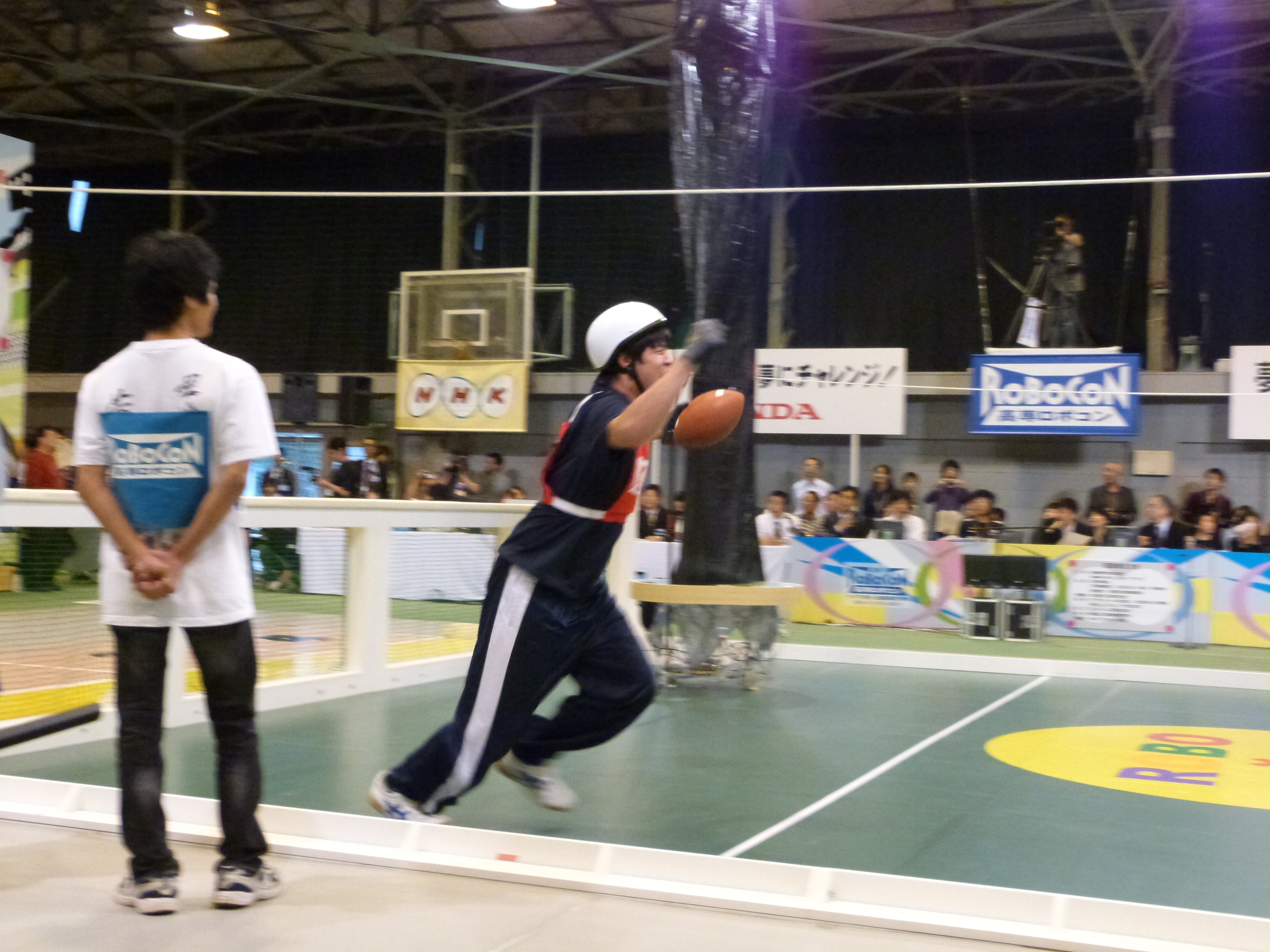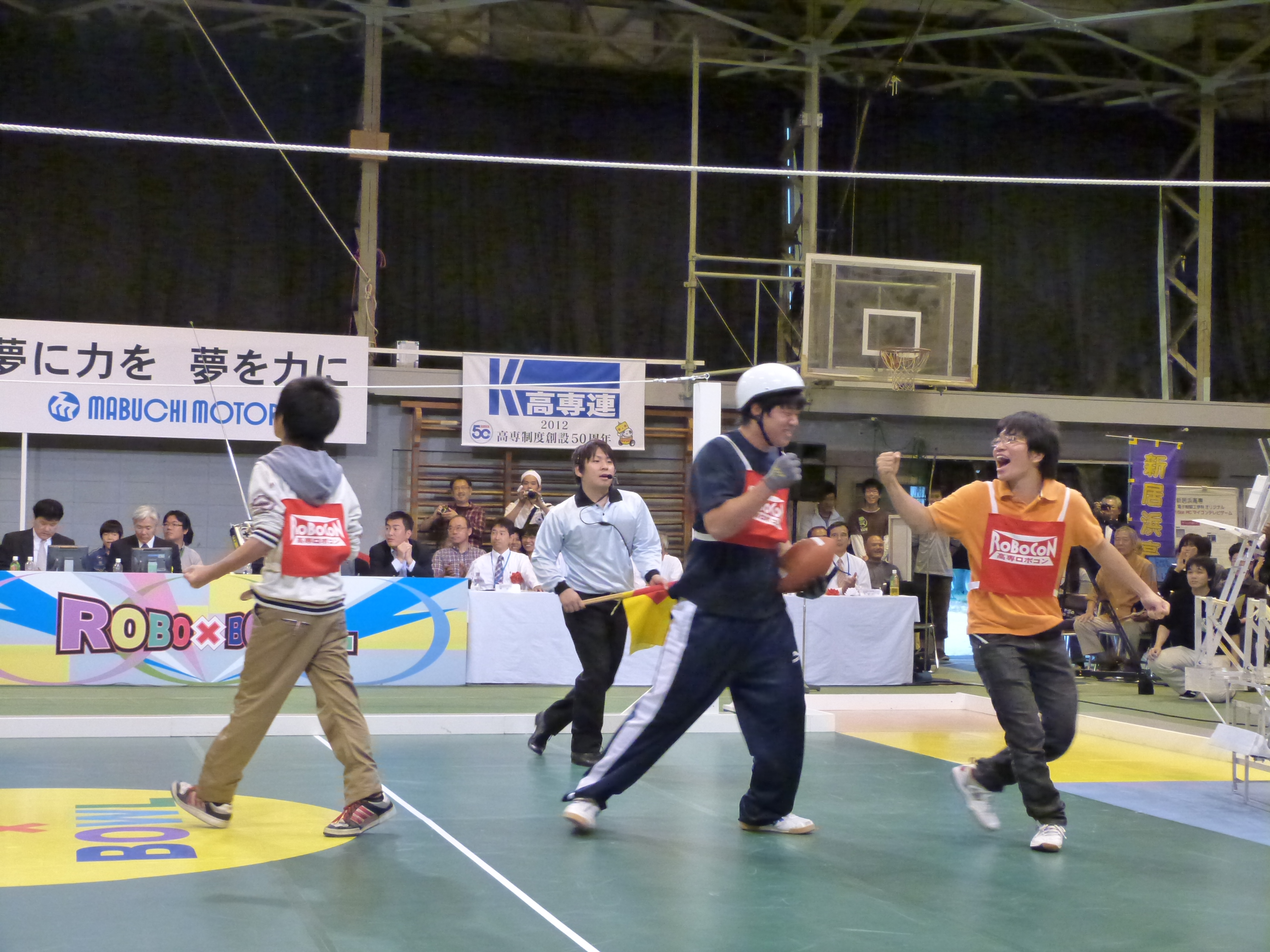 10月23日(日)、新居浜高専にて「アイデア対決・全国高専ロボットコンテスト2011四国地区大会」が開催されました。24回目となる2011年の競技課題は「ロボ・ボウル」。アメリカンフットボールをイメージした対戦ゲームとなる今年の課題では、2足歩行のオフェンス・ロボットが、学生から受け取ったボールを、ディフェンス・ロボットをかいくぐってチームメイトの学生に向けてノーバウンドでタッチダウンパス。パスが成功するまでのタイムを競う新しい形式の対戦競技です。素早さ、確実性、そしてプレッシャーに負けない精神力を要し、攻守共に一瞬で決着がつく試合は、終始緊迫した雰囲気の中で行われました。