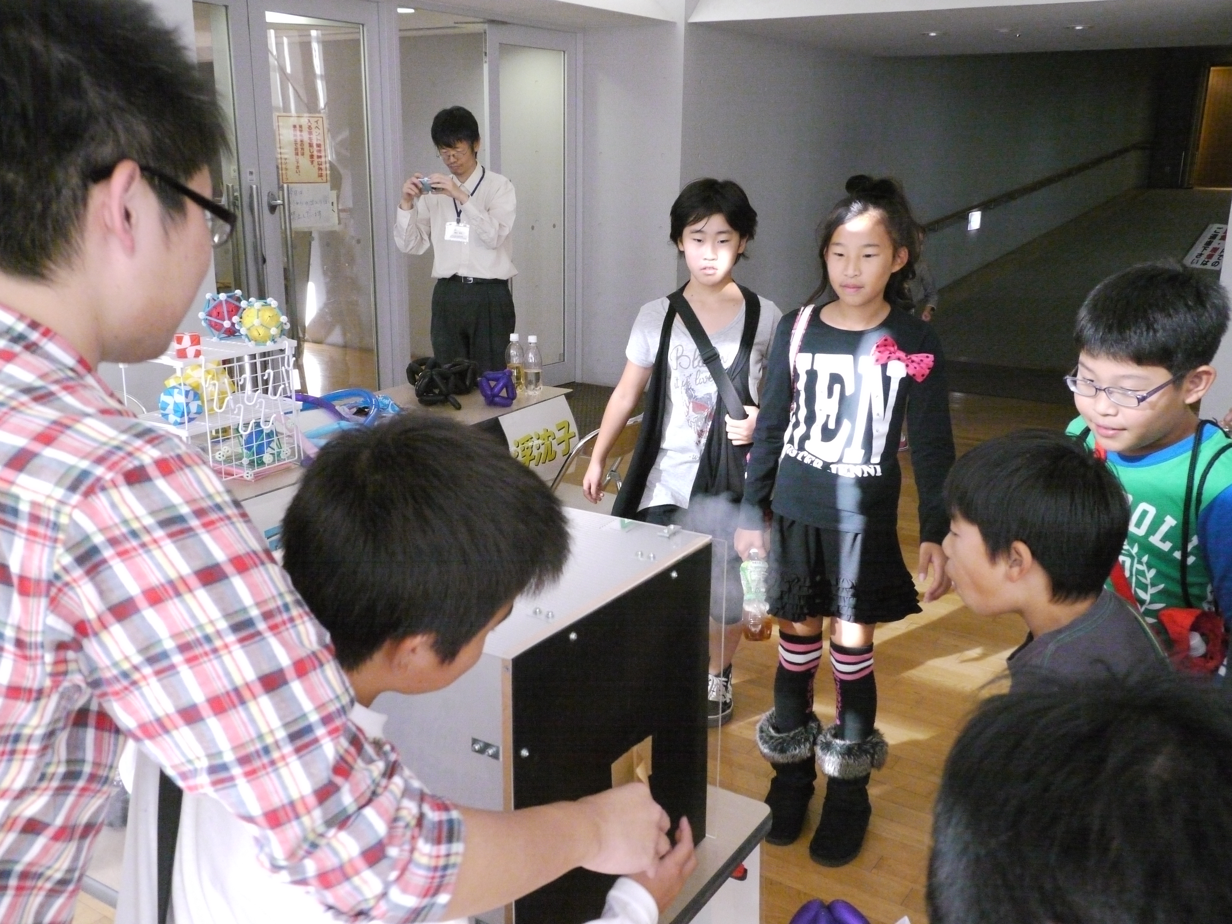 本校は「科学とのふれあい」イベントに参加し、科学クラブ「DEX」が「りかであそぼう!」と題して、空気砲体験や真空実験、エックスジャイロや多面体のバルーン作りなど、科学を遊び感覚で体験できる場を用意しました。まつりに訪れた子供達は、空気砲で煙を遠くまで飛ばしたり、実験を興味深く見守ったり、教えてもらいながらエックスジャイロを作って友達同士で投げてみたりと楽しみながらたくさんの体験をする事ができました。