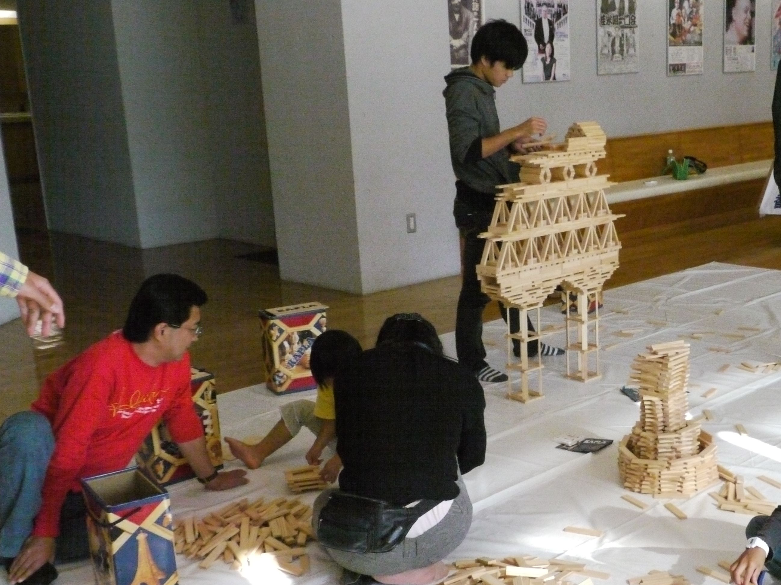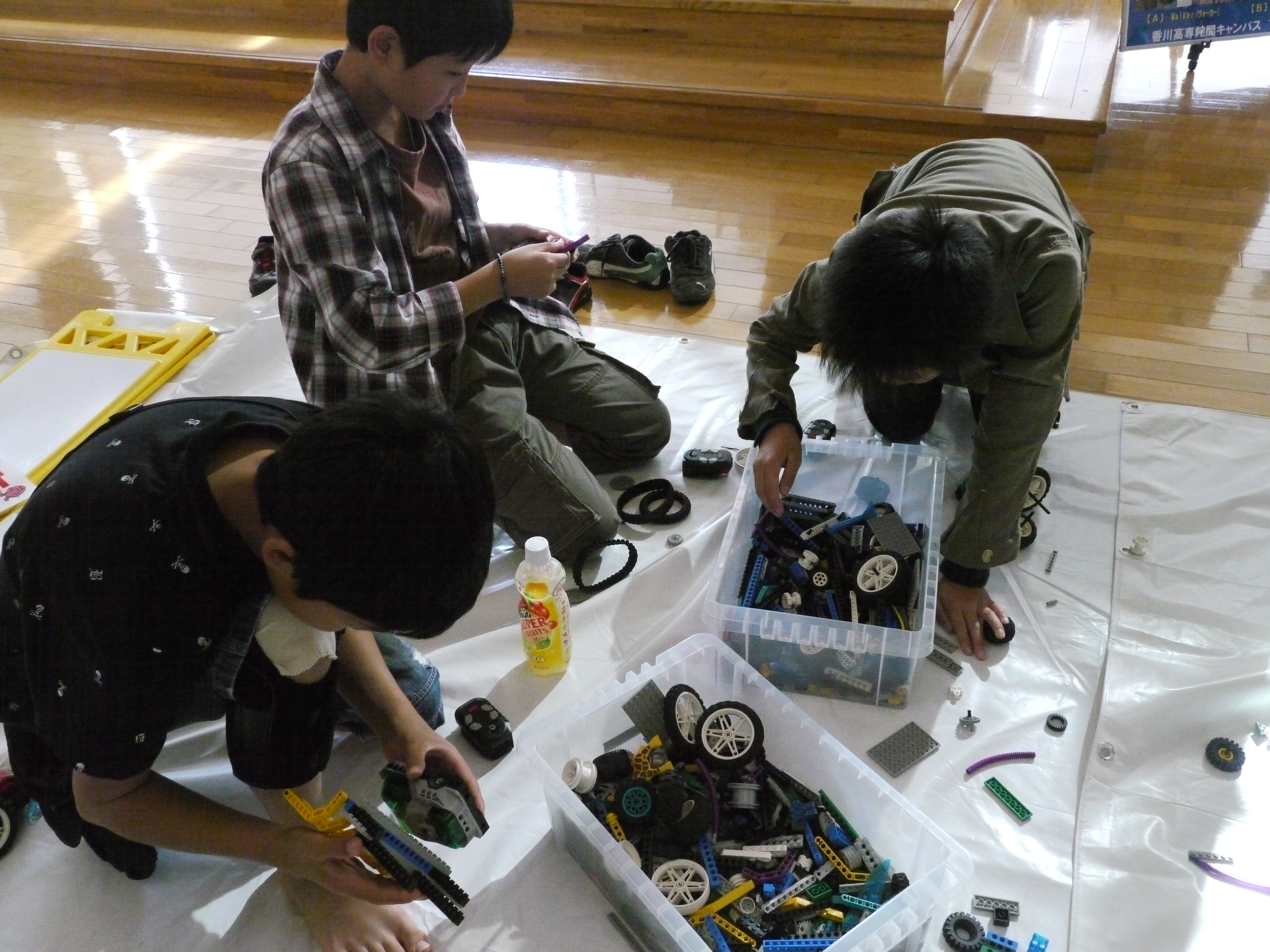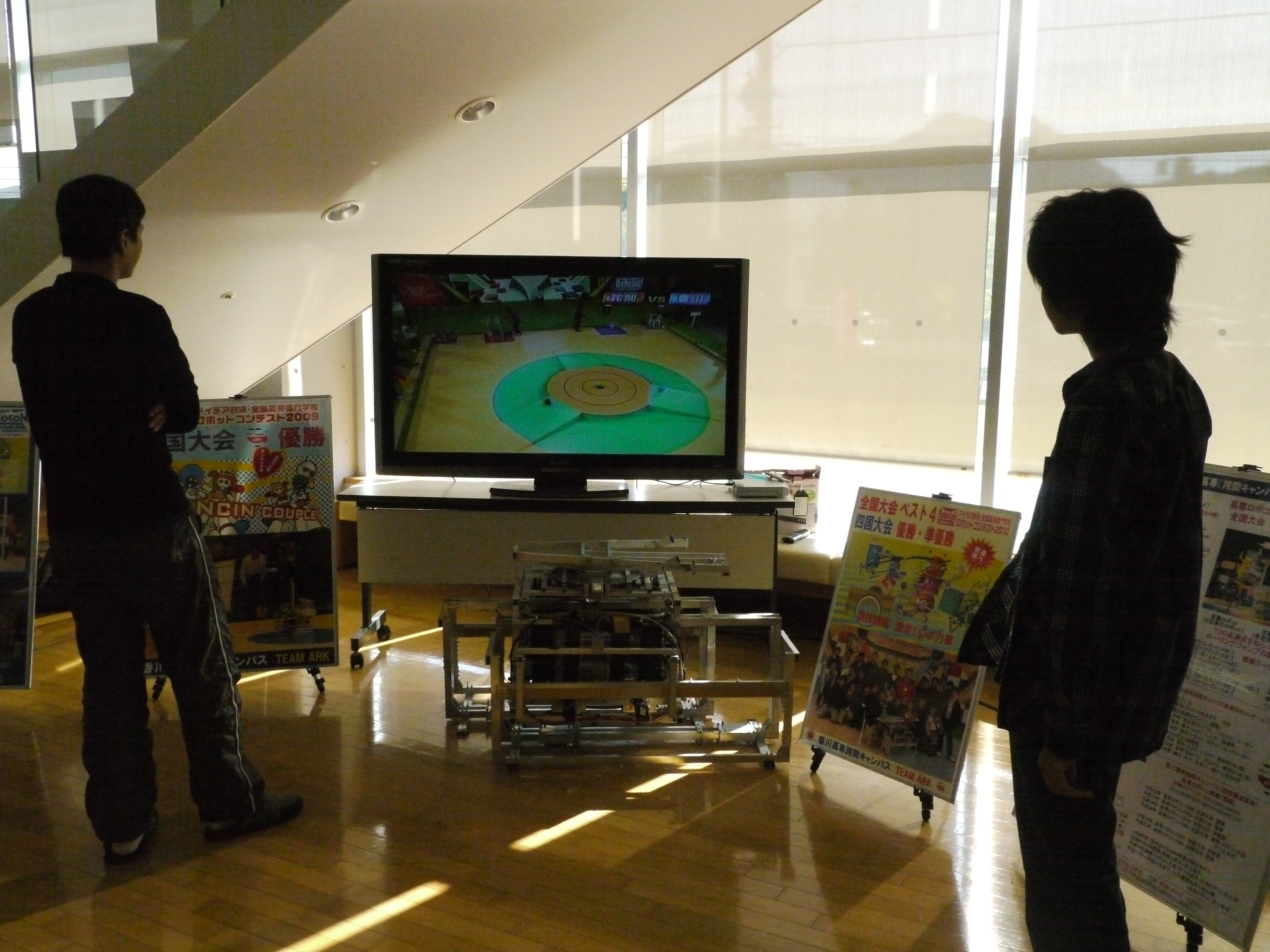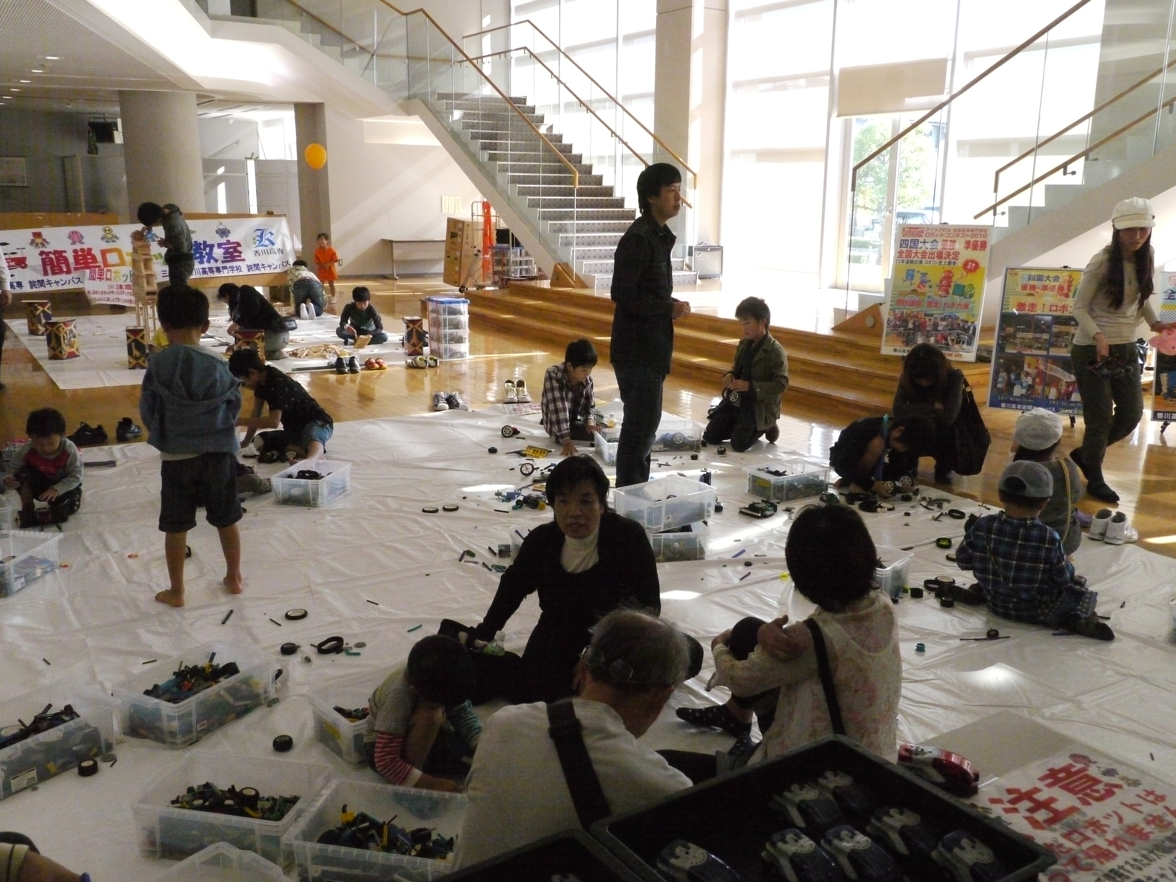 本校は「科学とのふれあい」と題されたイベントに参加し、ロボコンチーム「ARK」が、レゴを用いた「簡単ロボット教室」と、造形ブロック「カプラ体験」や昨年の高専ロボコンに出場したロボット「サイクロン」の展示を行いました。これらはまつりに訪れたたくさんの家族連れ、子供達に興味を示していただけ、思い思いの部品を手に、熱中して自分なりのロボットを作る姿や、集中してたくさんのブロックで美しい造形を作る姿があちこちで見られました。