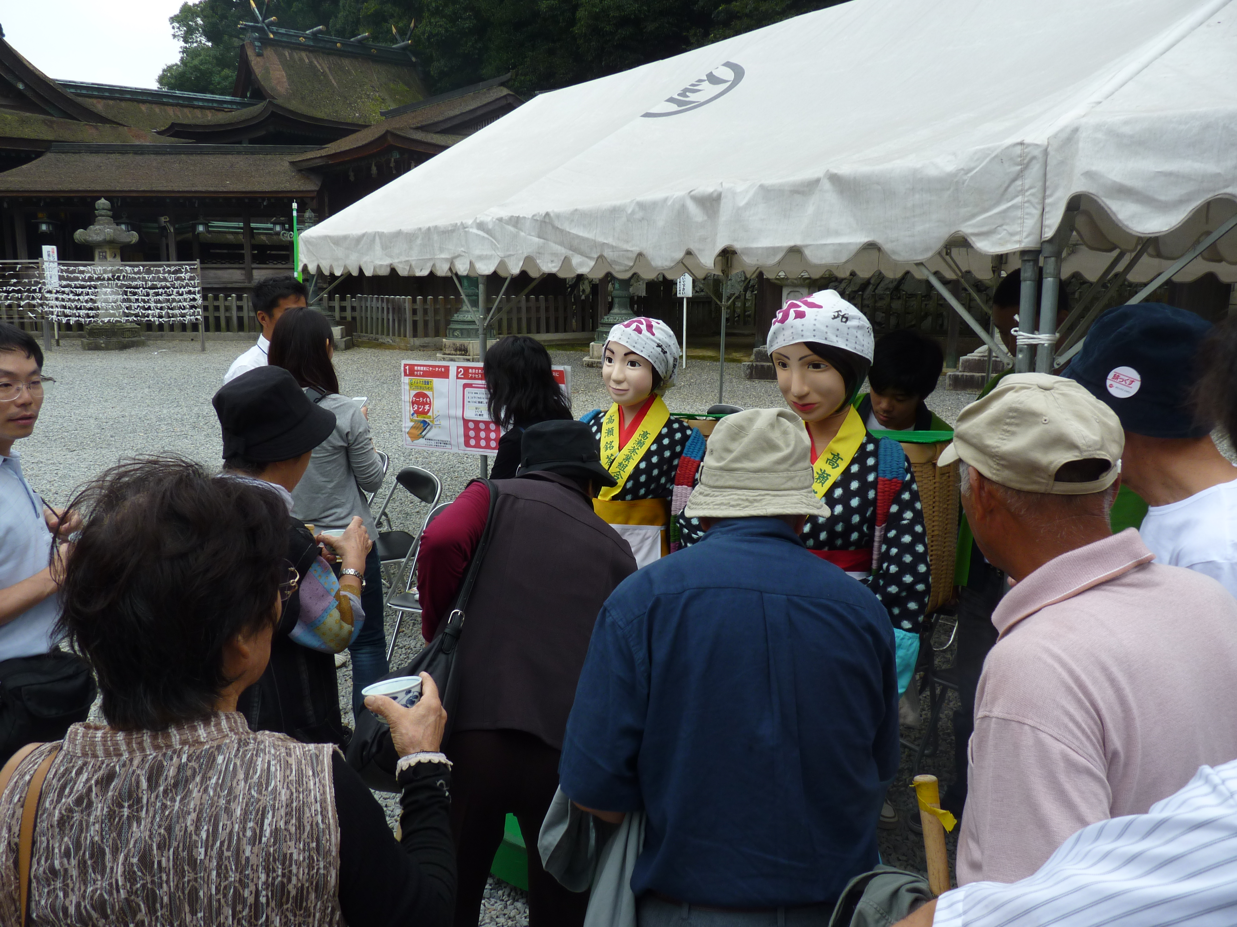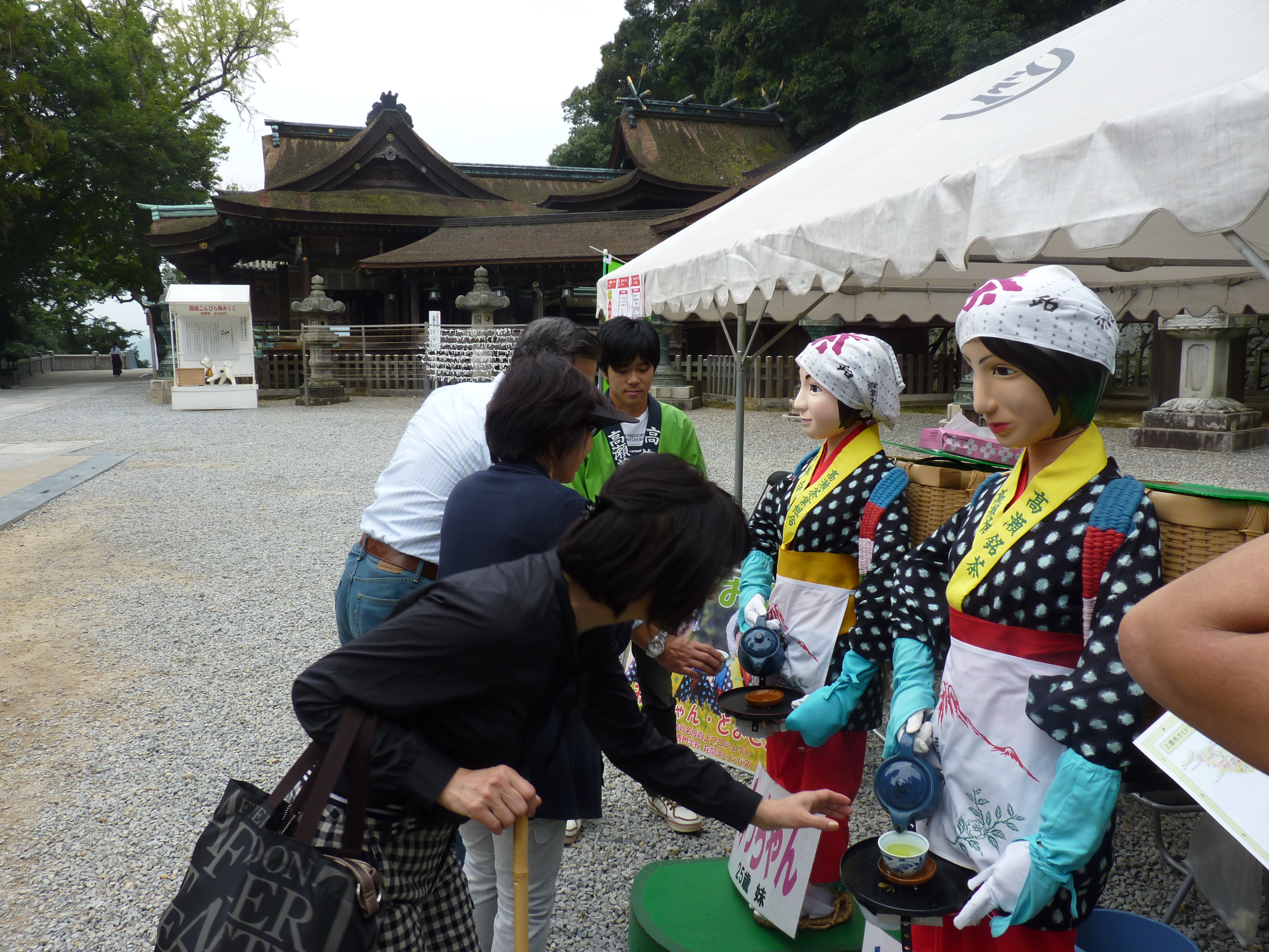 今年も3日間のうち、10日(祝)、11日(火)の2日間は高瀬茶業組合・三豊市・詫間キャンパス「TEAM ARK」によるお茶娘ロボット「みっちゃん・とよさん」が奉拝者や見物客の方々に高瀬冷茶のサービスを行いました。