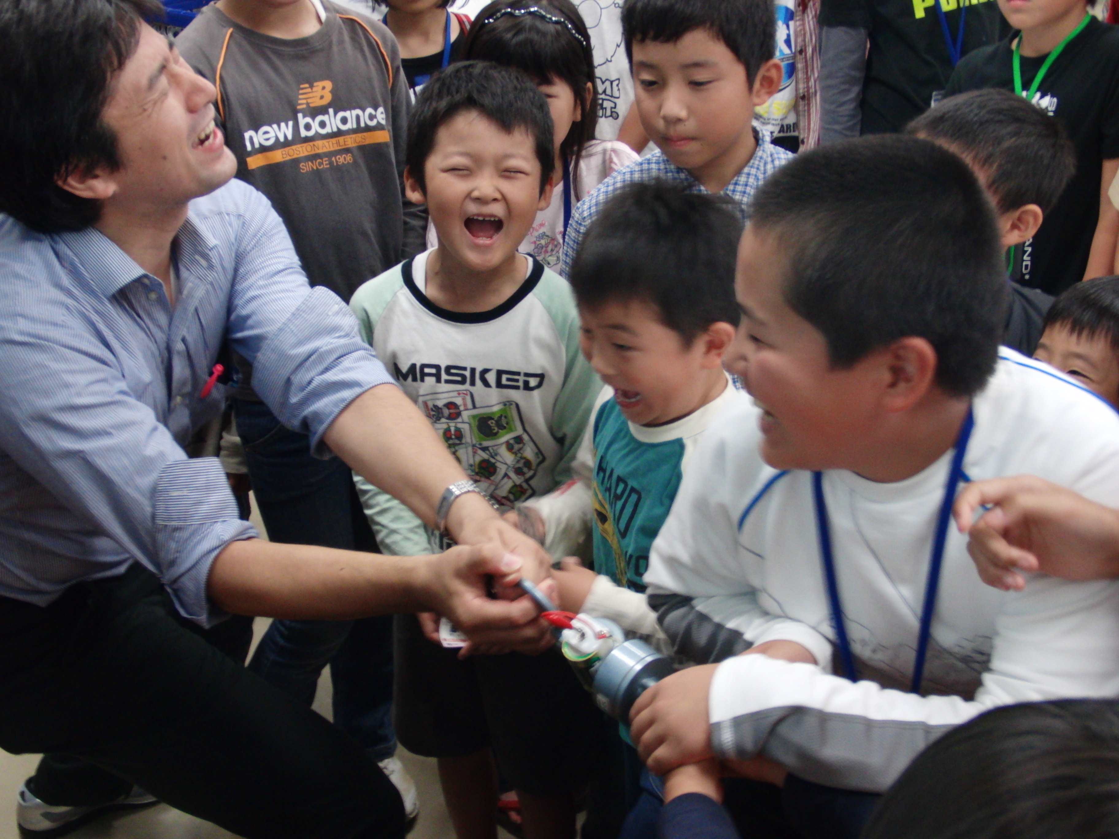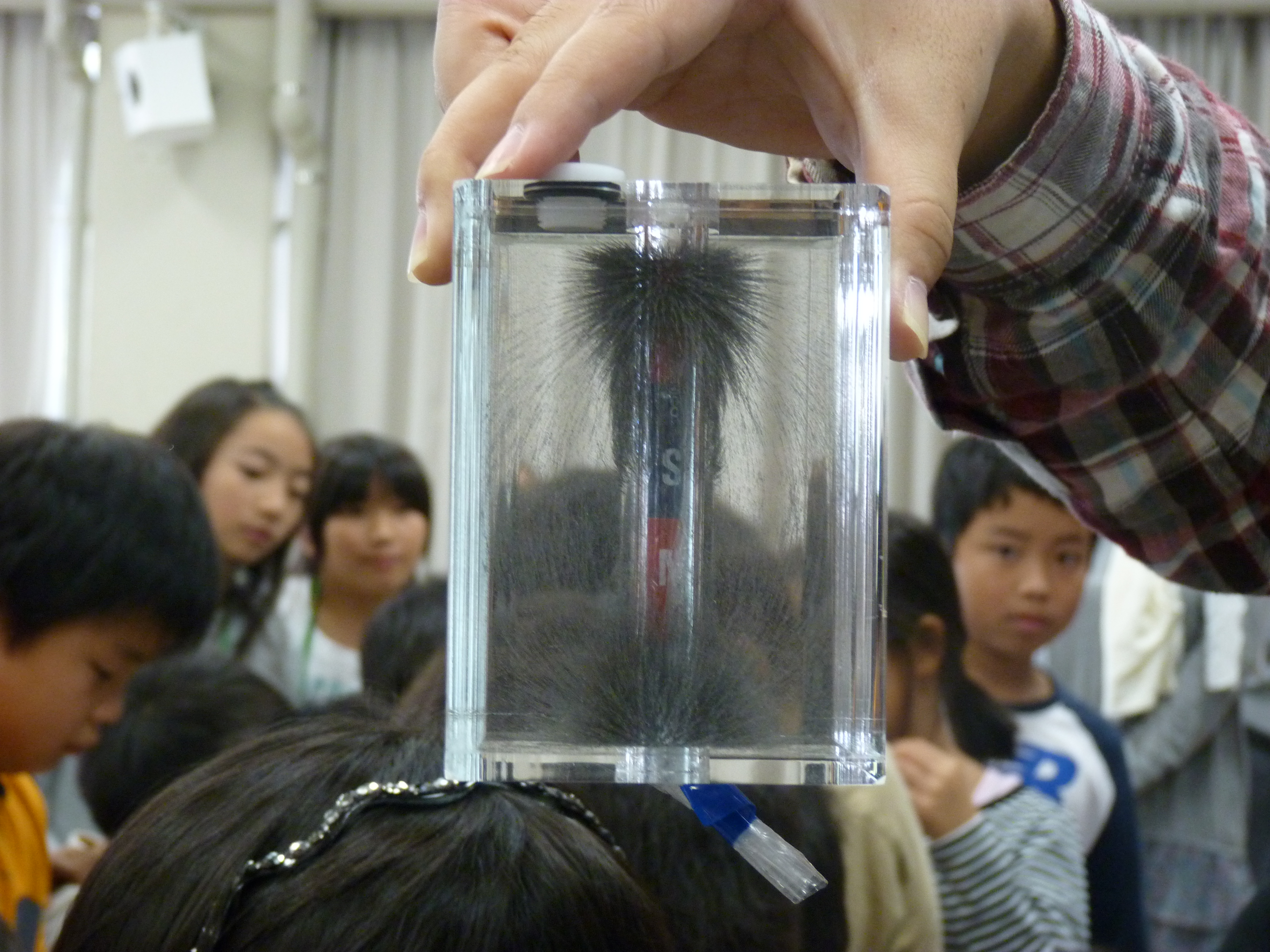 今回は熊本高専の東田先生と科学クラブDEXの学生による「磁石と磁界」について学習しました。 講義では磁石には、普段私たちが知っているもの以外にどのようなものがあるのか。また「ガウスの加速器」を使った磁石の実験を見せてもらいました。他に磁石まわりの磁界を見たりと、どれも子供たちには興味深く楽しい内容でした。