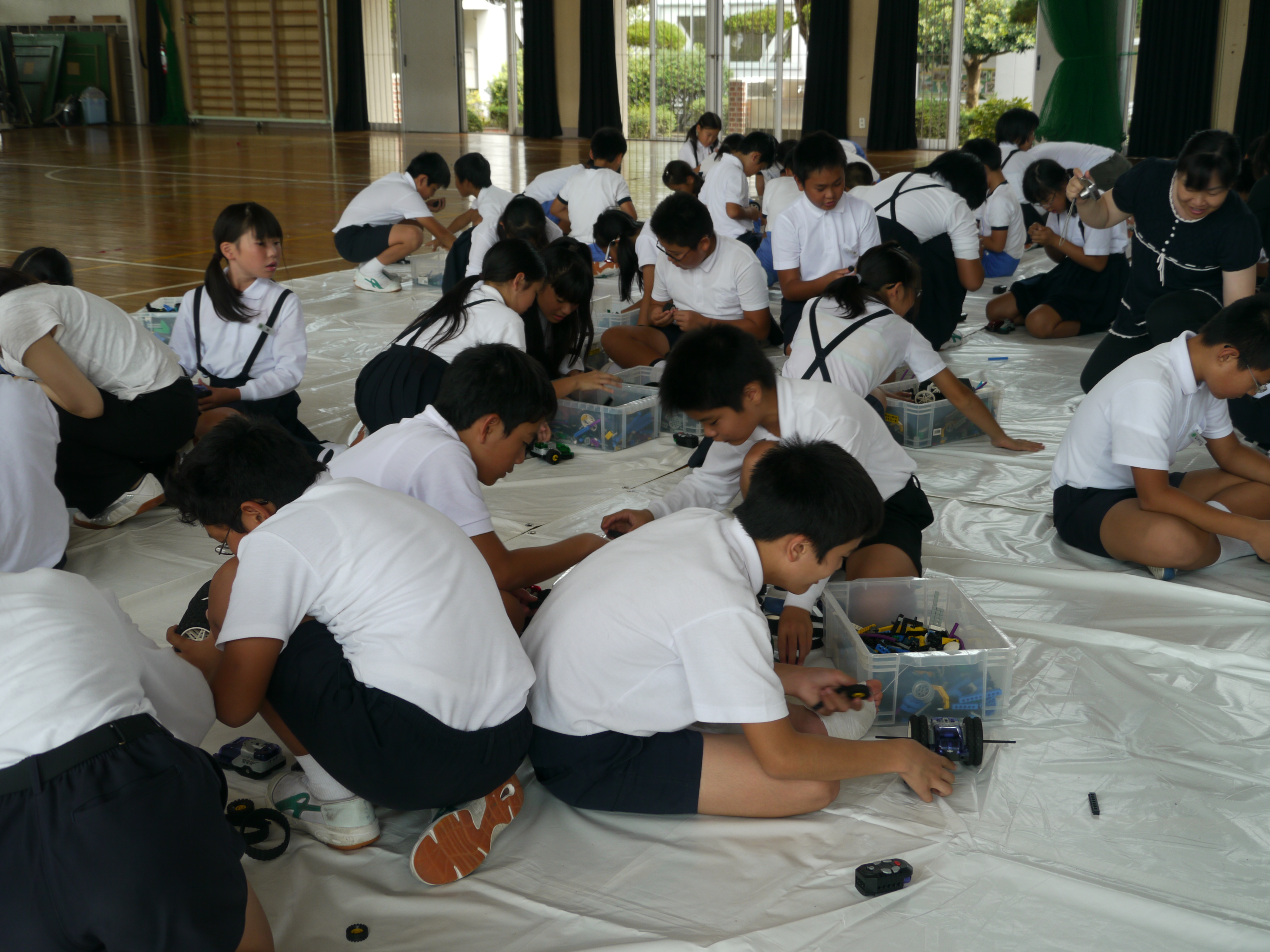 レゴを使ったロボット製作に移ると、「ARK」の学生に分からない所を質問しながら、ロボットに好みの部品を接続していく作業に夢中で取り組み、完成したロボットを友達と一緒に動かしてみたり、また新たな形に改良してみたりと、楽しい時間を過ごしました。途中、1年生も見学に訪れ、終始賑やかな雰囲気の中で教室を行う事ができ、たくさんの子供達に作る楽しさを経験していただけました。
