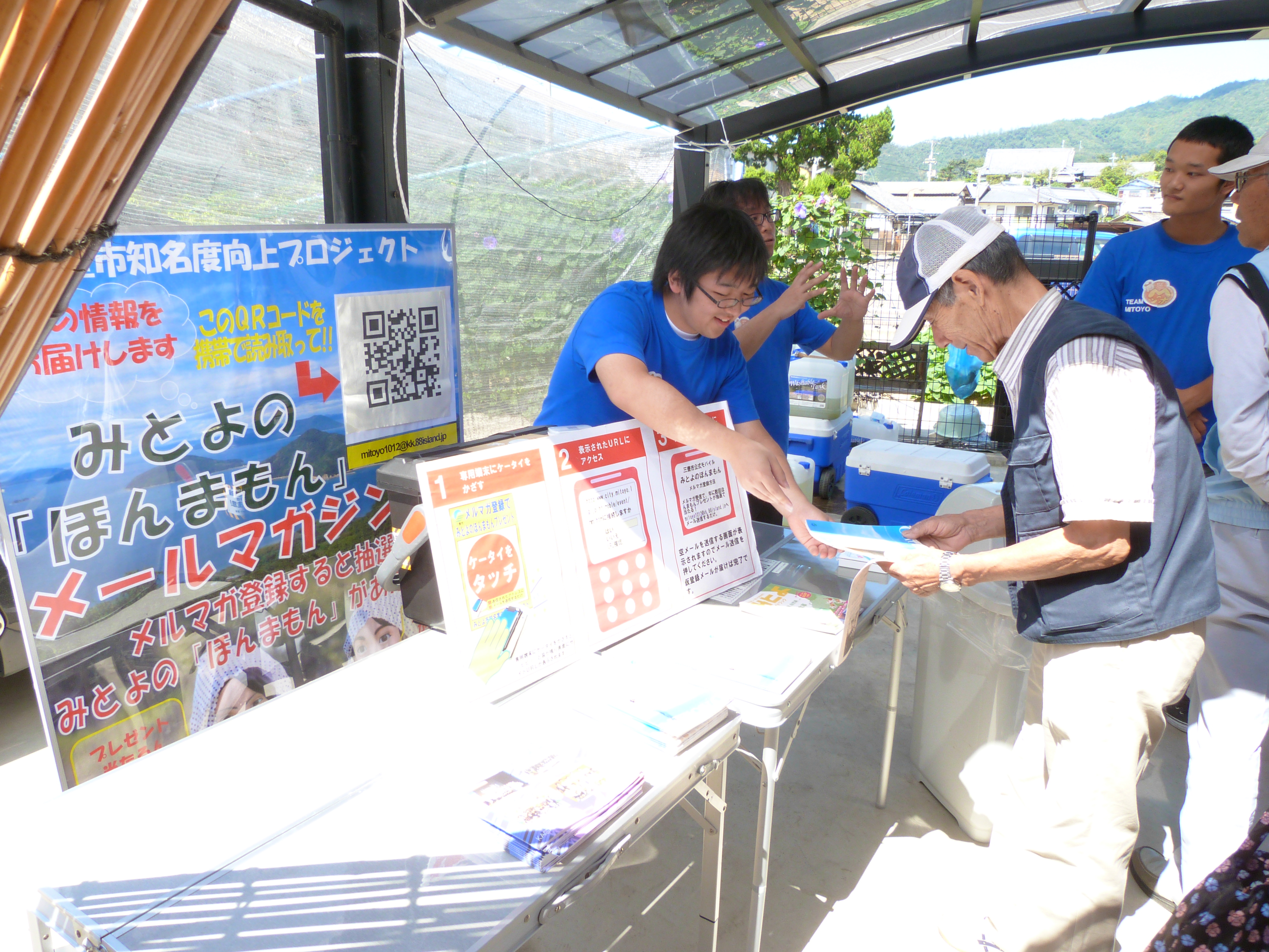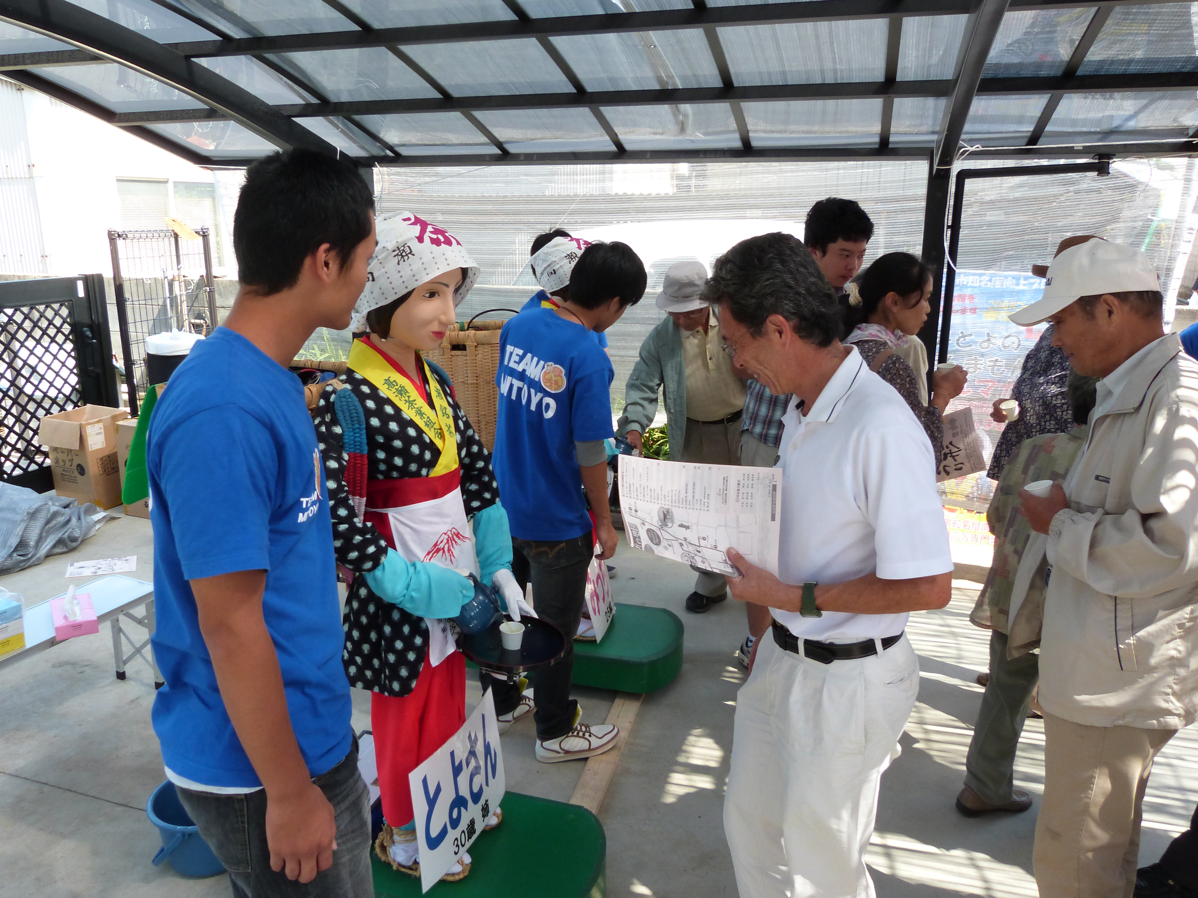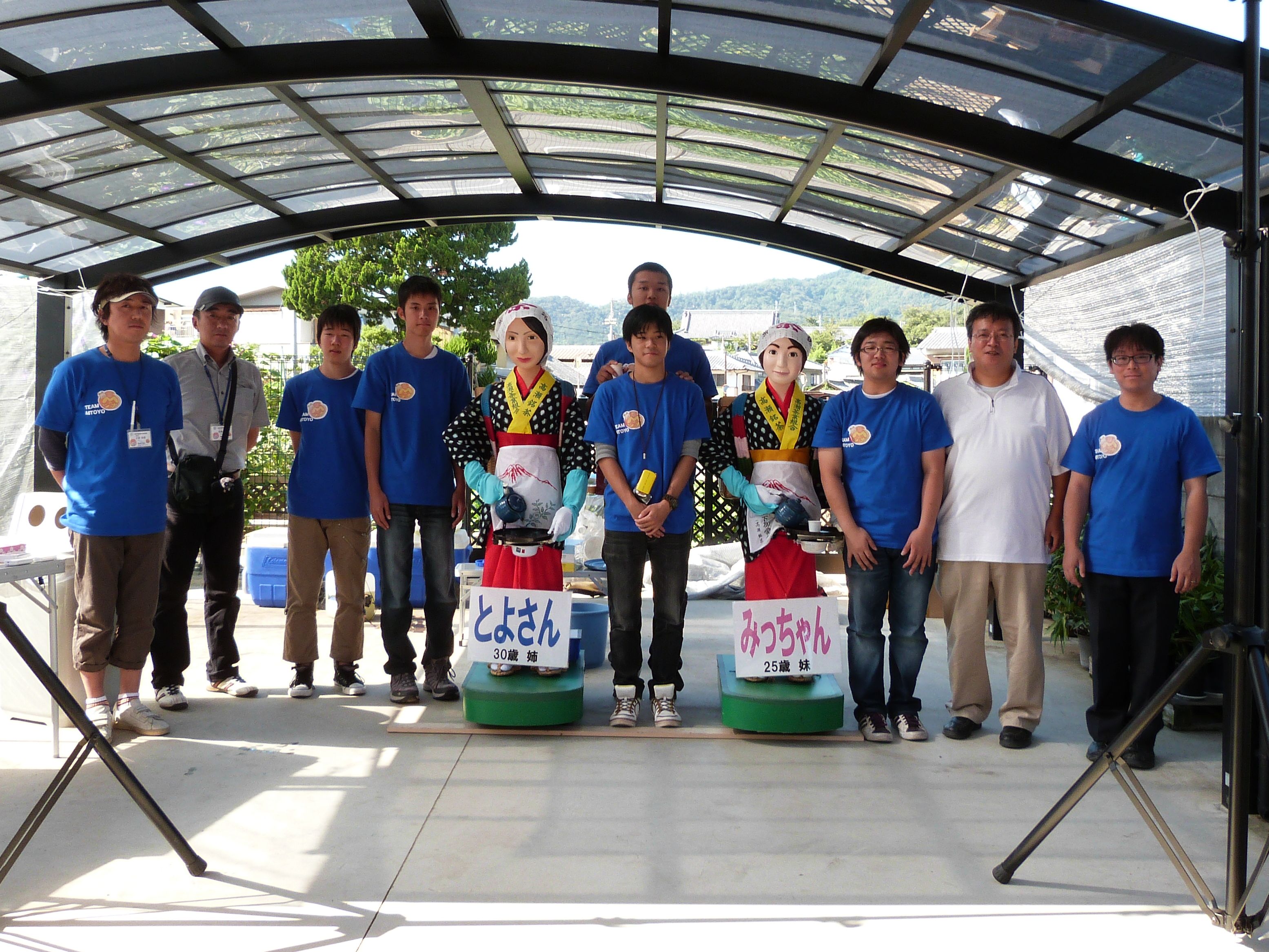 その中で三豊市が行っている「三豊市知名度向上プロジェクト」に、今年もお茶サービスロボット「みっちゃん・とよさん」が三豊市高瀬町のおいしい冷茶お接待で参加しました。天候にも恵まれ、昼間は気温が上昇したためたくさんの方々が冷たいお茶を求め、行列を作る盛況ぶりでした。また学生・教員が三豊市職員の方々と共にメールマガジンの登録やみとよ観光ガイドのPRを行いました。
