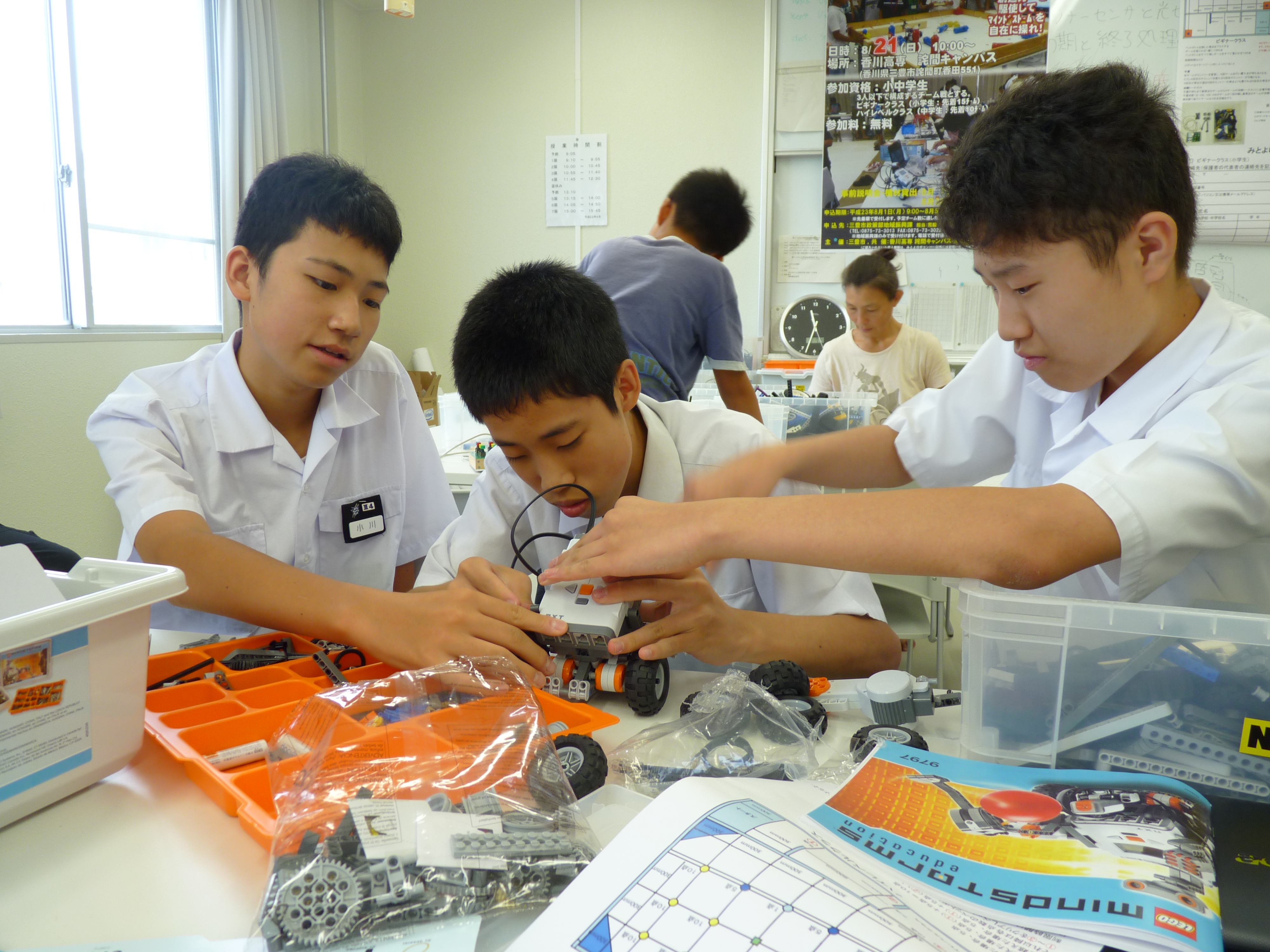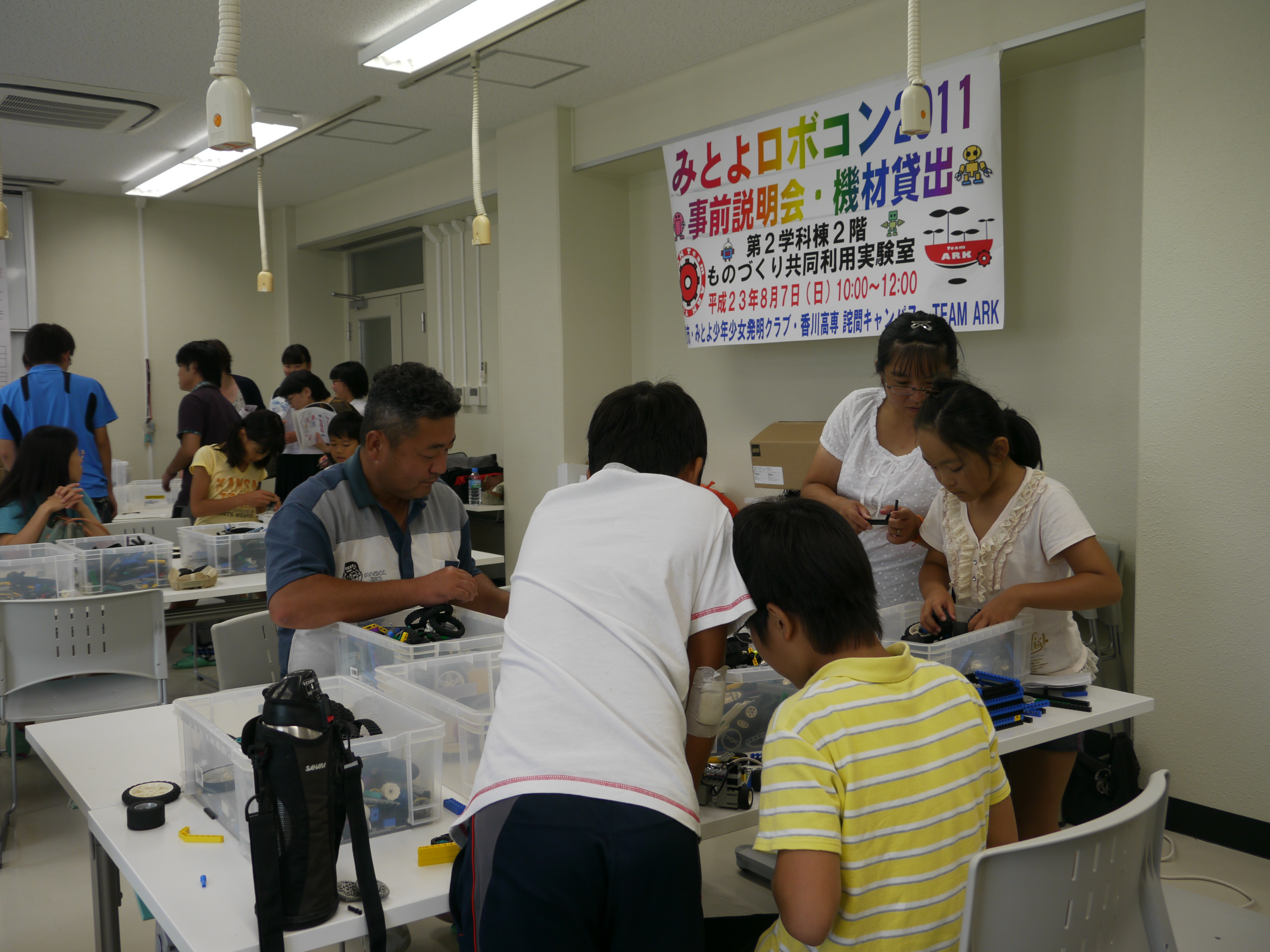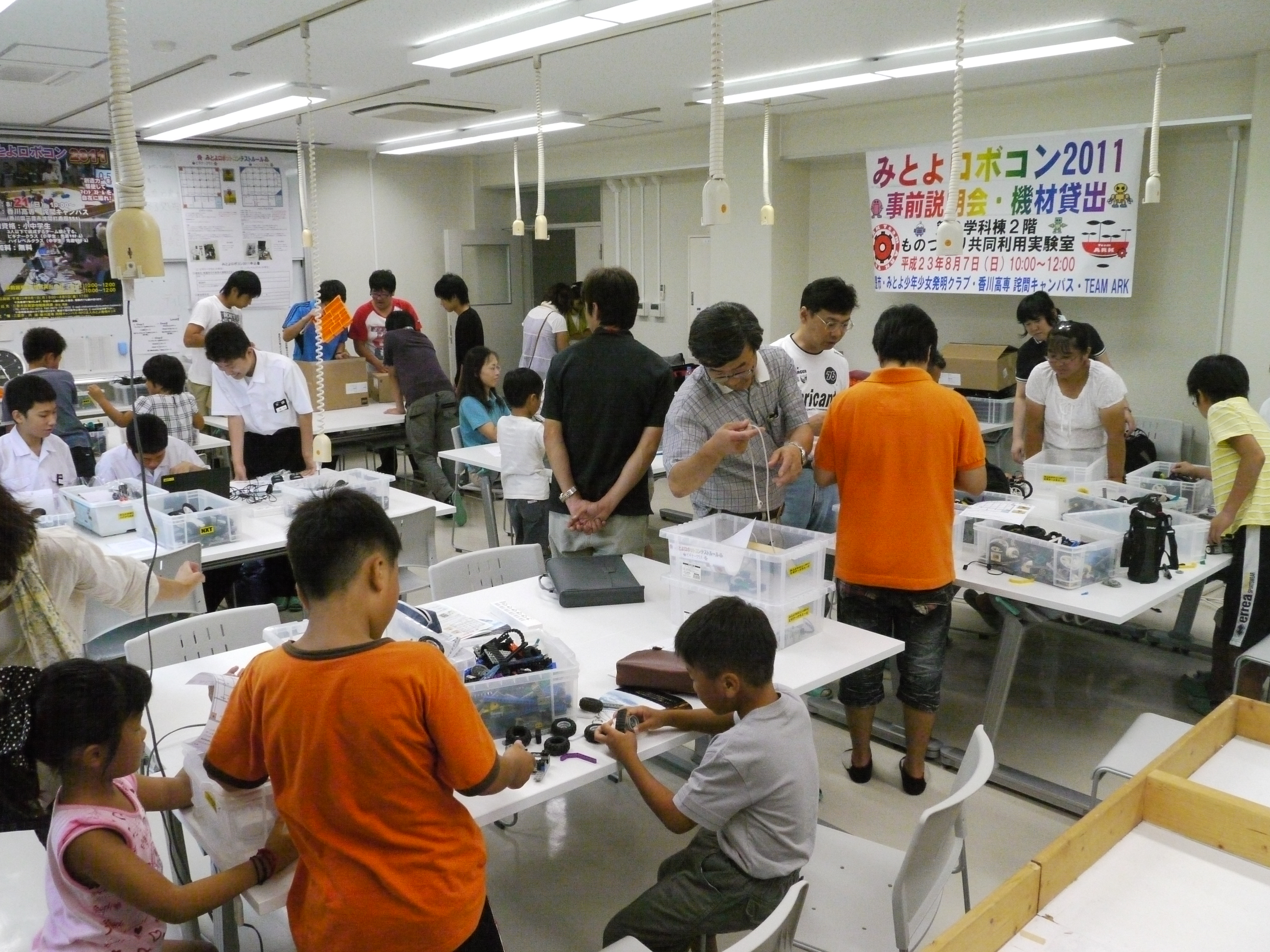 8月7日(日)の10:00~12:00、香川高専詫間キャンパス第2学科棟2階ものづくり共同利用実験室にて、「みとよロボコン2011事前説明会」が開催されました。8月21日(日)、本校で開催される「みとよロボコン2011」に向けて、ビギナークラス(小学生)とハイレベルクラス(中学生)にエントリーしている子供たちにロボットコンテストの説明会と機材の貸出をしました。説明のあとは、配られた物品の動作確認をしたり、分からないところはルール作成や当日の運営を行っているロボコンチーム「TEAM ARK」の学生からアドバイスを受けるなどしていました。