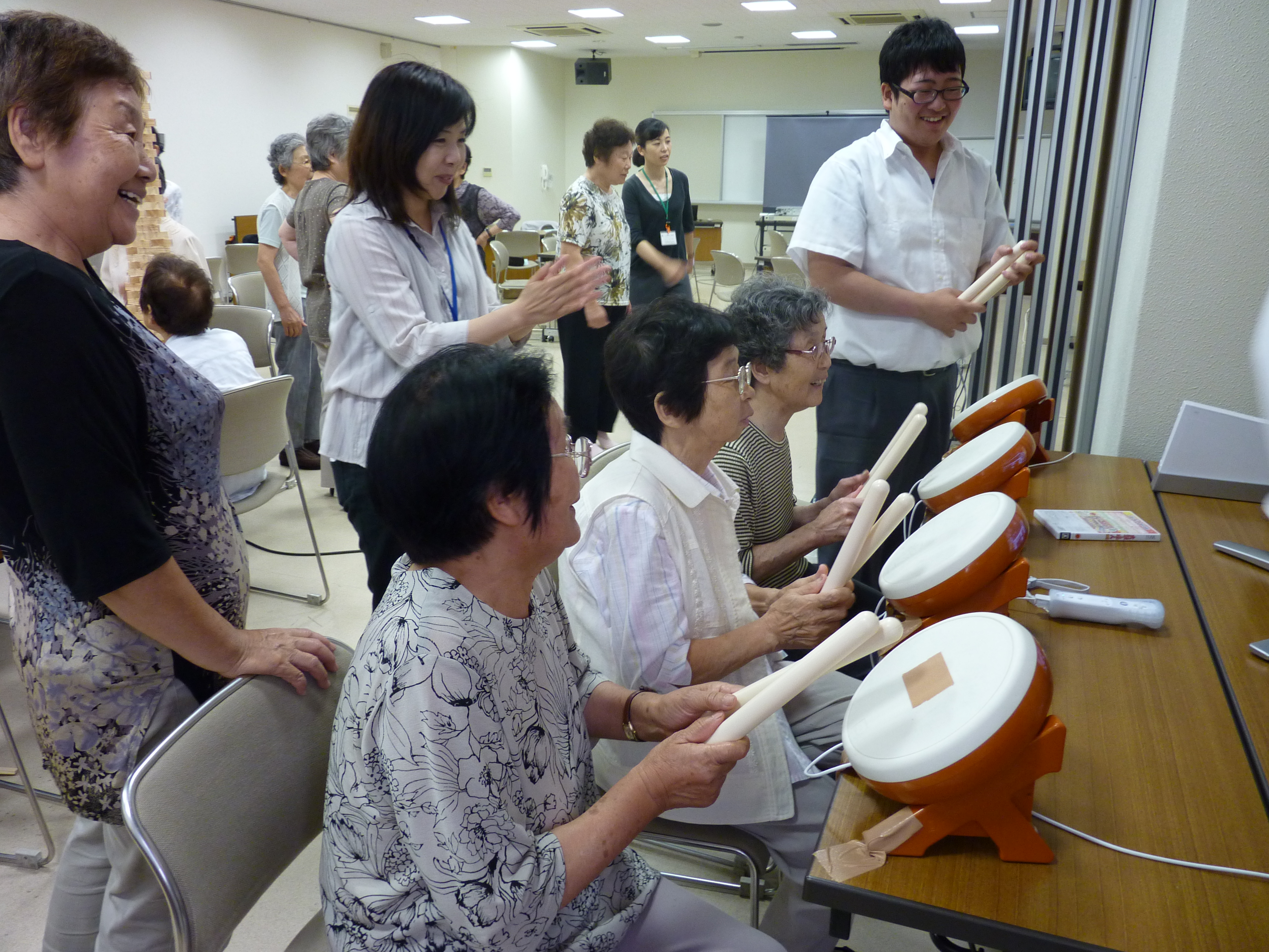 山本町保健センターにおいて、6月24日(金)に「脳きらり教室~Wiiを使った高齢者対策~」が開催されました。この教室は認知症・介護予防に関心のある65歳以上の方を対象としています。午後からのイベントでとても暑い中たくさんの方が足を運んでくれました。参加者は講話が始まると熱心に耳を傾け、時には大きく相槌を打つなどとても積極的でした。