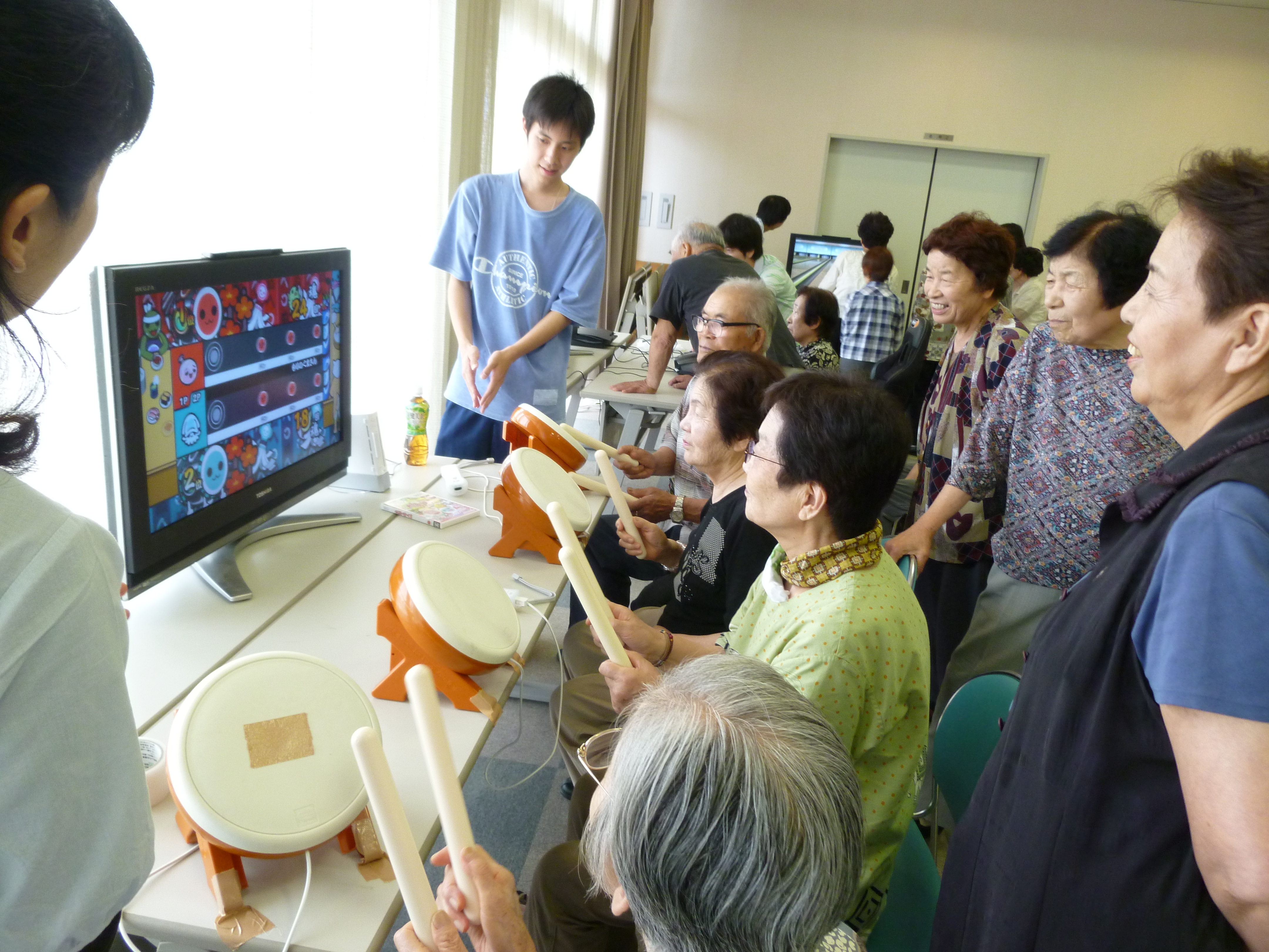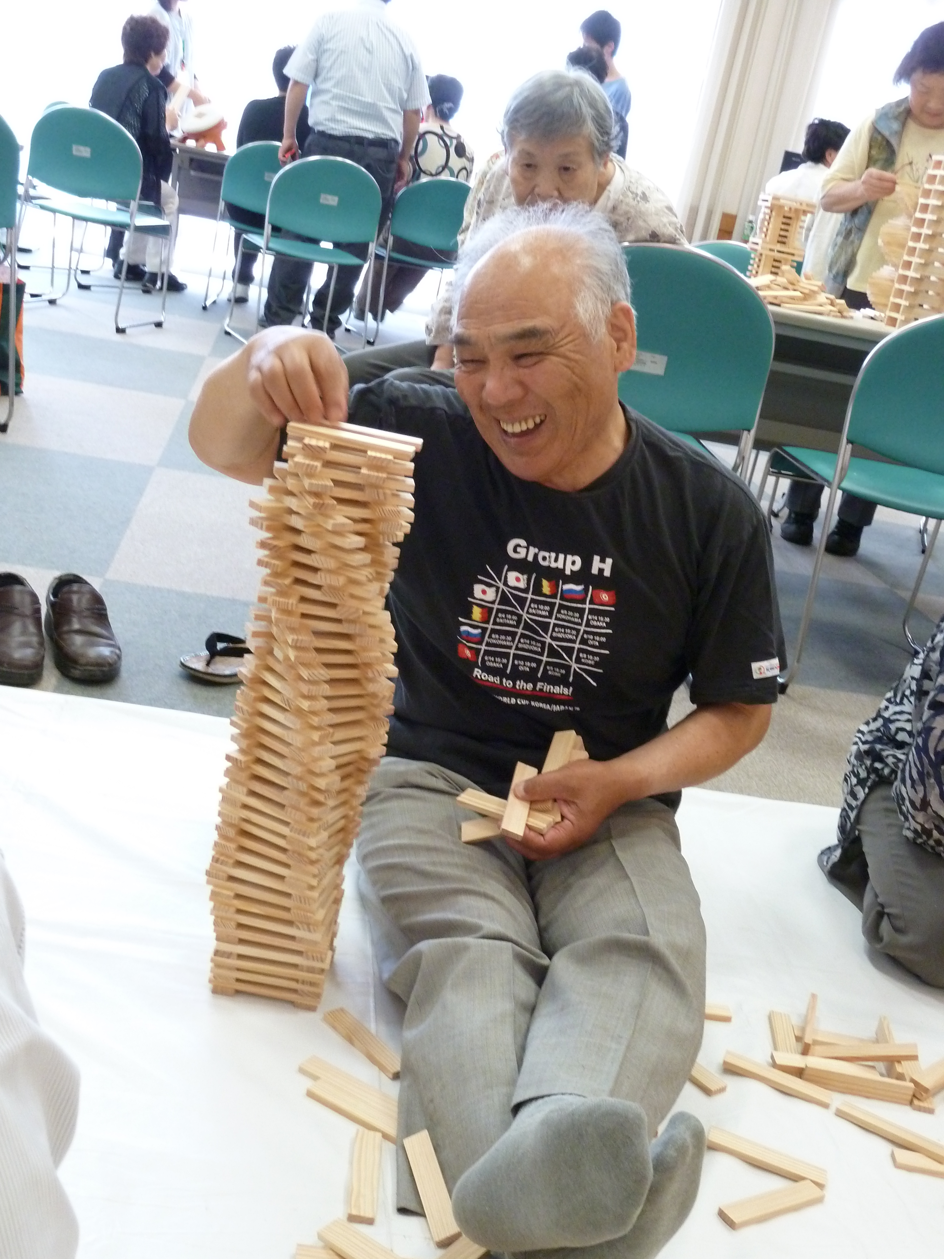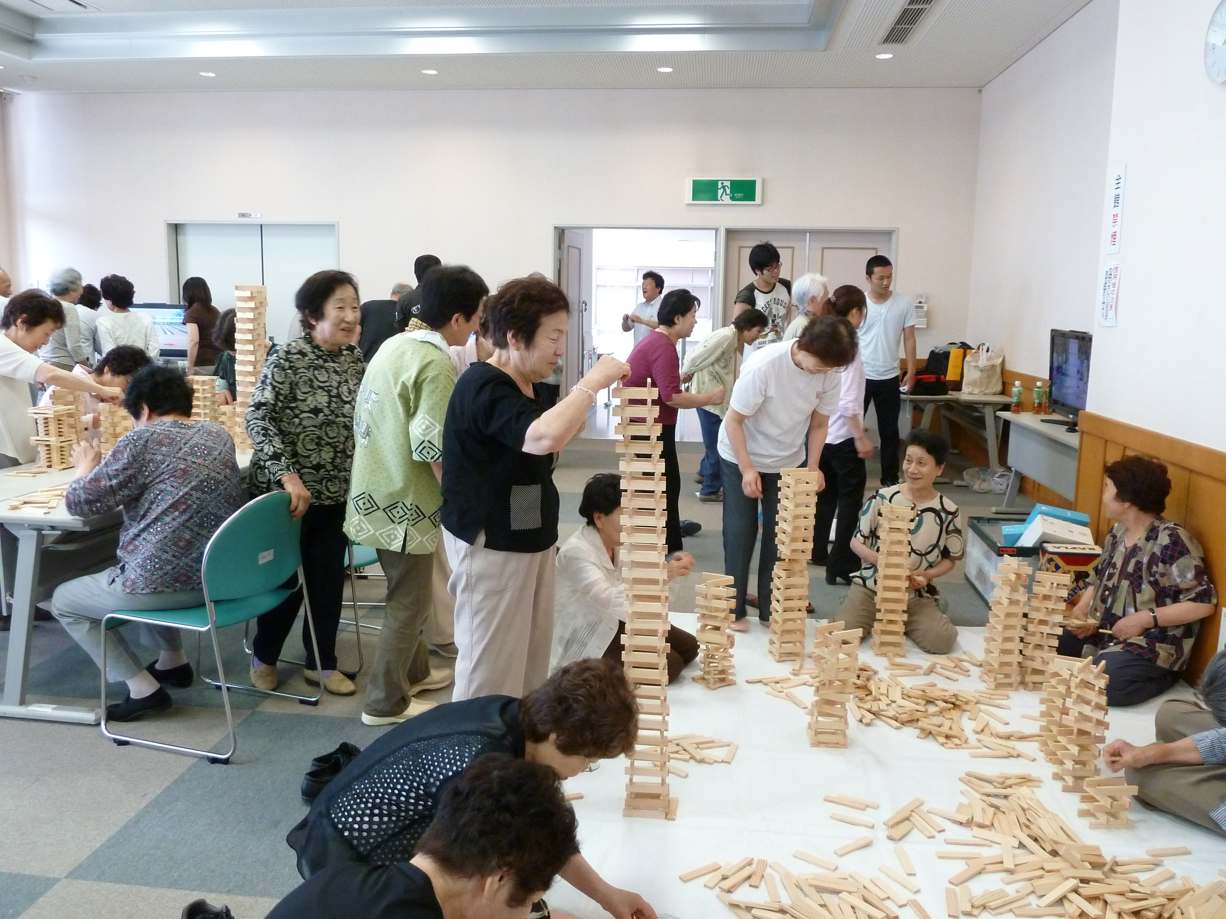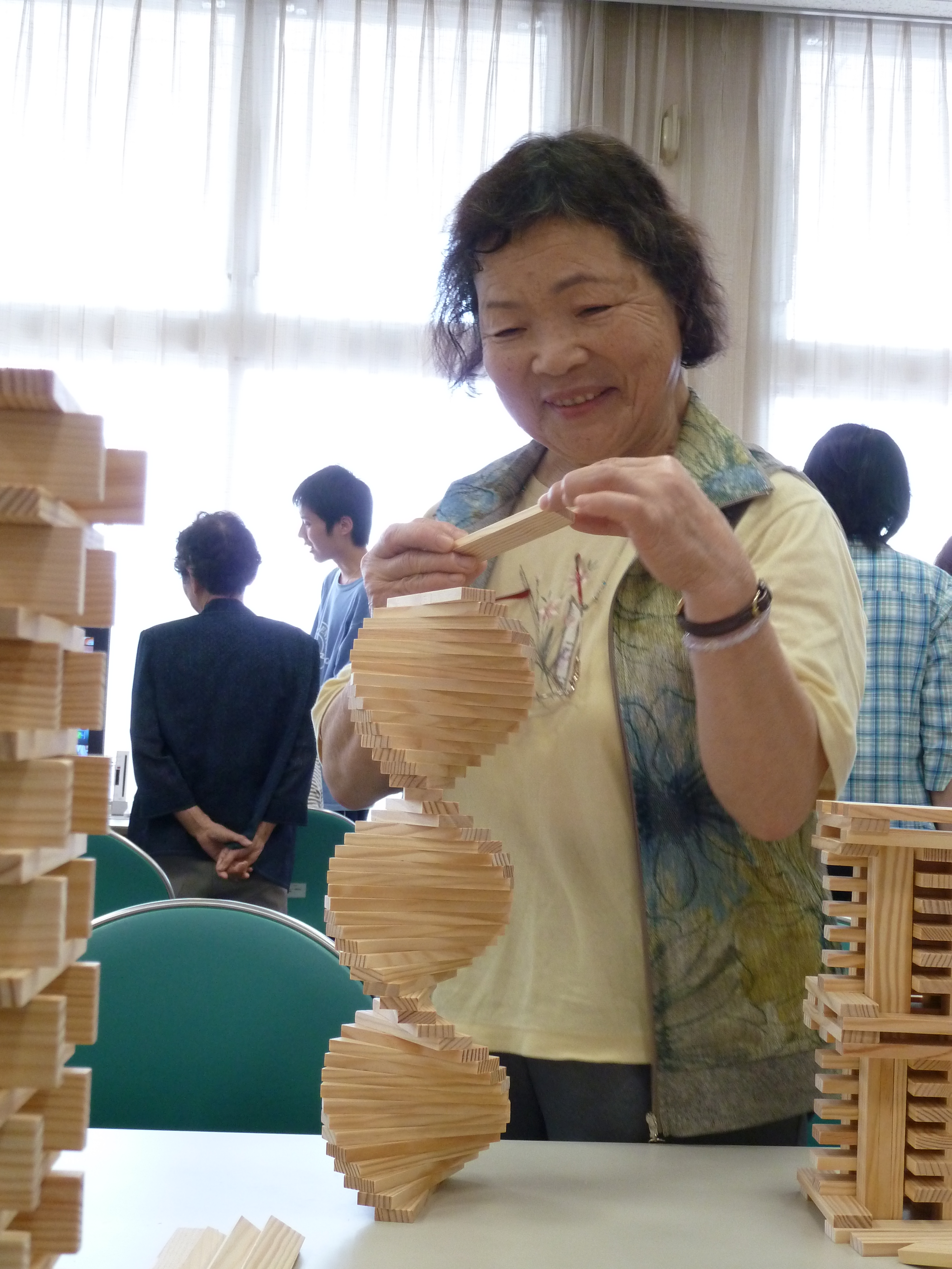 この日は気温も上がり暑い日となりましたが、大勢の方が意欲的に参加してくださいました。Wiiを使った太鼓のゲームや、有酸素運動では、ゲームを体験している人の周りで自分の順番を待ちながら何度も練習を繰り返す一生懸命な姿が印象的でした。木のブロック「カプラ」は高く積み上げる他にも工夫すれば様々な形を造ることができます。それぞれに自分の造りたい形を決め、根気よく取り組み、素晴らしい作品がたくさんできあがりました。また、この講座を通じて初対面の方同士が協力しながら「カプラ」を一生懸命積む姿も見られ、有意義な時間を過ごす事ができたと思います。