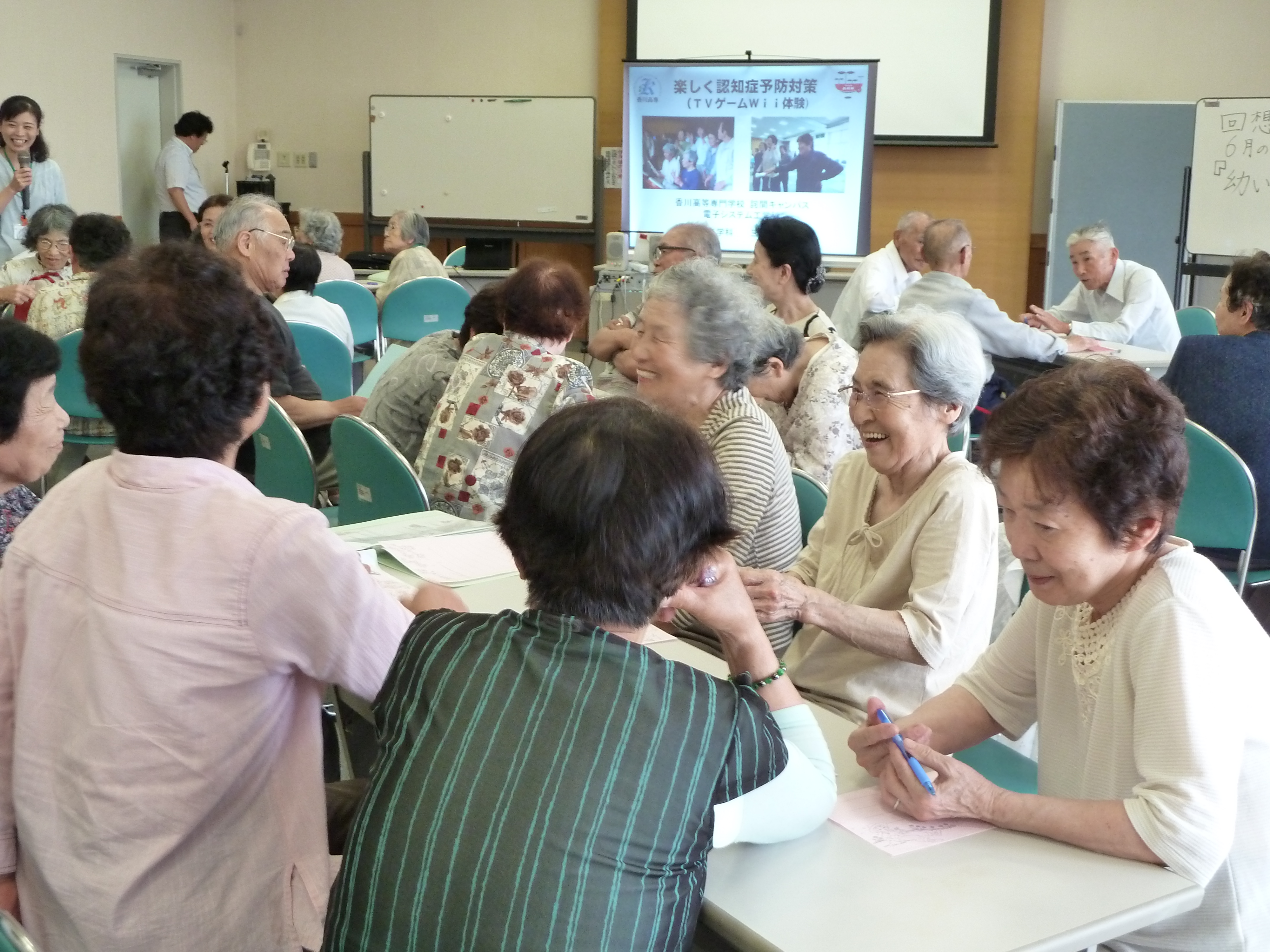 初めにいくつかのグループに分かれて「幼いころの遊び」をテーマに、子供の頃に経験した遊びや体験について「回想」をする時間が設けられました。この「回想」は認知症を予防する上で大変重要な役割を果たします。参加者は積極的に話し合い昔話で盛り上がっていました。