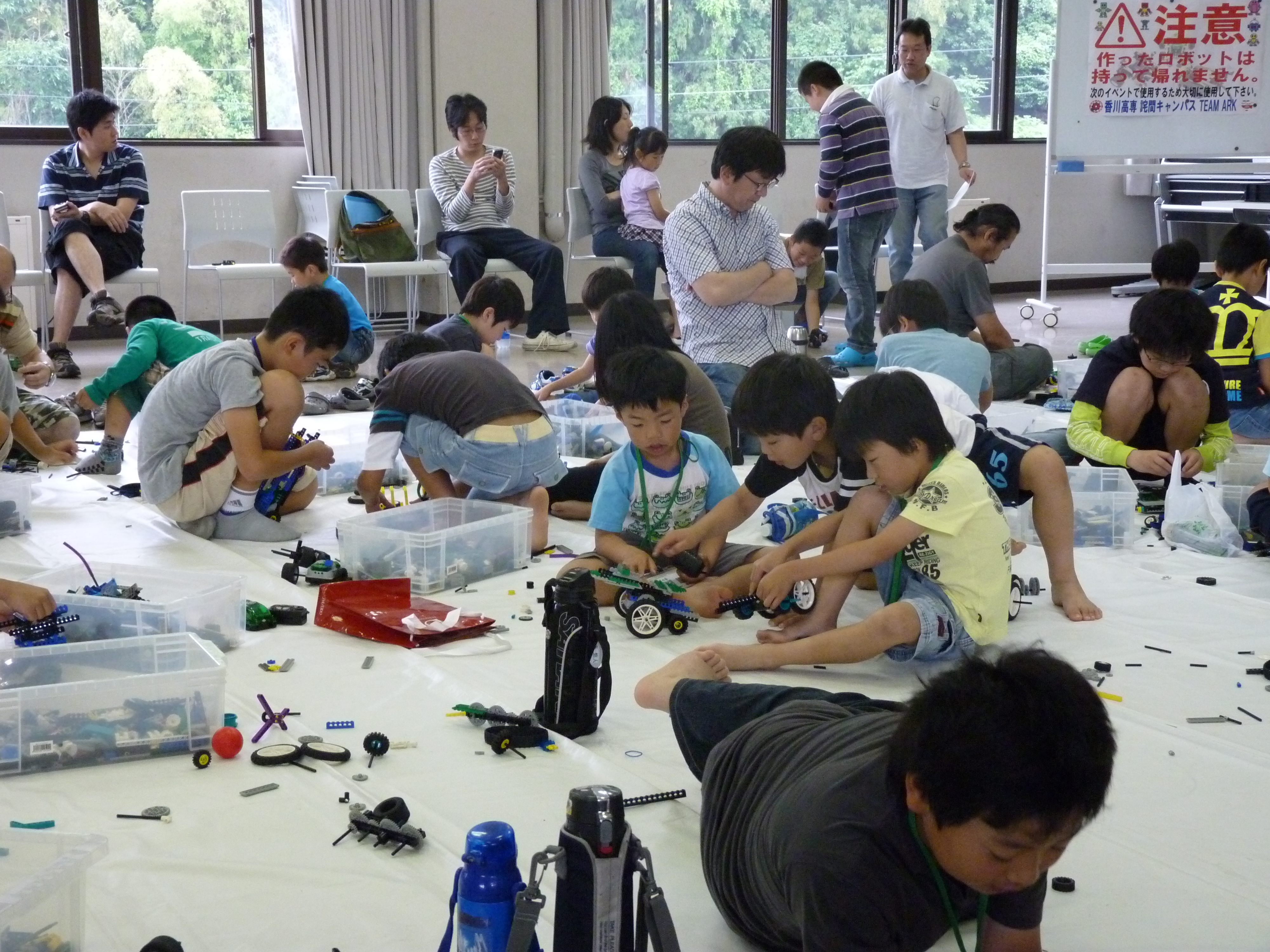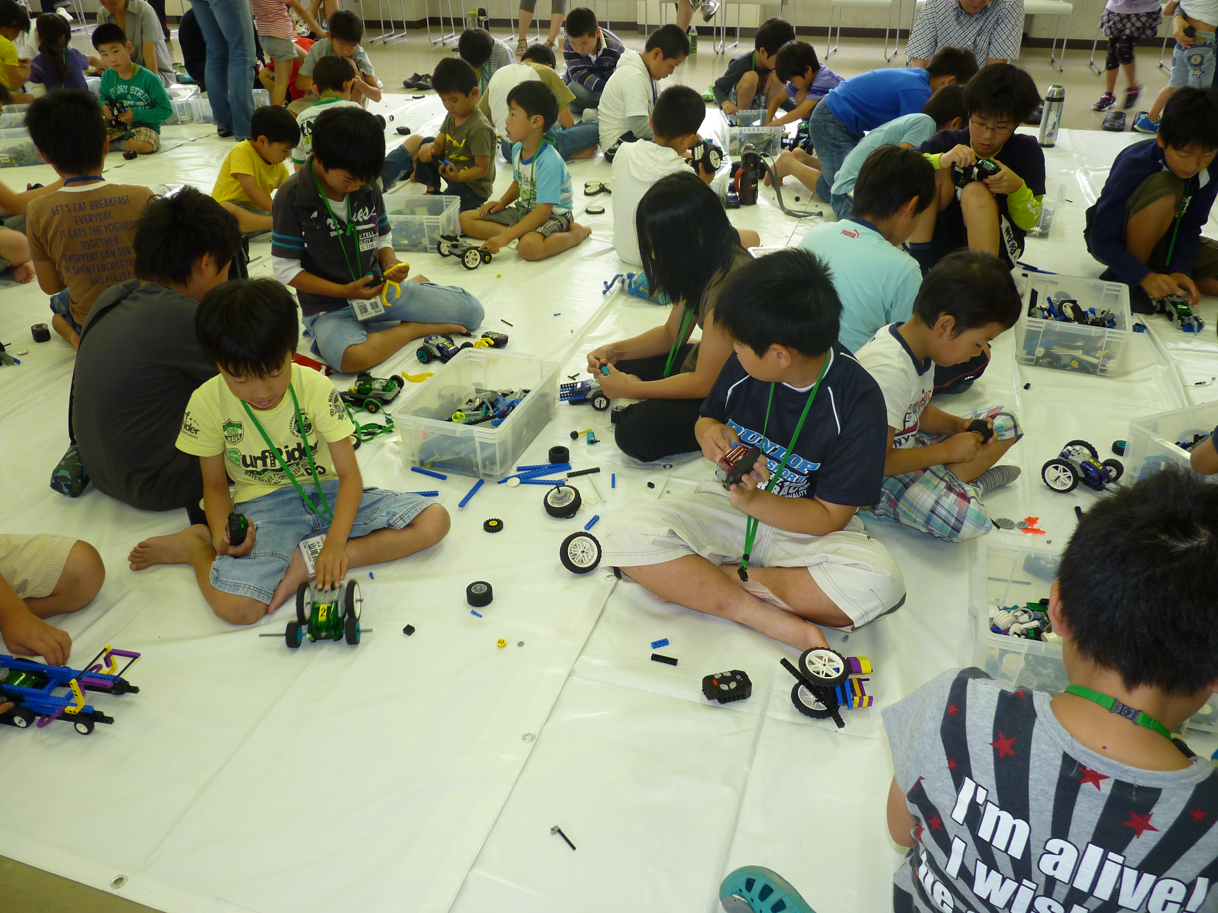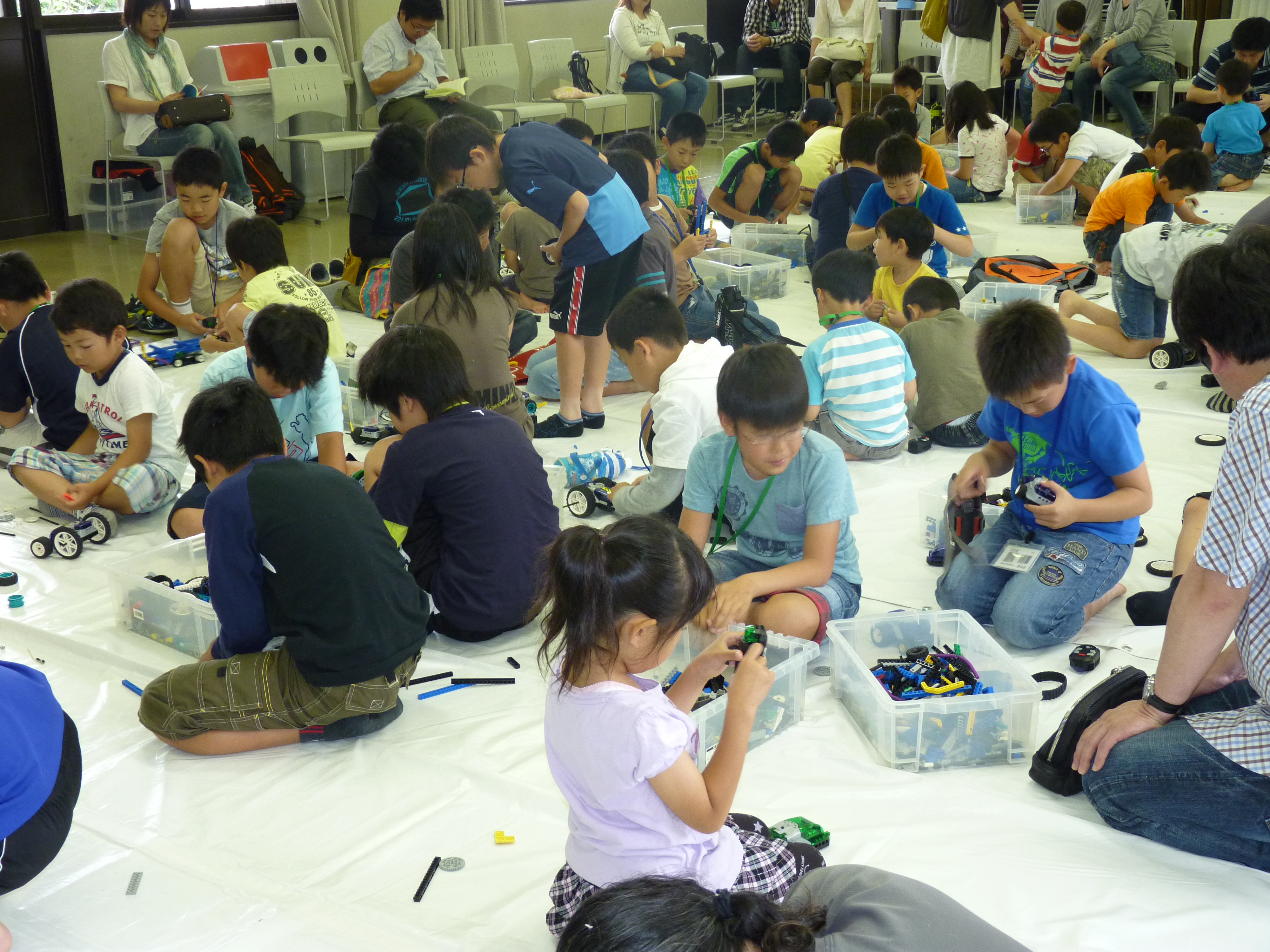 子供たちは受付を済ませるとすぐにロボットに製作に取りかかり、あっという間に会場はいっぱいになり熱気に溢れていました。3回目にもなると数百種類もあるブロックのパーツを迷うことなく次々組み立てていて、その光景にとても感心しました。また、小学生のお兄ちゃんお姉ちゃんと一緒に参加した小さな子ども達には、木の造形ブロック「KAPLA(カプラ)」で遊んでもらいました。