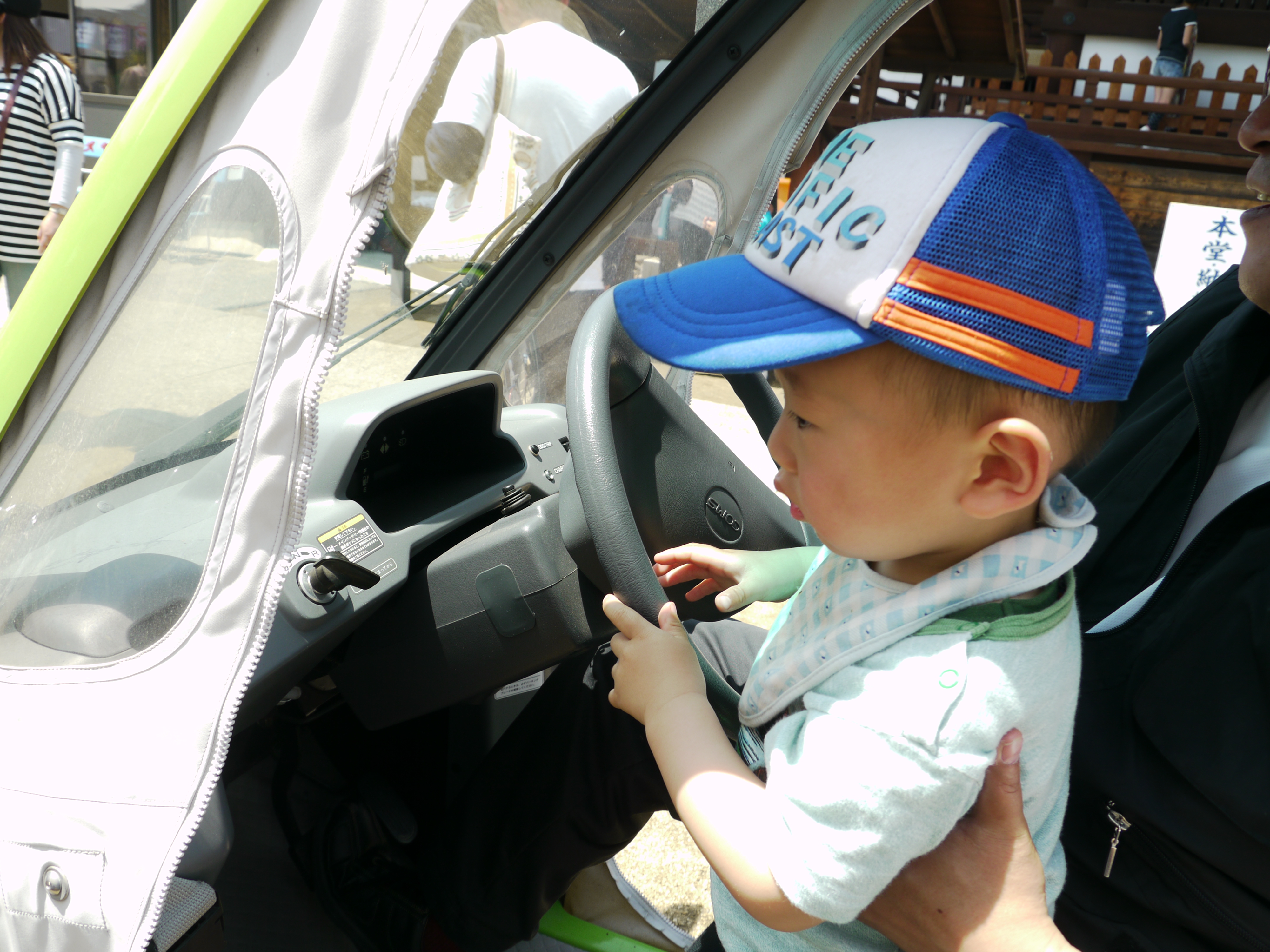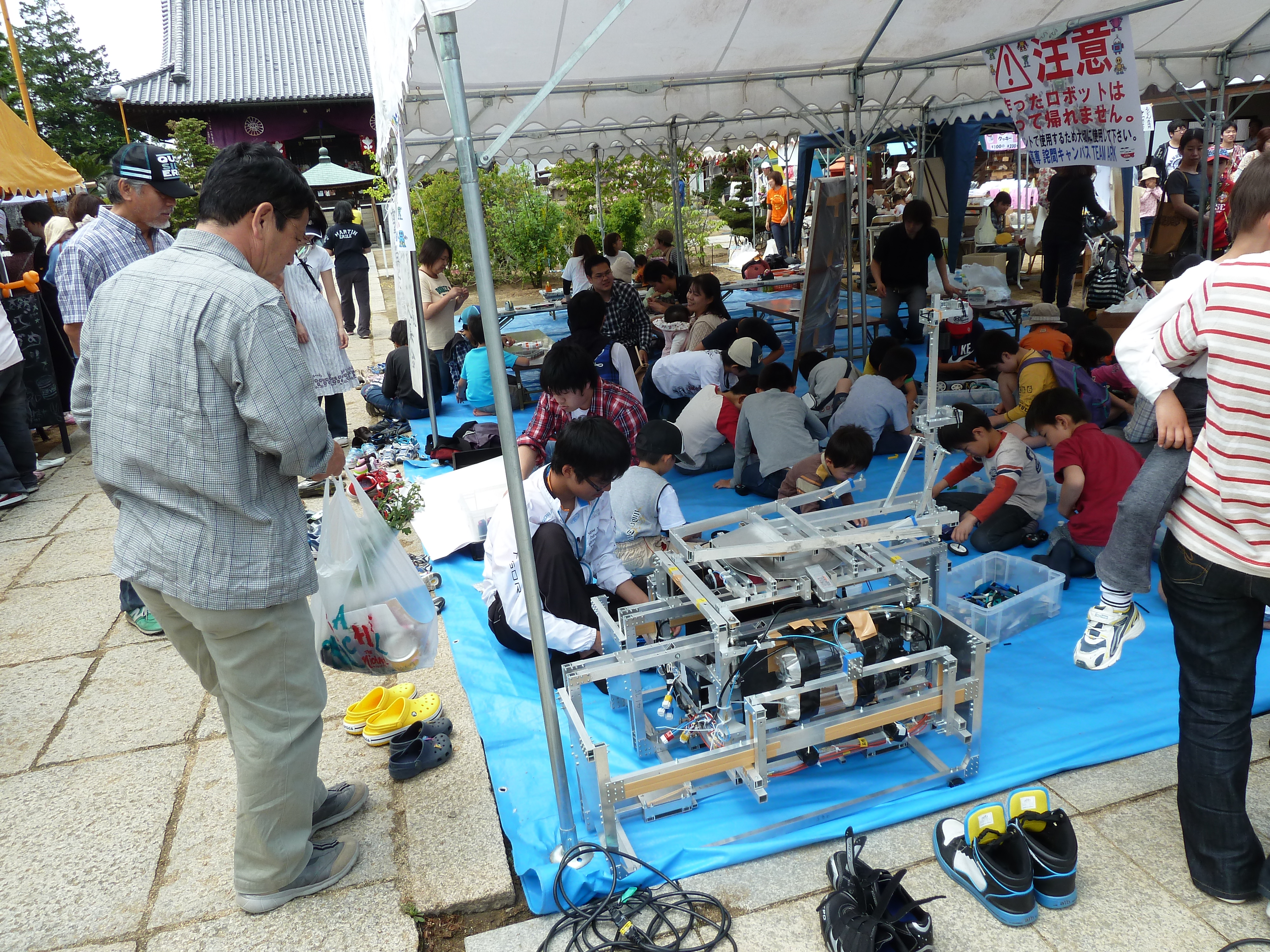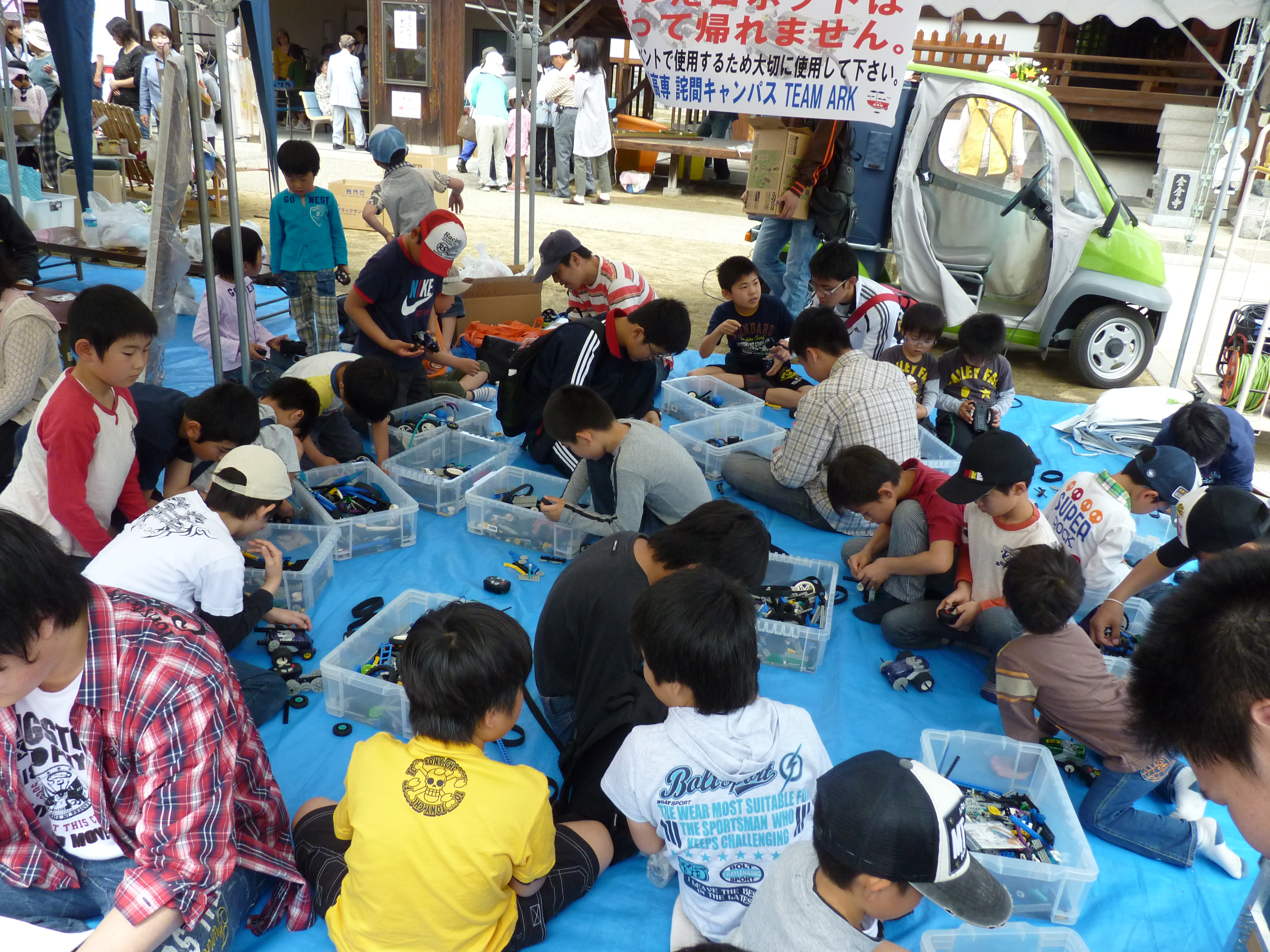 詫間キャンパスロボコンチーム「ARK」は、8日(日)にレゴブロックで作る「簡単ロボット教室」、高専ロボコン出場の「ロボット展示」、「電気自動車試乗」を開催しました。この日は各地で夏日を観測する暑い一日でしたが、子供達は夢中でロボット作りに取り組み、出来上がったロボットを動かして楽しんでいました。高専ロボコン出場ロボット「サイクロン」展示コーナーでは、通りすがりの人が次々と足を止め、興味深く観察したり、質問をして下さったりしました。また、電気自動車に試乗して、境内のドライブを楽しむ子供達の笑顔も印象的でした。