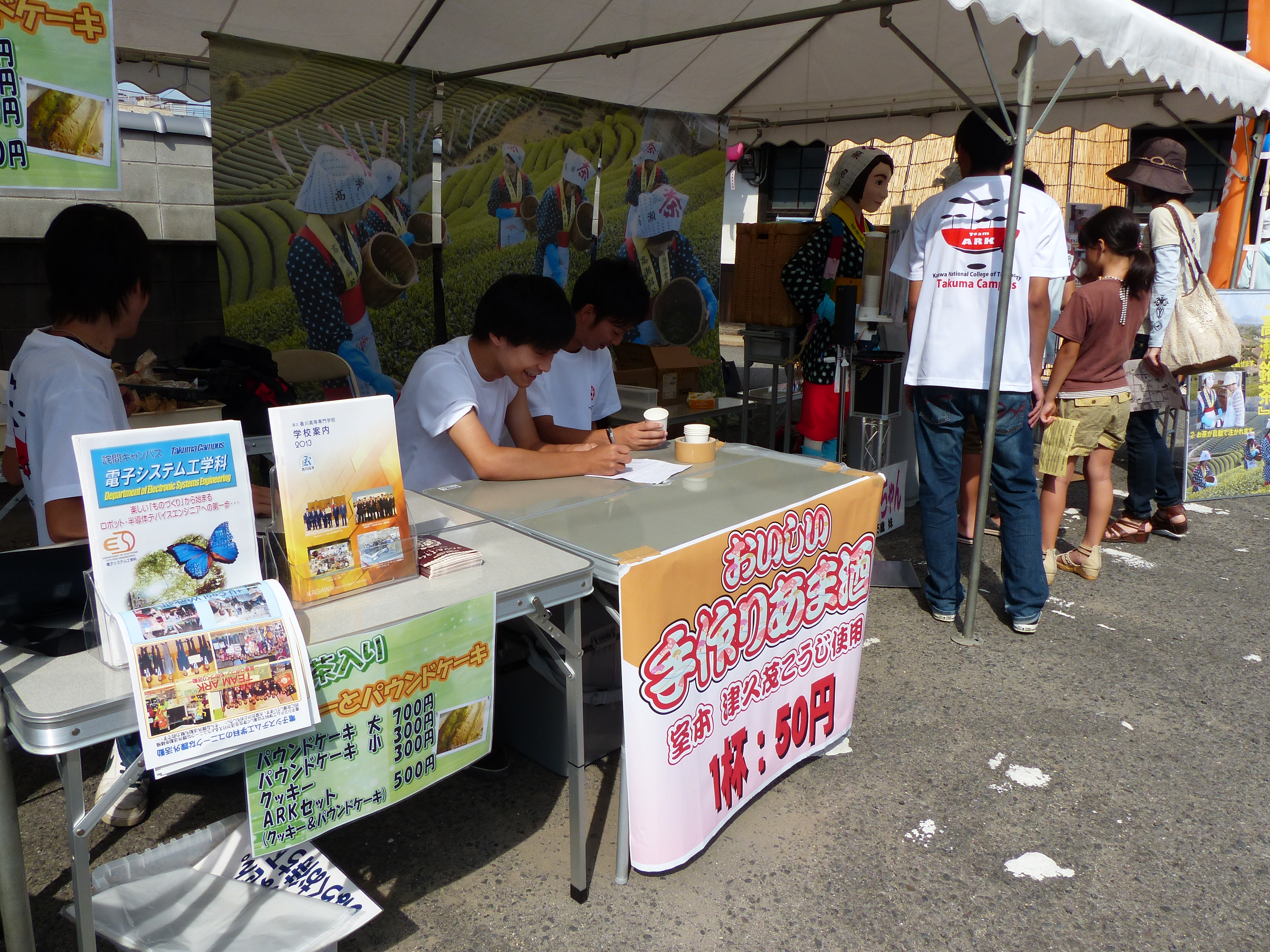 今年もたくさんの方が冷茶サービスに列を作ってくださり、手をかざすとコップが出てくる装置や、自動でお茶が注がれる様子、自動で蓋が開くゴミ箱などを楽しみながらおいしい高瀬茶を味わっていただけました。また学生が製作した高瀬茶を練り込んだクッキーやパウンドケーキ、秋まつりに欠かせない手作りあま酒の販売も大変喜ばれ、地域と一体になって活動する本校の取り組みをたくさんの方に知っていただけました。