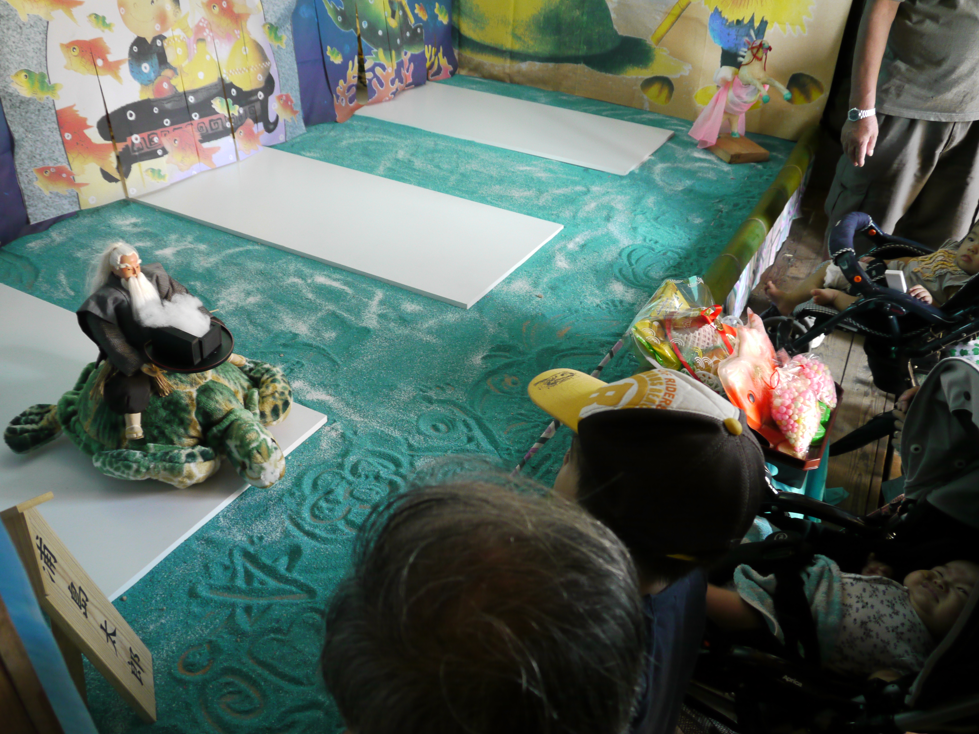 本校からは今年も「浦島太郎」の人形を展示。亀に乗った浦島太郎の人形、モニターに映しだされた海の景色や浦島太郎の動画がお話に合わせて動き、家族連れや子供達の人気を集めていました。