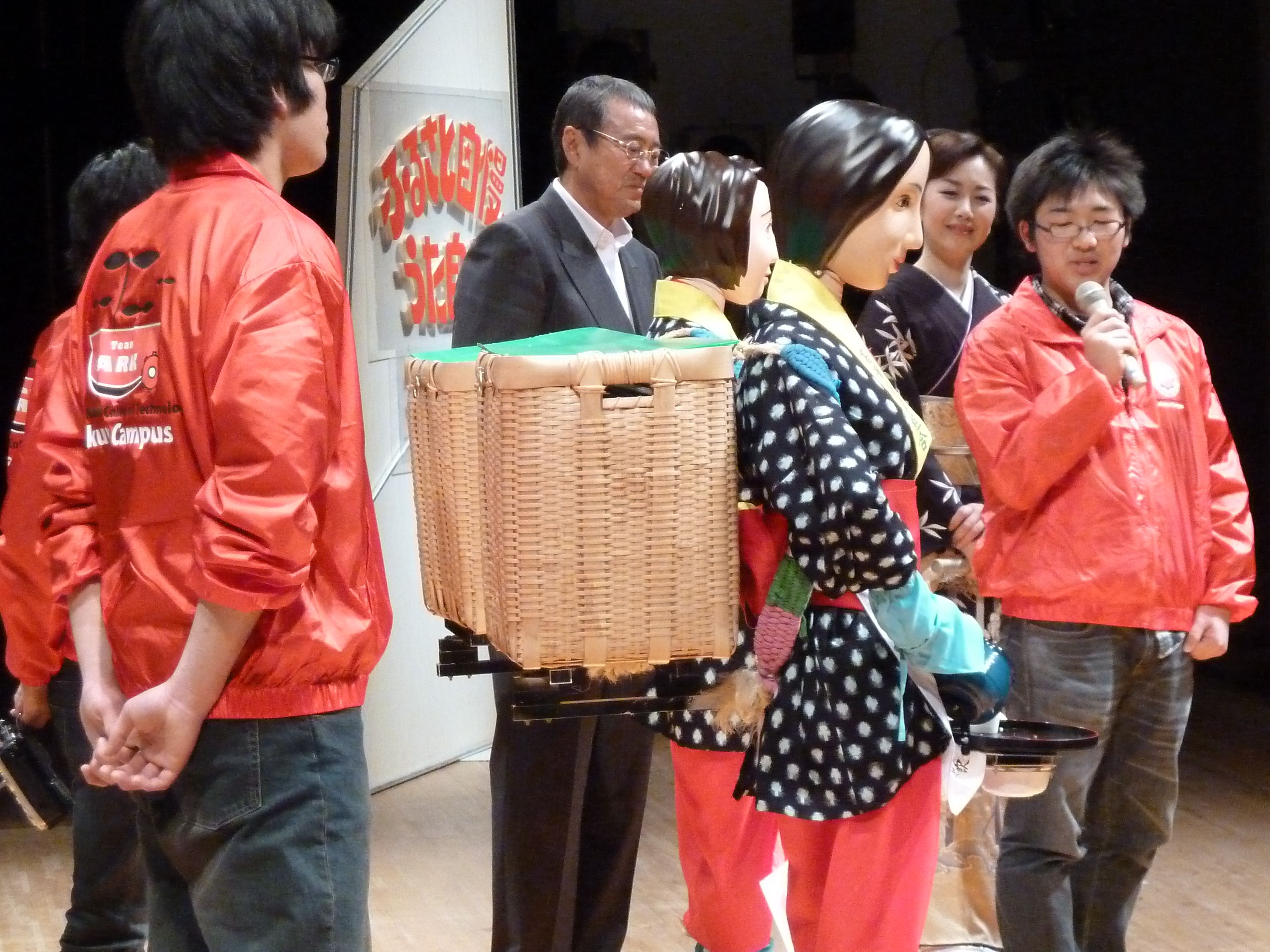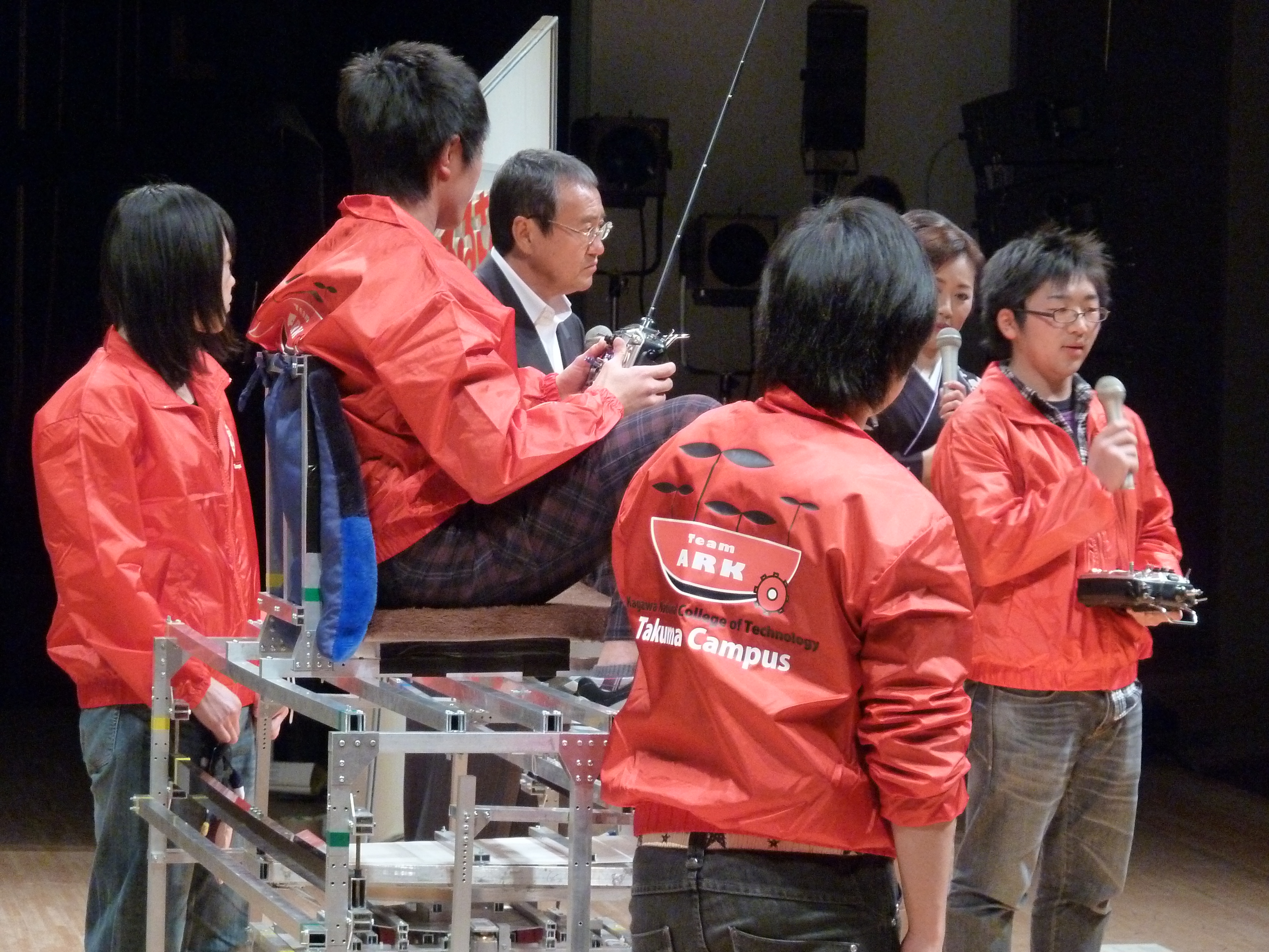 本校の高専ロボコンに出場した「サイクロン」とお茶サービスロボット「みっちゃん・とよさん」は、番組内でその土地の名人、達人、有名人を登場させる「クイズ ふるさとの星」のコーナーでゲストへのクイズ形式で登場。ステージ上に学生と共に「サイクロン」 「みっちゃん・とよさん」が登場すると、会場は割れんばかりの拍手で歓迎してくれました。「サイクロン」の実演、「みっちゃん・とよさん」からゲストのお二人に冷茶をサービスするなど、地域色豊かな楽しい収録ができ、会場に訪れていた地元の方とも一体になれたひとときでした。
