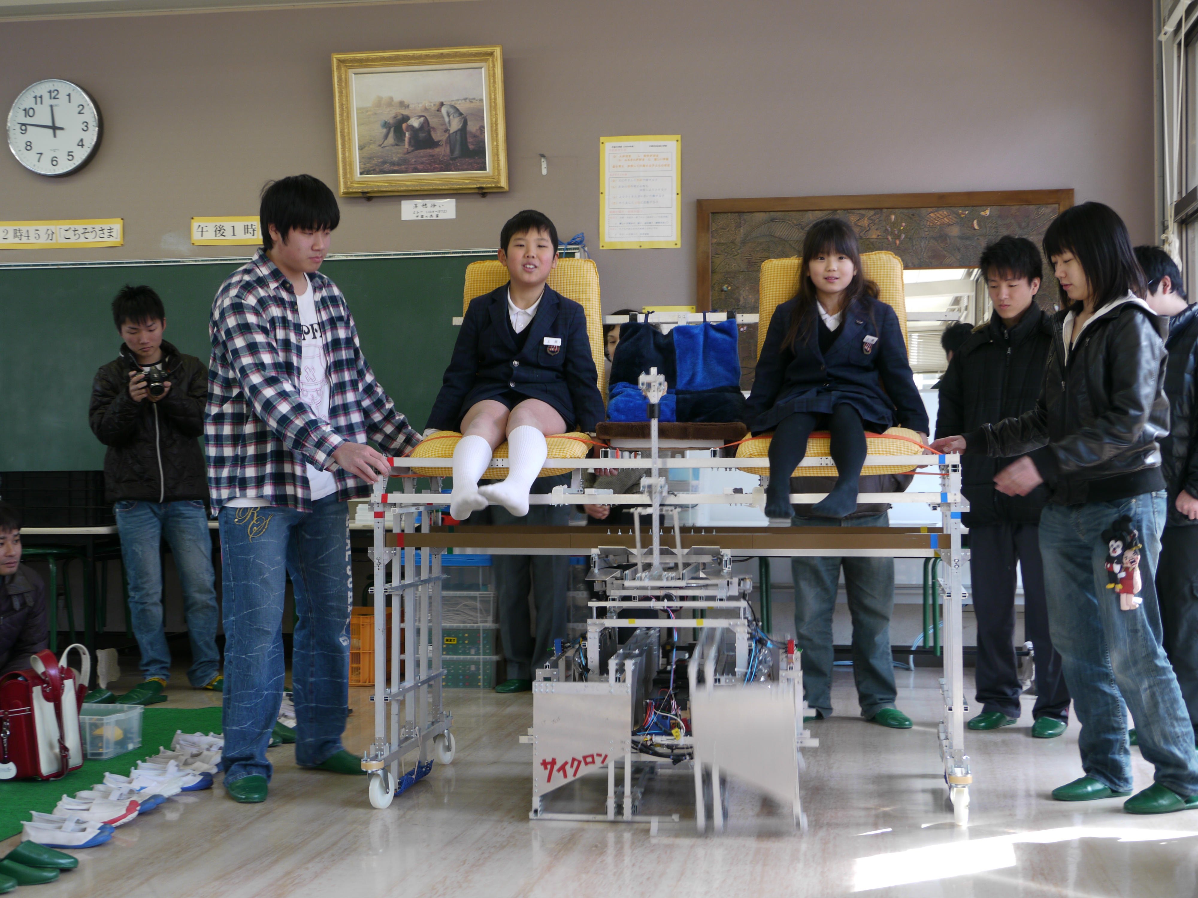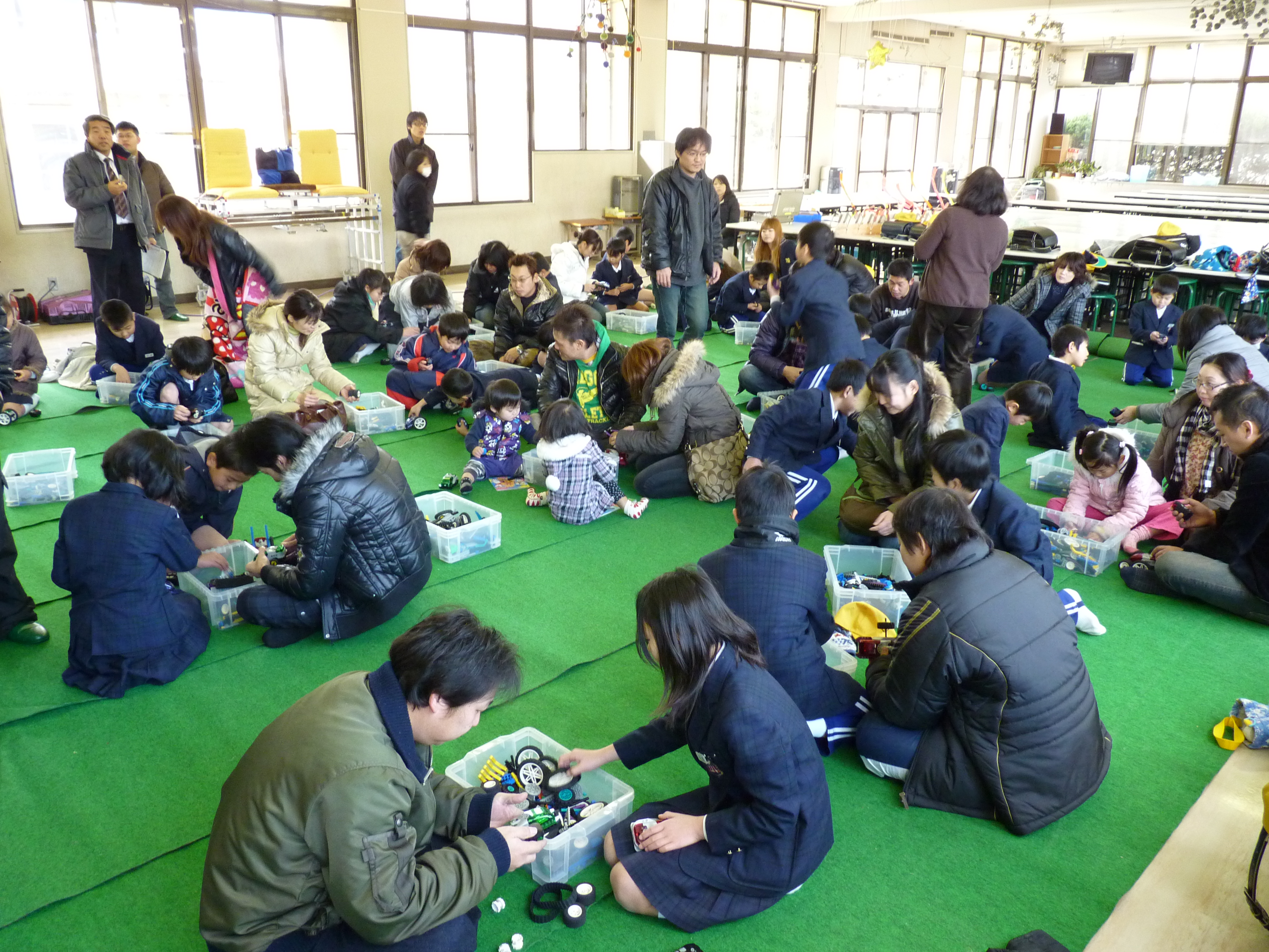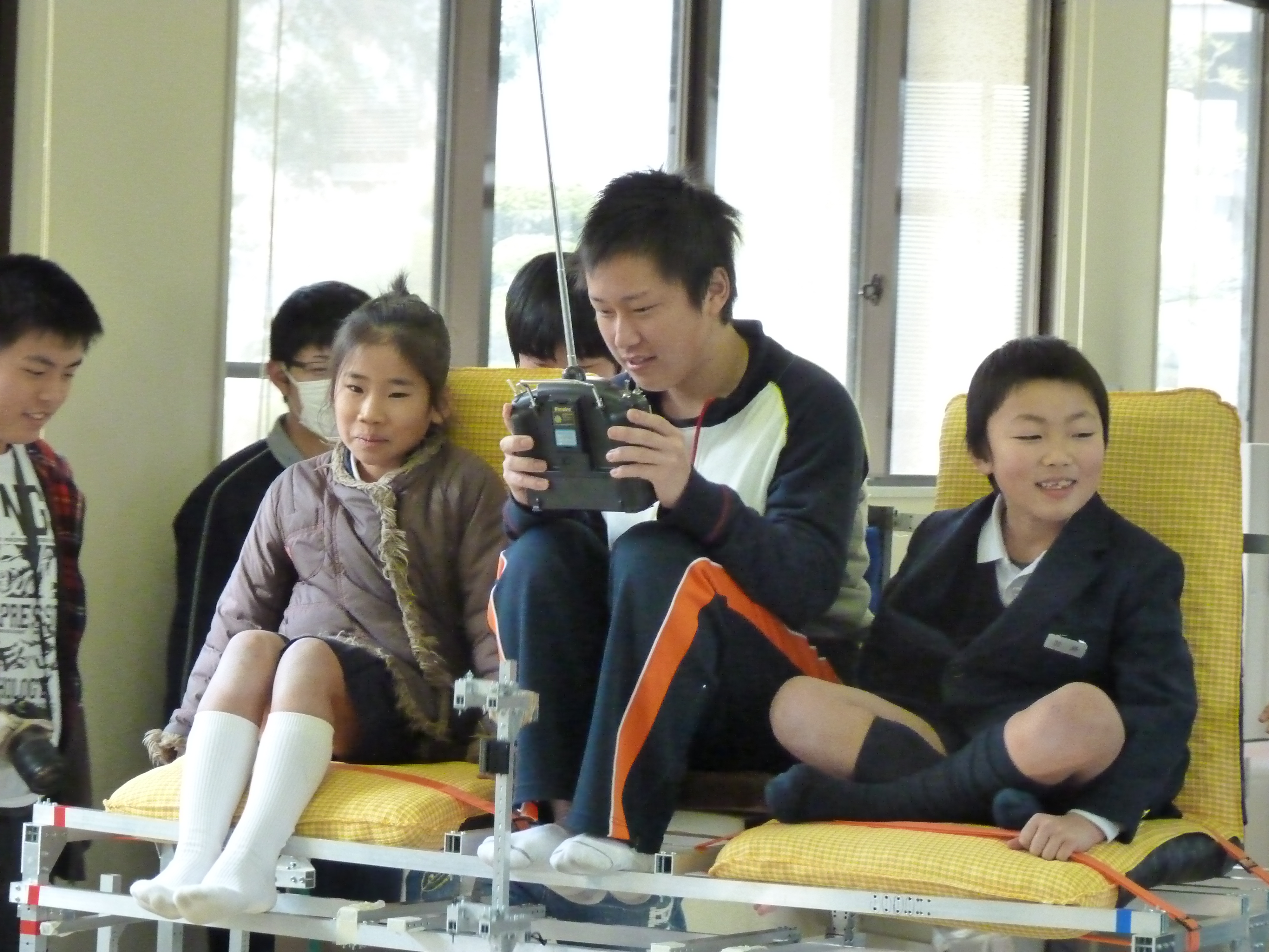この日は日曜日とあって、子供達だけではなく、たくさんの保護者の方々にも参加いただく事ができ、親子で工夫し、意見交換をしながら楽しそうにロボットを組み立てる姿が見受けられました。また、高専ロボコン2010でベスト4になったロボット「Cyclone(サイクロン)」のロボット実演では、特設した操縦席に子供達を乗せて動かし、操縦者の気分を体験してもらいました。子供達はダイナミックに動くロボットの音や動きに大喜びでした。