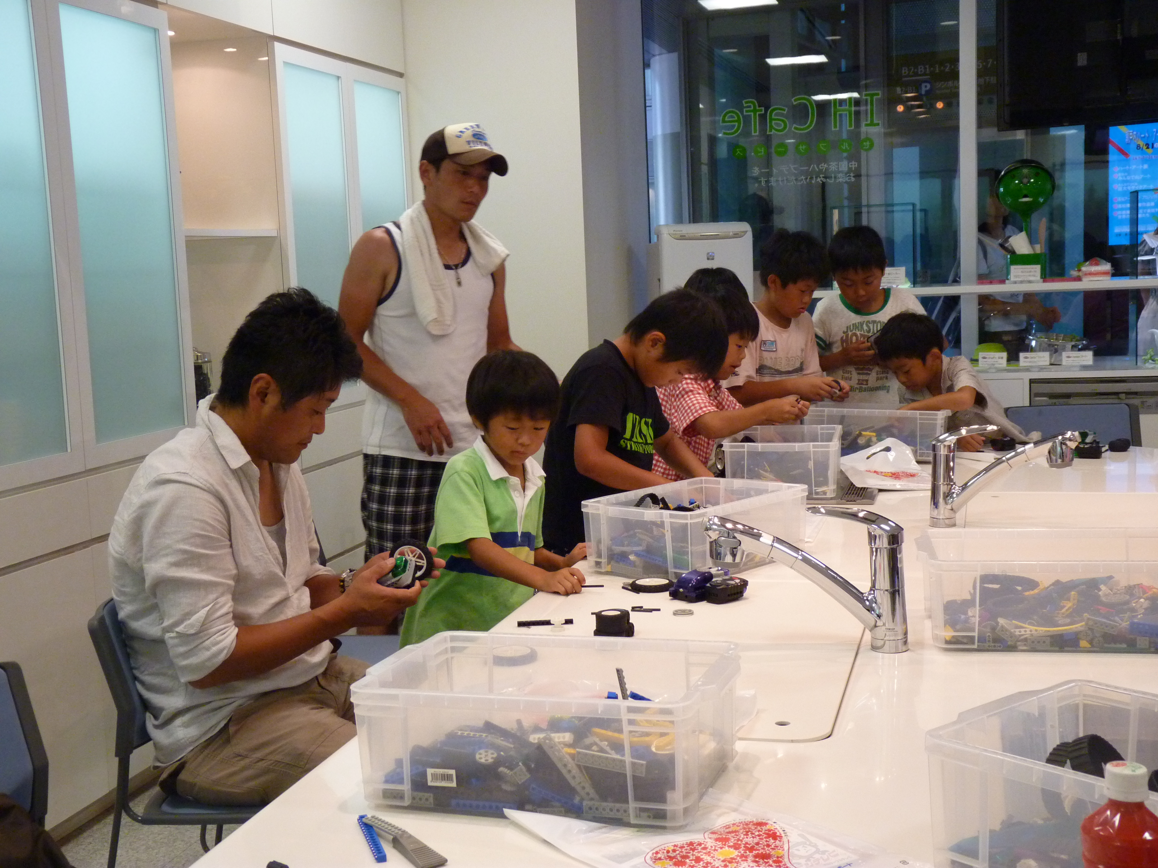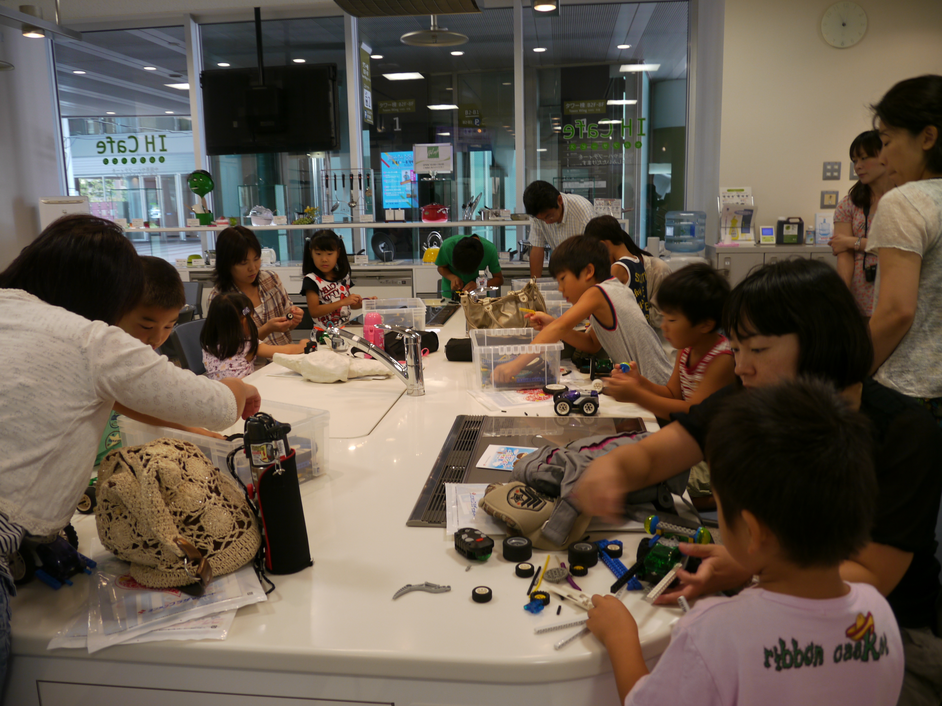 夏休みも終盤に差し掛かったこの日、サンポート高松のヨンデンプラザにて「簡単ロボット教室」が開催されました。先着順に受付との事もあり、当日は開始2時間前の午前8時過ぎから参加希望の親子連れが列を作り、午前、午後の部いずれも会場は大盛況となりました。最初にレゴで組み立てるロボットの作り方や作成したロボットで行うゲームの説明を受け、実際にロボットを作り始めると、子供達はすぐに夢中であれこれ部品を組み合わせ、思い思いのロボットを完成させて動かしていました。