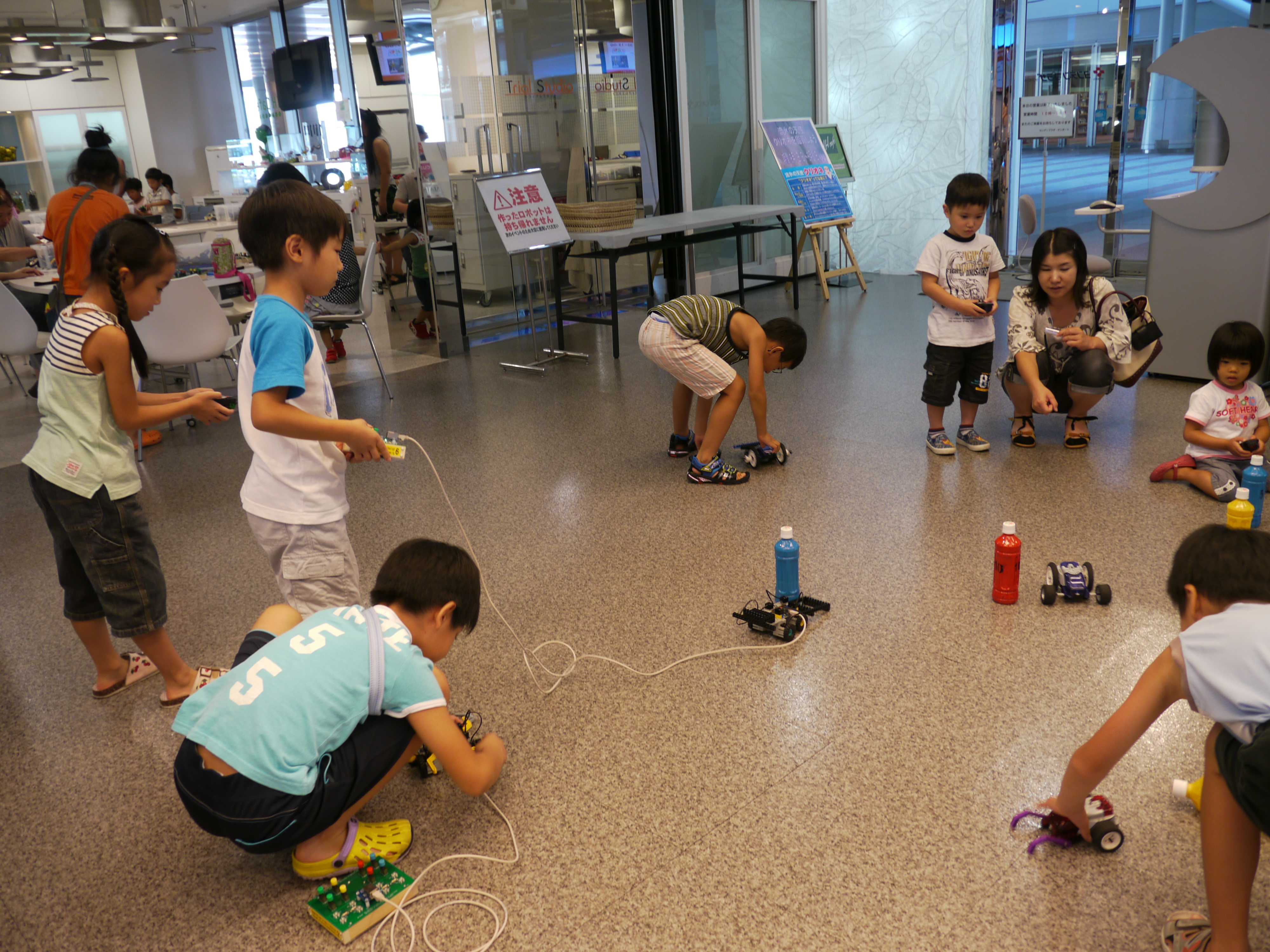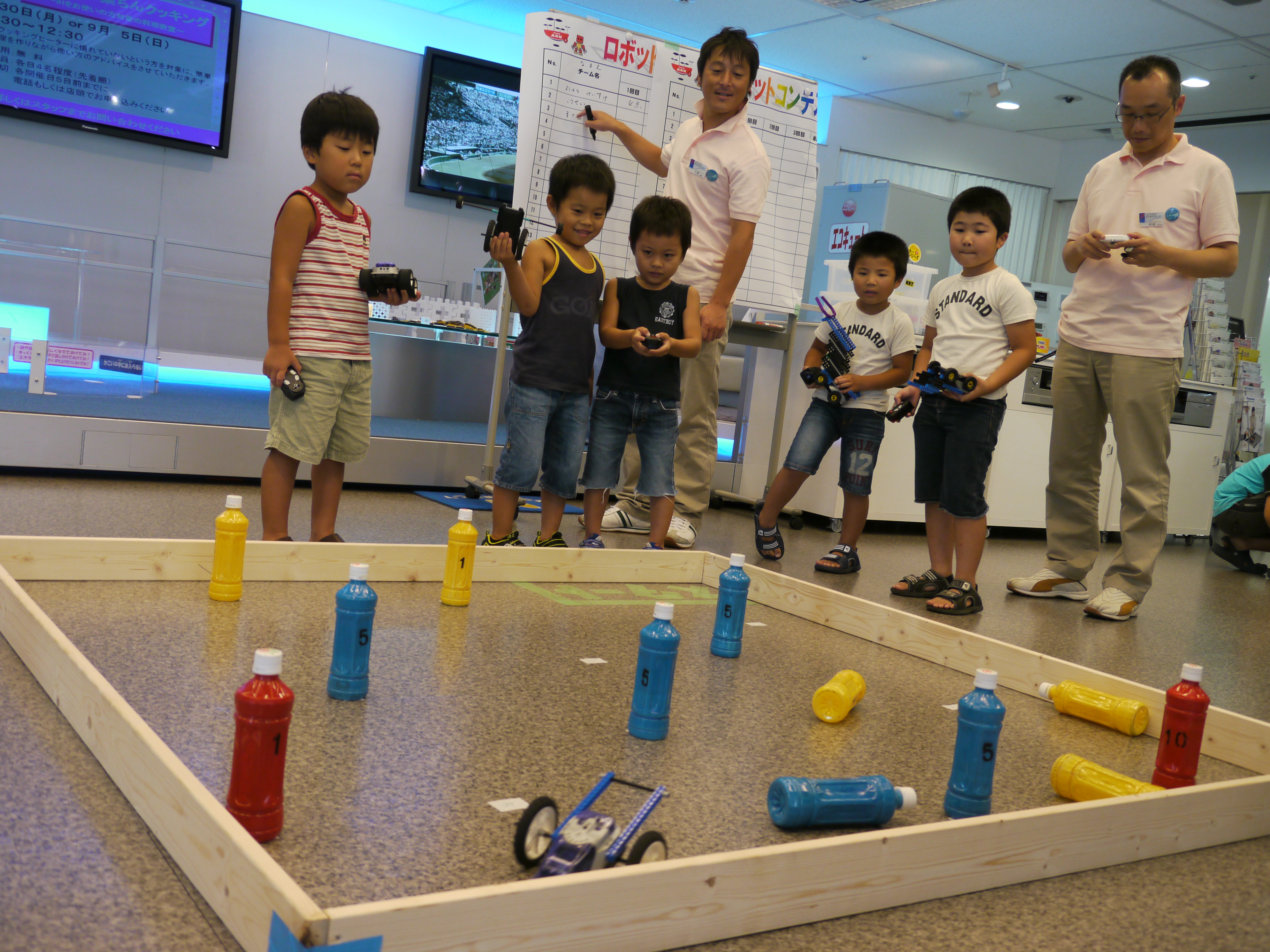後半に行われたゲームはフィールドの中に配置された得点のついたペットボトルを1分間に何点分倒せるかを競うもので、子供達は次々とチャレンジしたり、他の子のロボットの動きを観察したり・・・。中には思うようにロボットが動かず悔し涙を流す子、スタートした途端にロボットが壊れてしまい大爆笑する子、様々でした。そばで見守る保護者の方も思わず応援に熱が入り、声援を送る様子が印象的でした。ゲームで高得点が出た子はヨンデンプラザの方からサプライズで賞品がいただけ、大満足の様子でした。