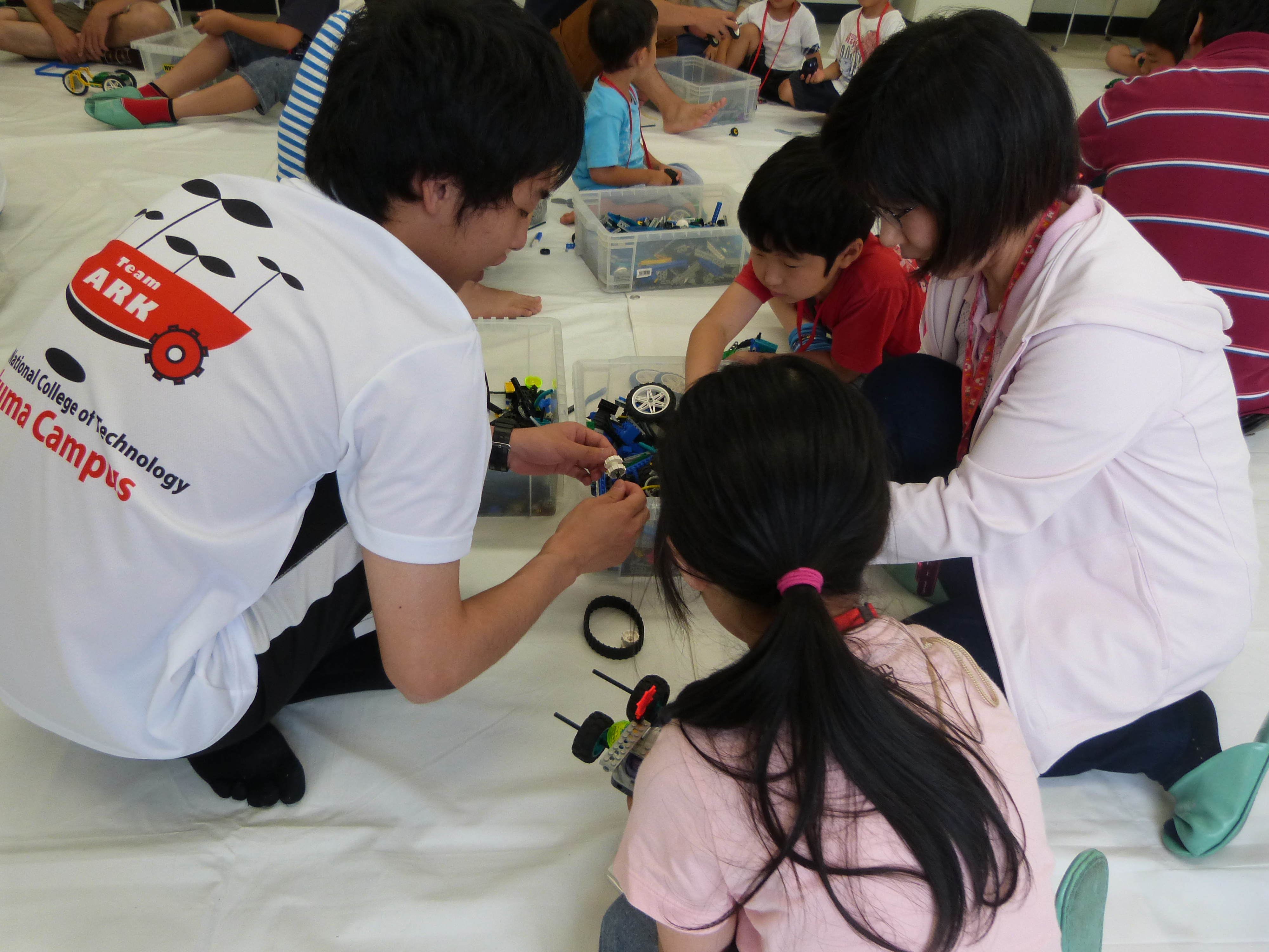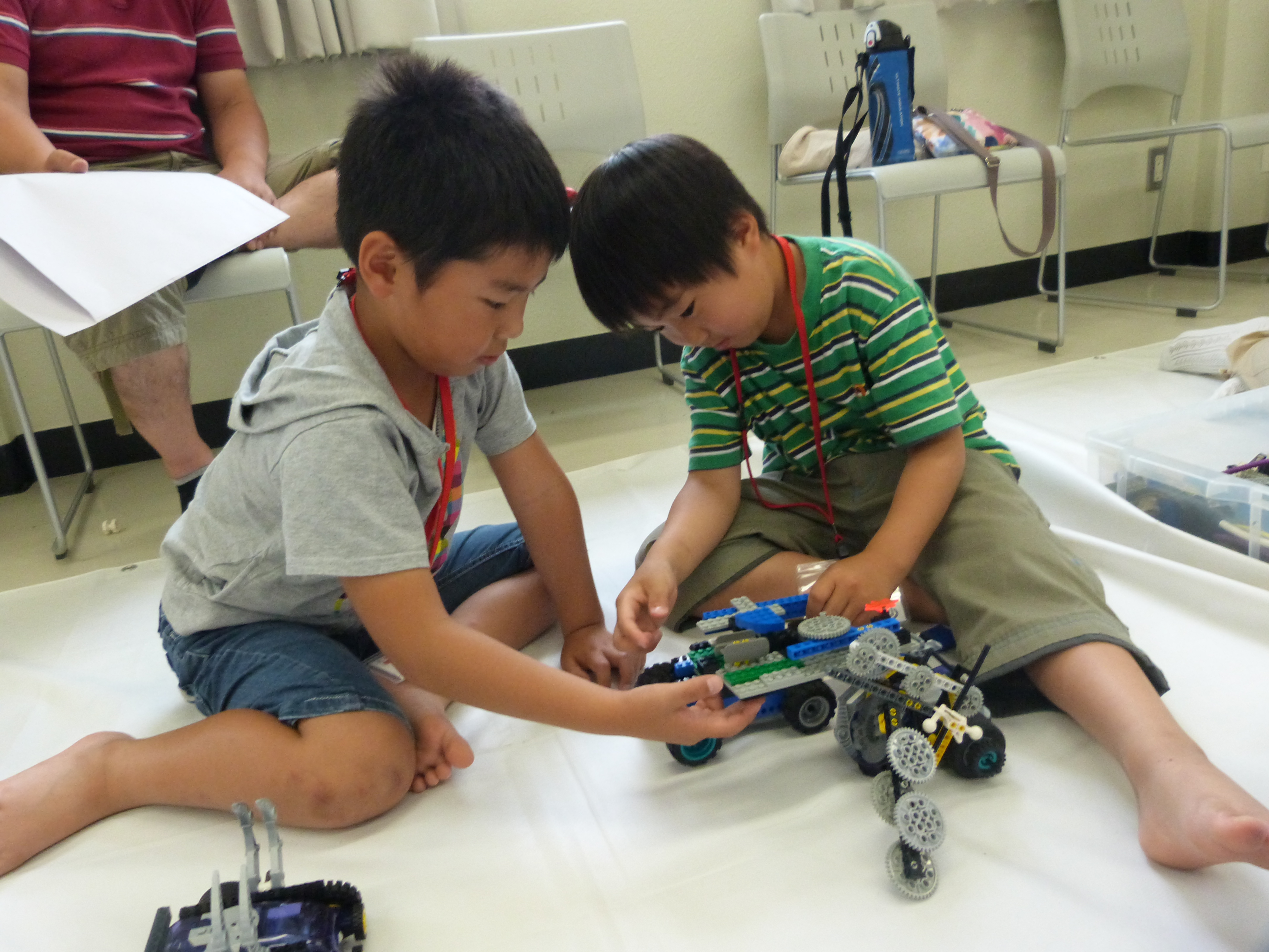 「簡単ロボット教室」では、小さいお子さんでも手軽に組み立てができるレゴブロックを使用したレゴスパイボットによるロボット作りを体験していただきました。スパイボットにはたくさんの部品があります。その組み合わせによって、いろいろな形や動きのロボットを作ることができ、赤外線リモコンで動かして遊べます。自由な発想と遊びの中で、物事に集中して取り組むことや「ものづくり」の楽しさを体験することができます。