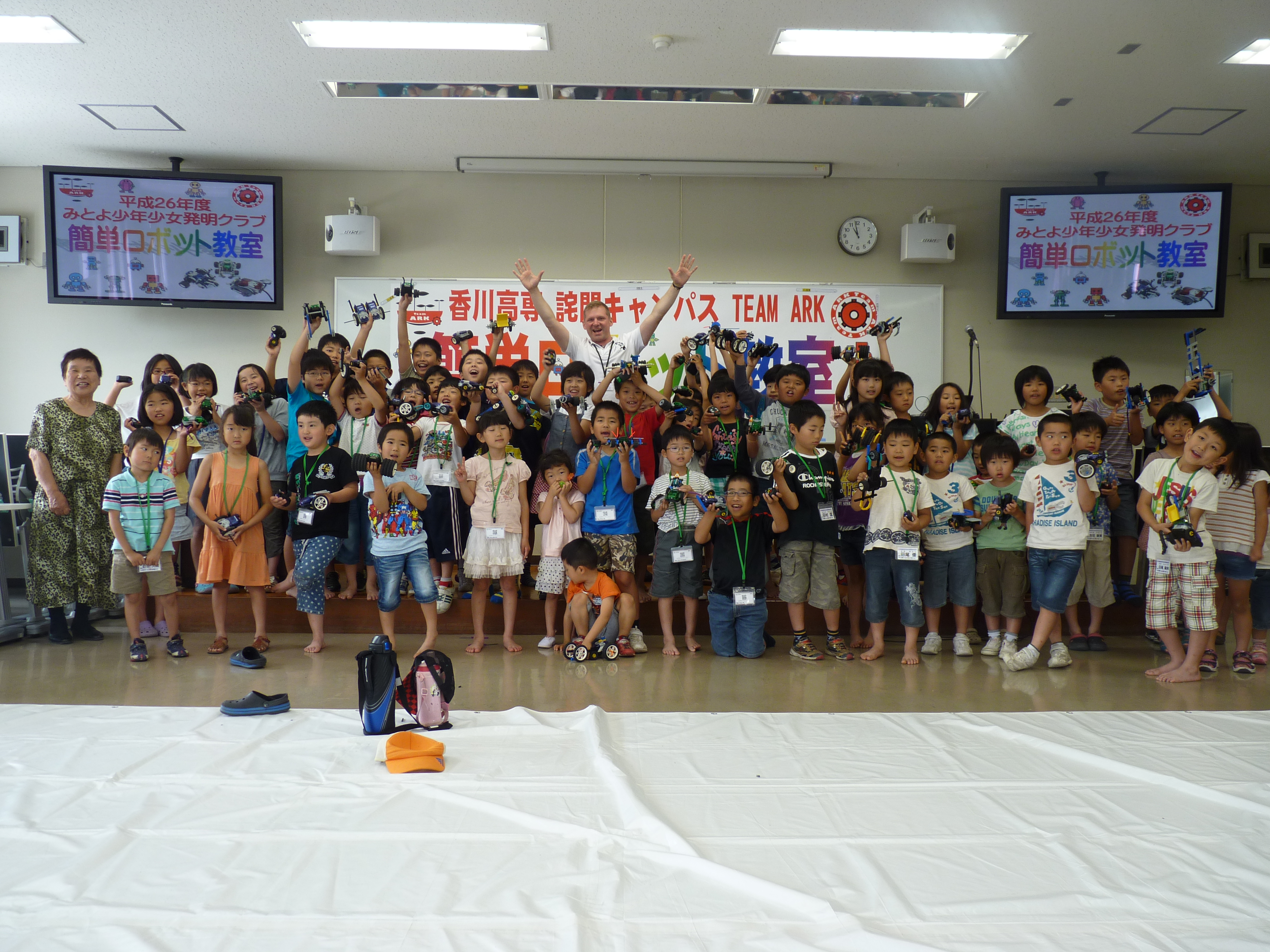 6月14日(土)詫間キャンパスにて三豊市少年少女発明クラブの活動「簡単ロボット教室(2)」を開催しました。「簡単ロボット教室」は発明クラブの活動に協力している詫間キャンパスロボコンチーム「TEAM ARK」が主催している活動です。