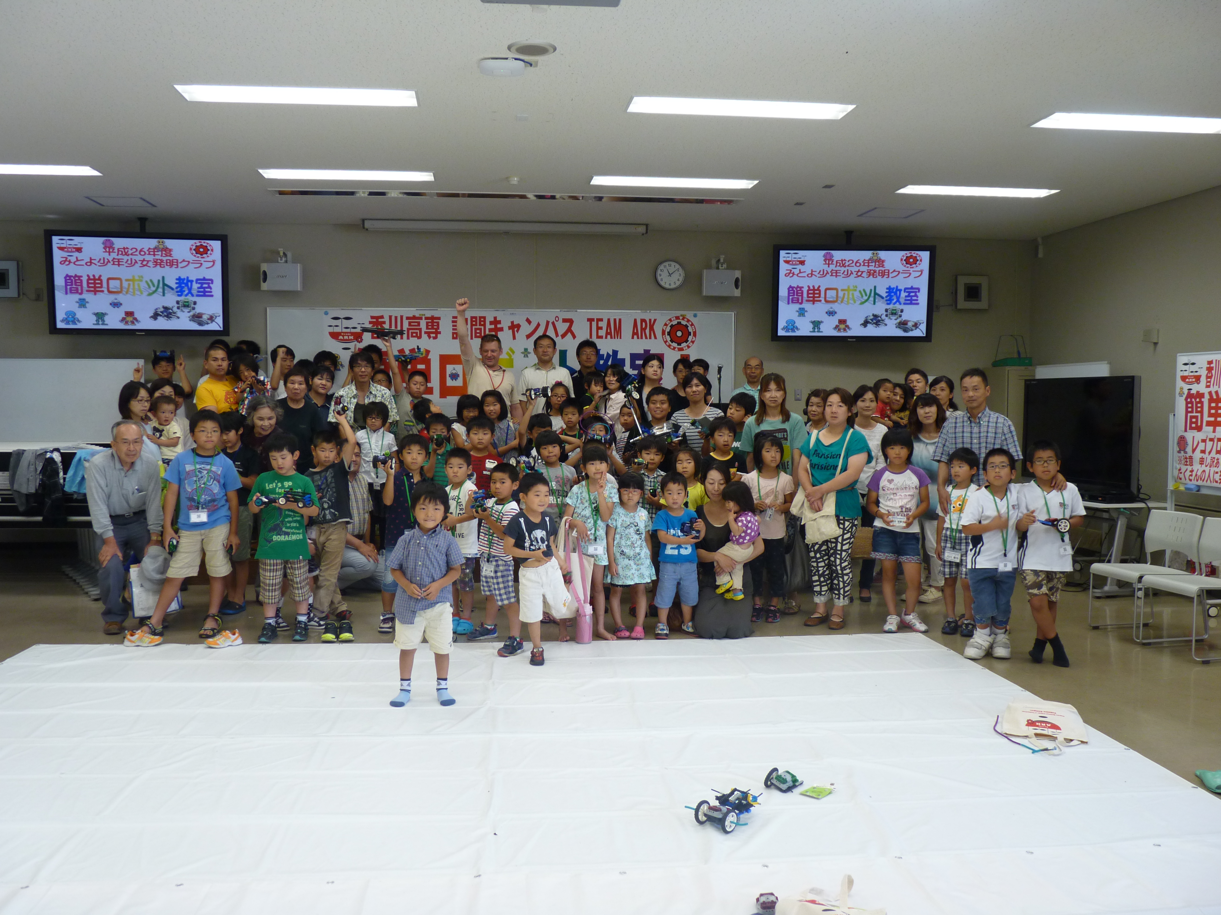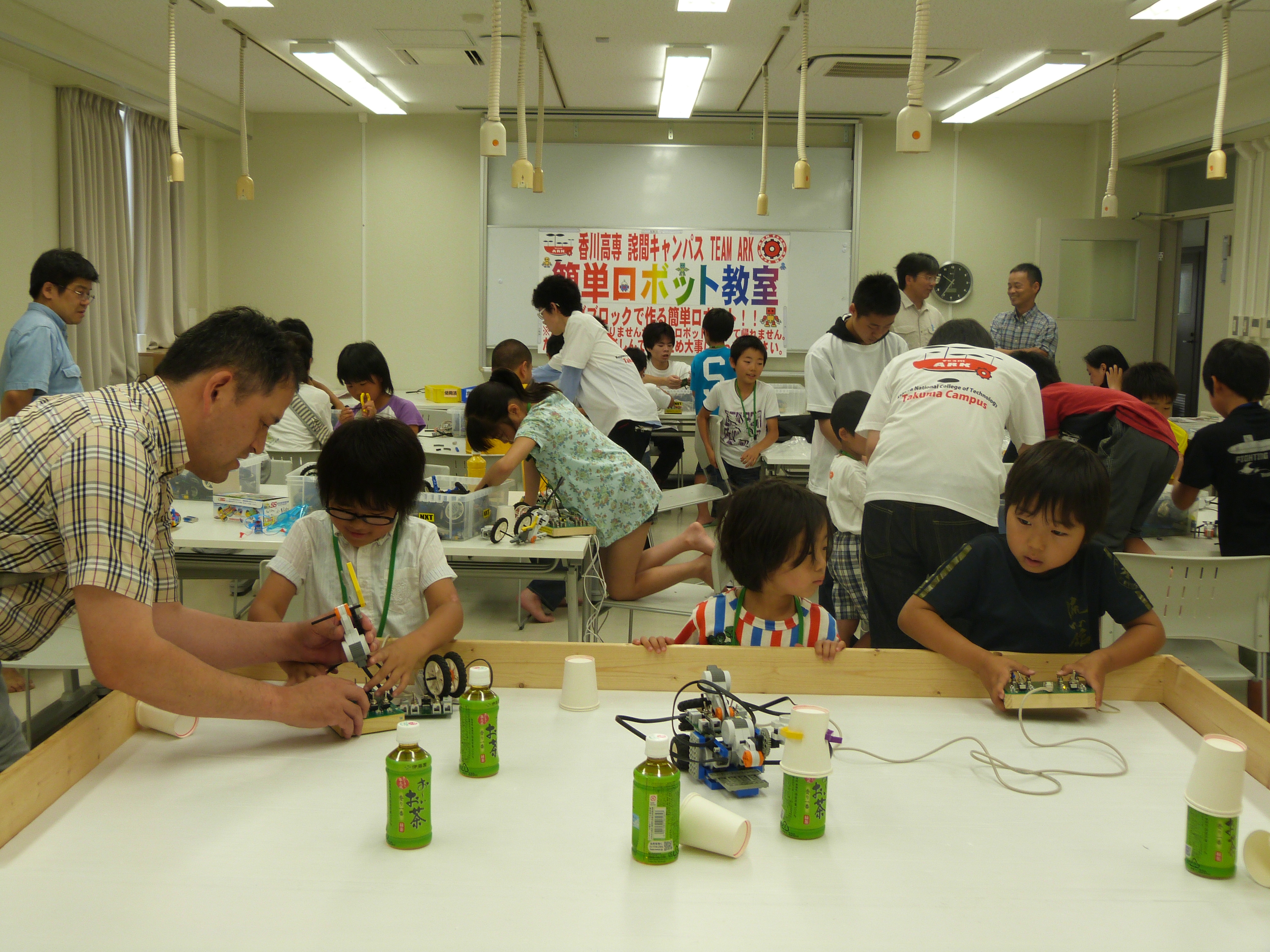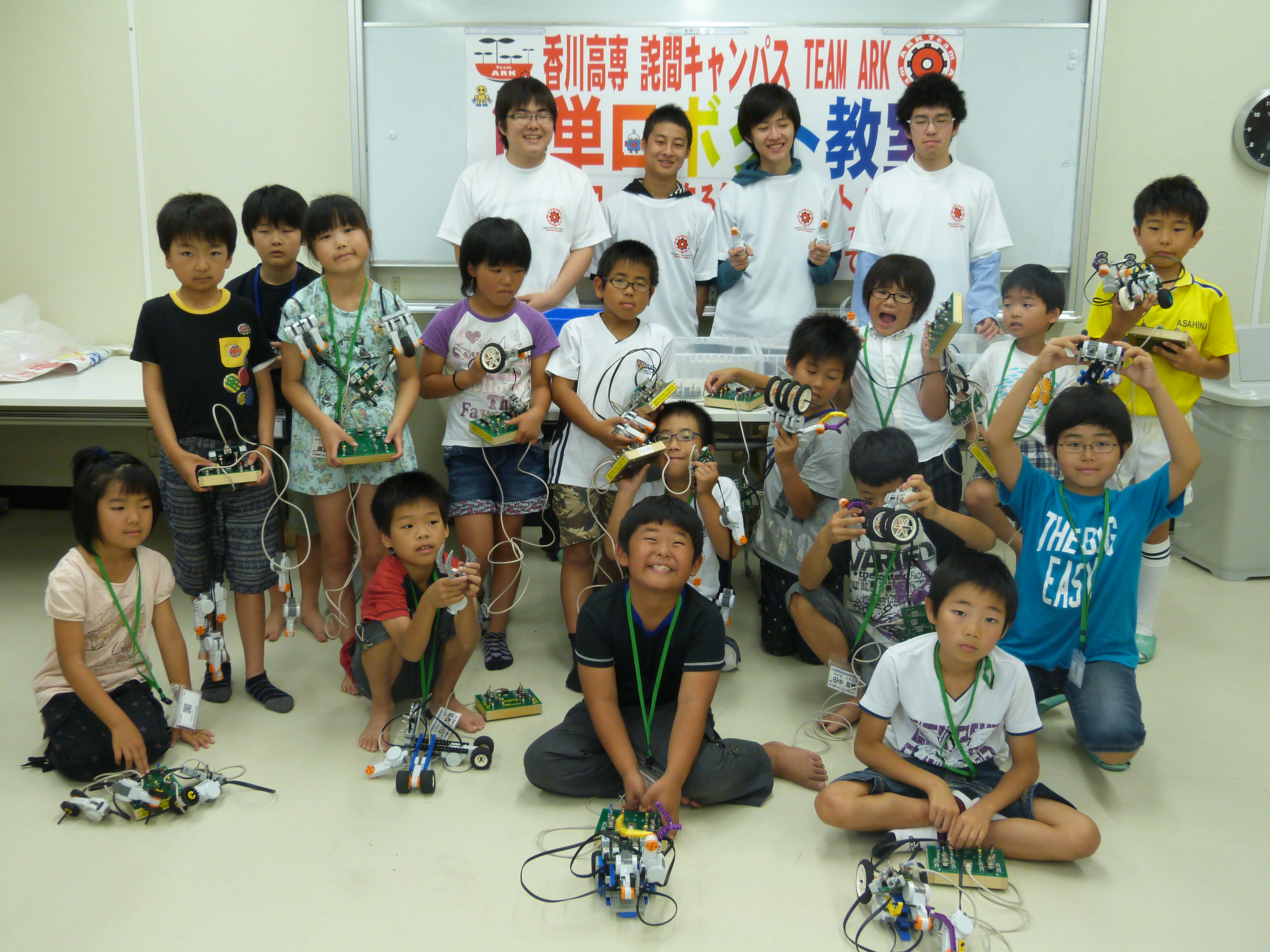 6月28日(土)詫間キャンパスにて三豊市少年少女発明クラブの活動「チャレコン作品作り(1)・簡単ロボット教室(3)」を開催しました。「簡単ロボット教室」は発明クラブの活動に協力している詫間キャンパスロボコンチーム「TEAM ARK」が主催している活動です。