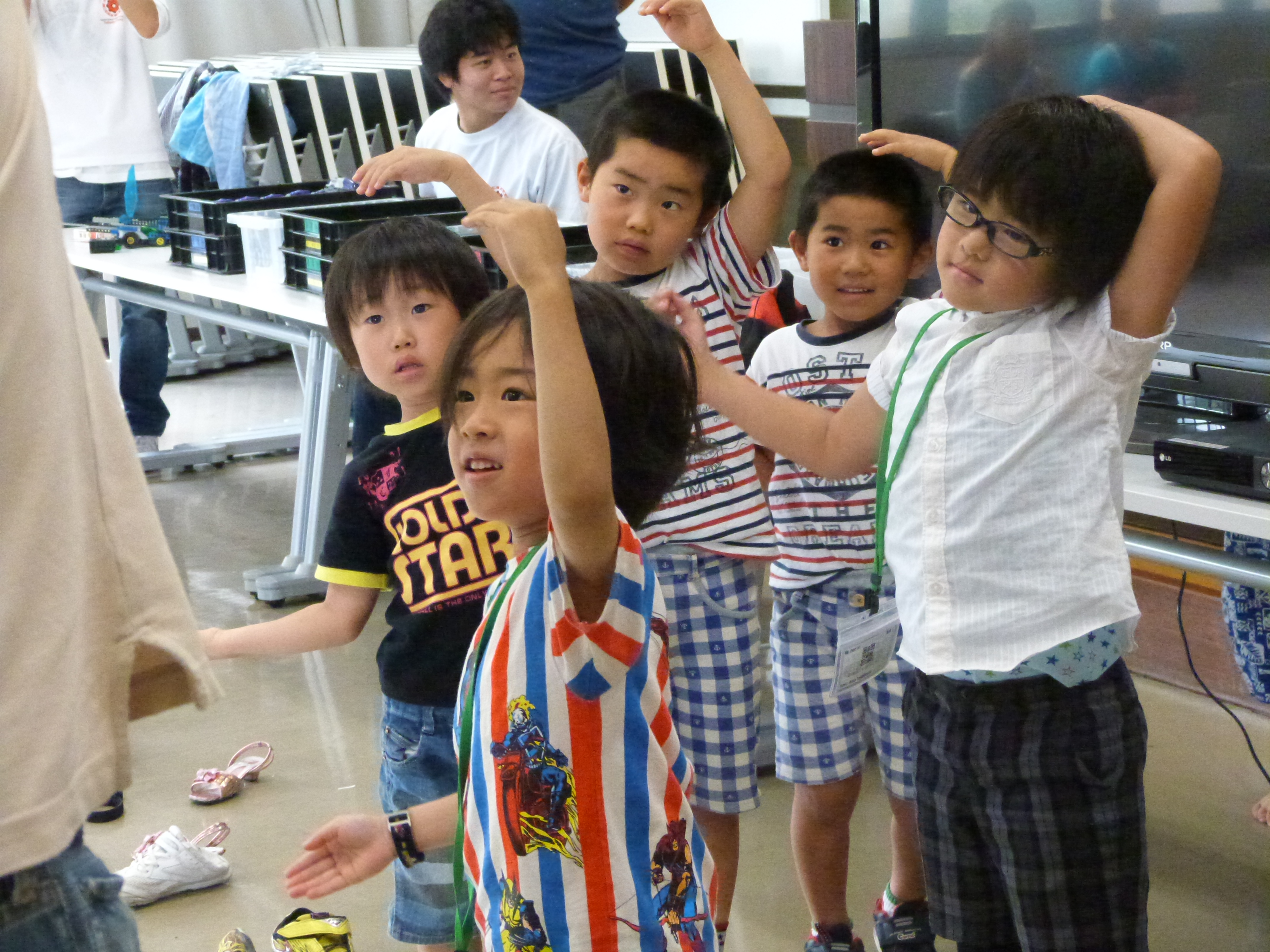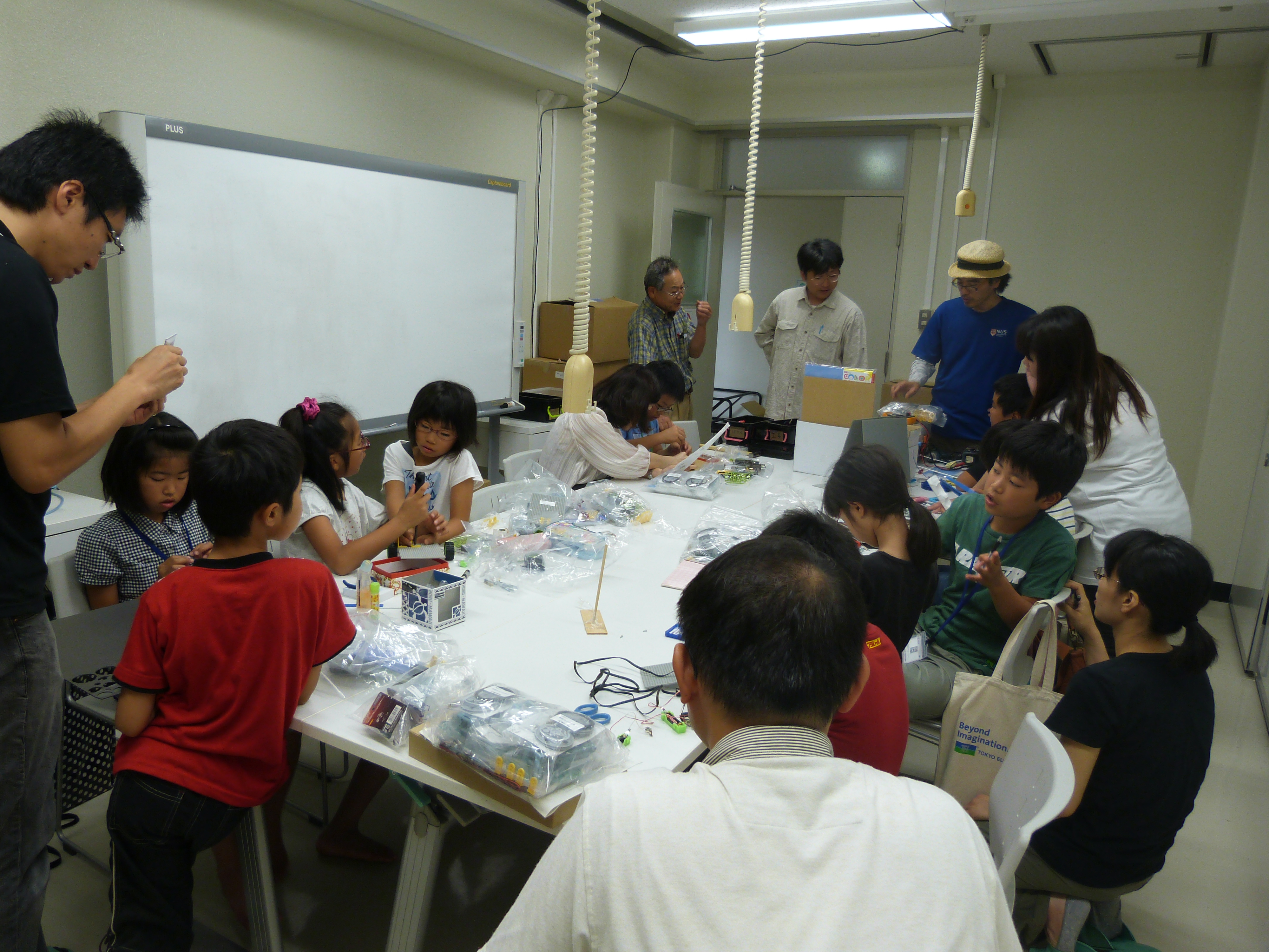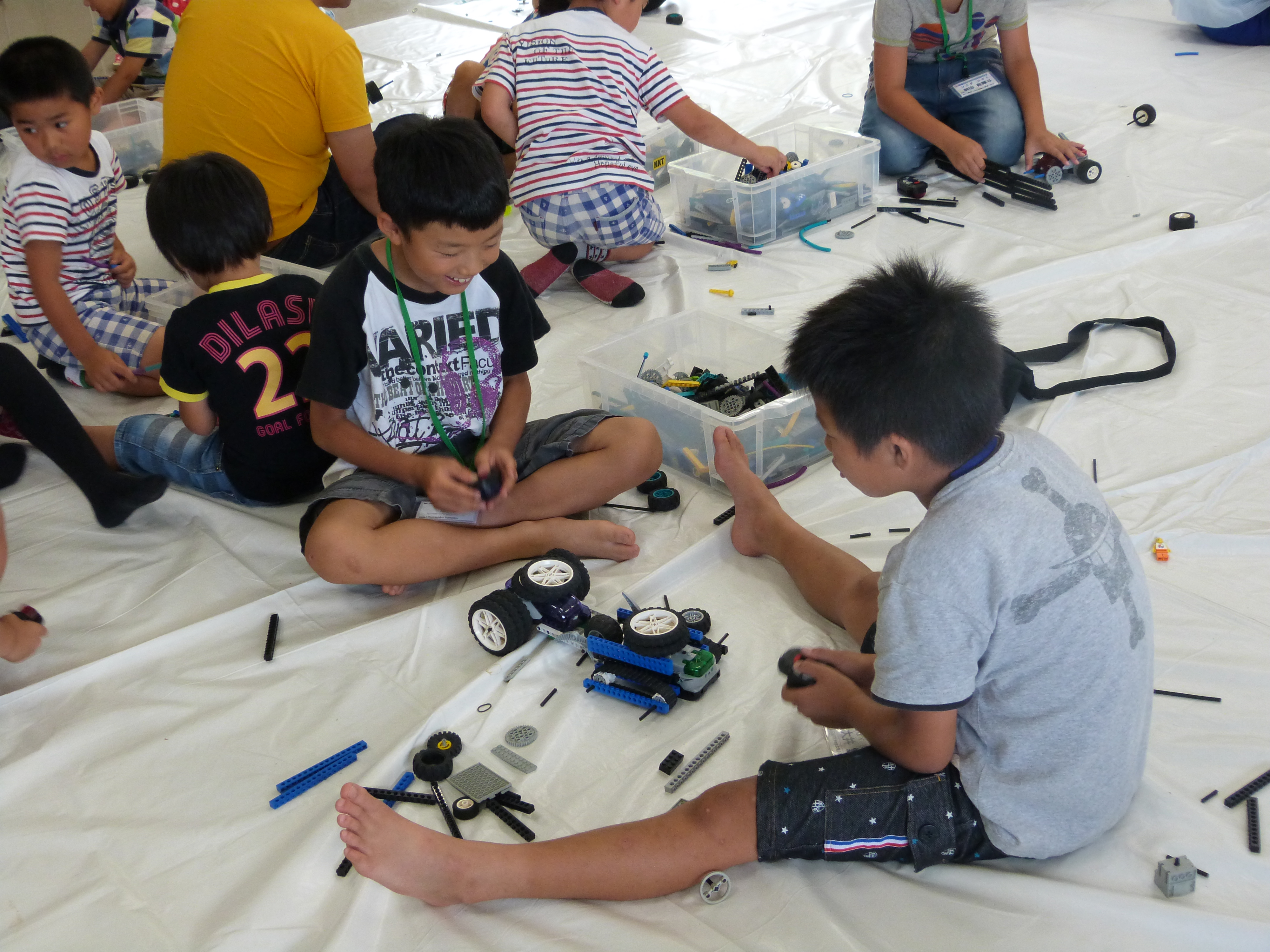 簡単ロボット教室では前回まで2回製作したスパイボットの他、オリジナルリモコンを用いたレゴマインドストームNXTによるロボット製作も行い、子ども達が作ってみたいロボットを選んで取り組みました。オリジナルリモコンクラスではモーターを使用し、「つかむ」、「持ち上げる」などの動作も可能なロボットが製作できます。子ども達はケーブルの接続に苦労をしていた様子でしたが、「TEAM ARK」の学生と一緒に製作し、動かしてみる所まで頑張って作りました。